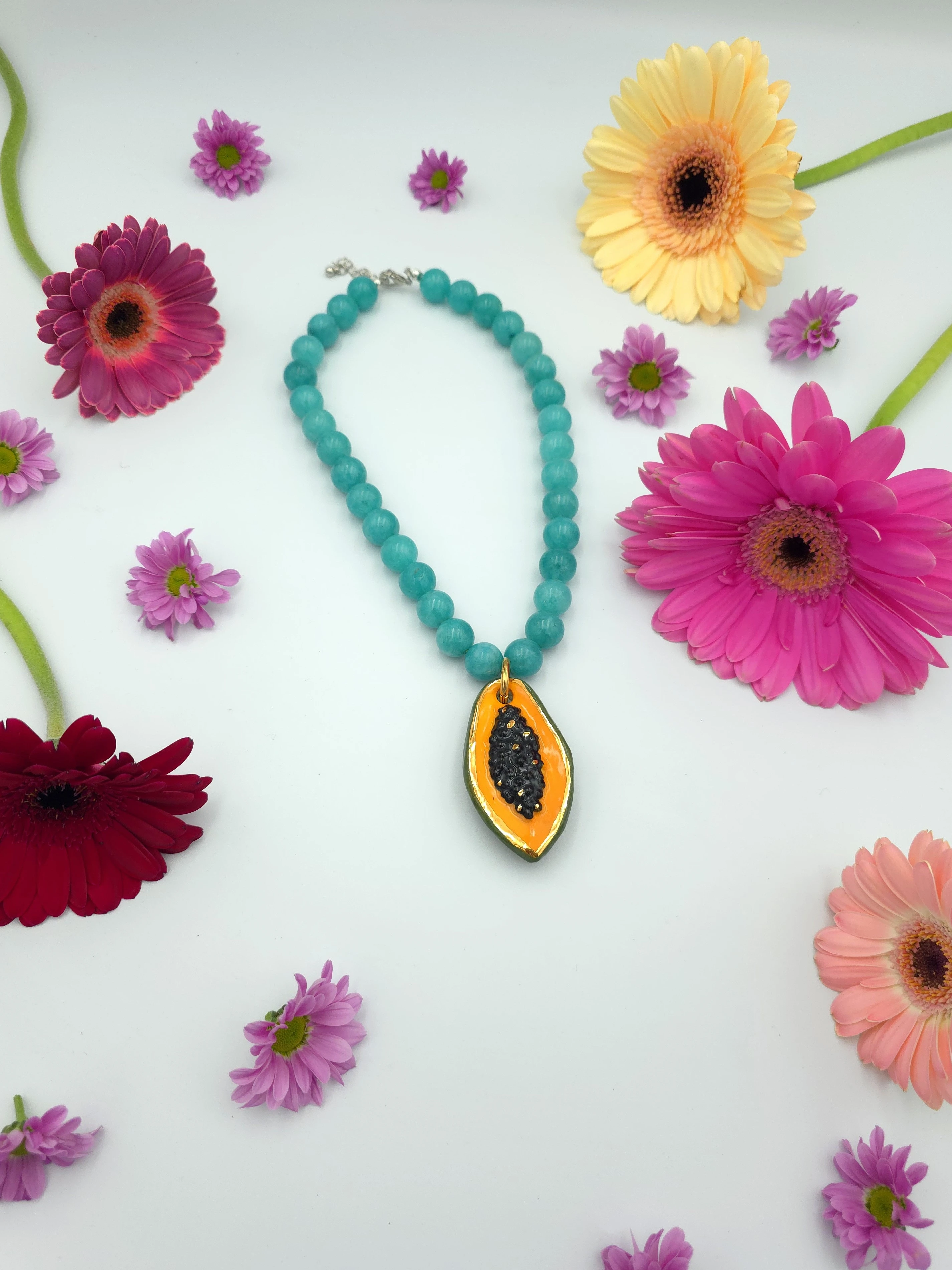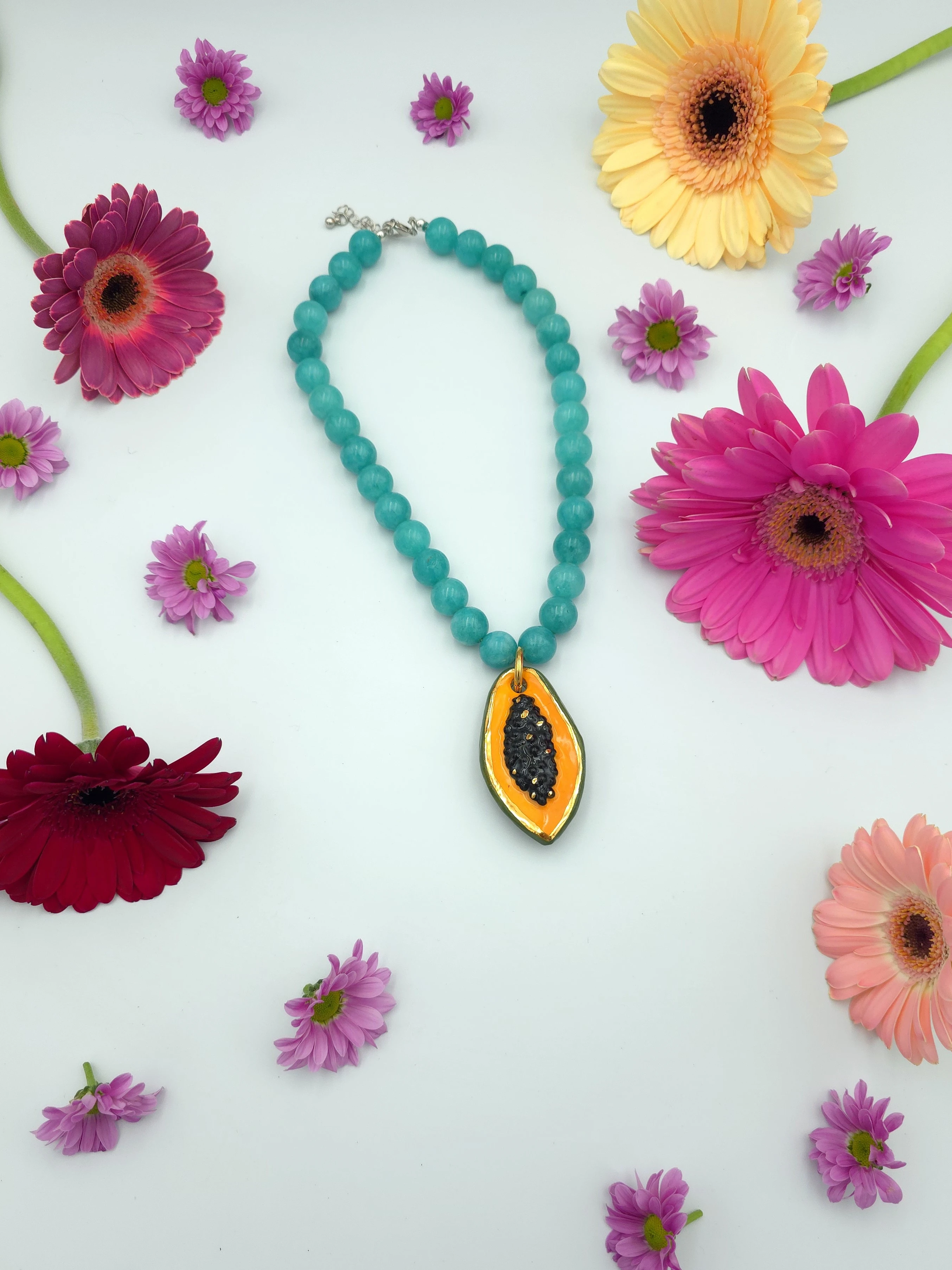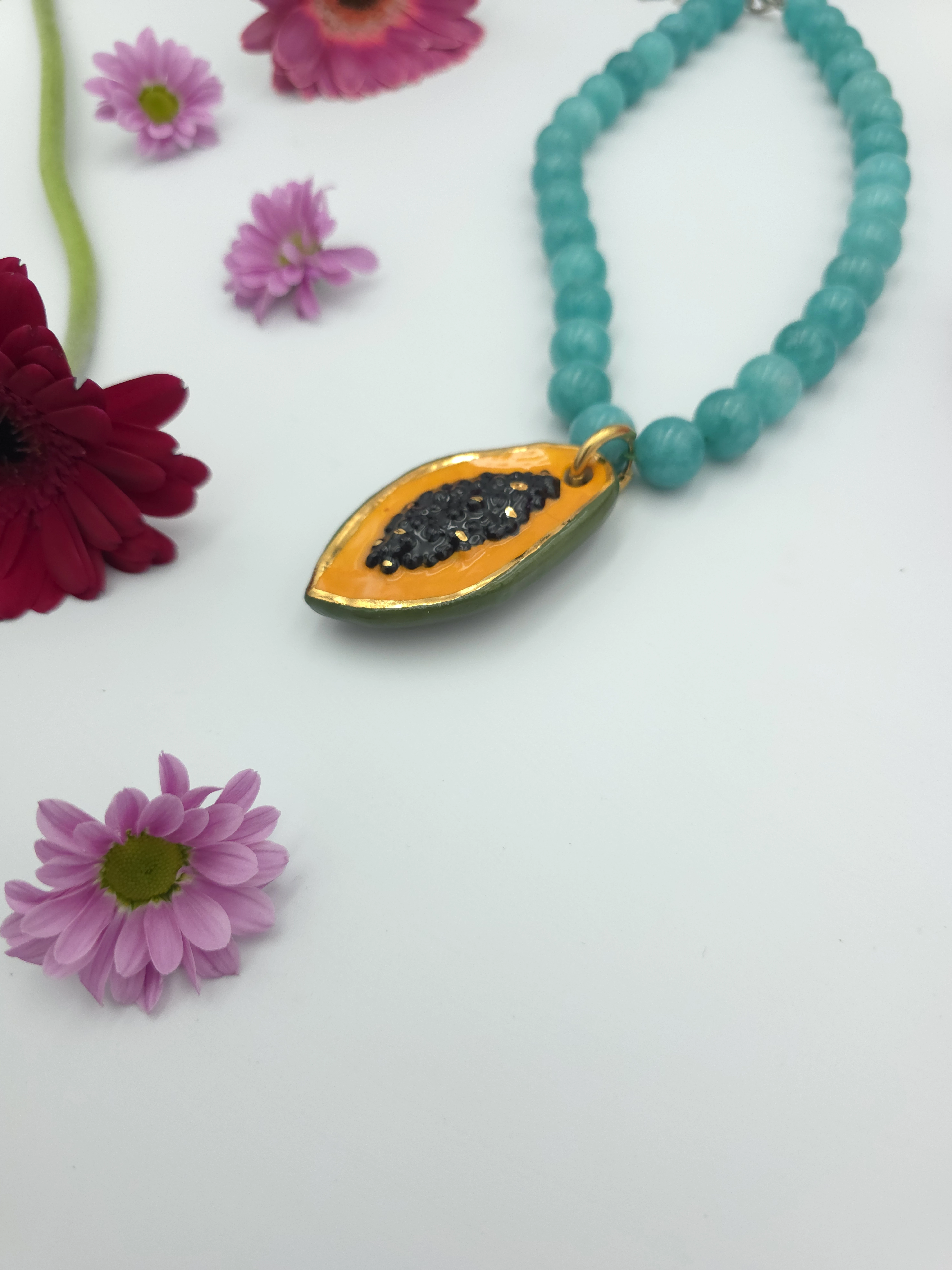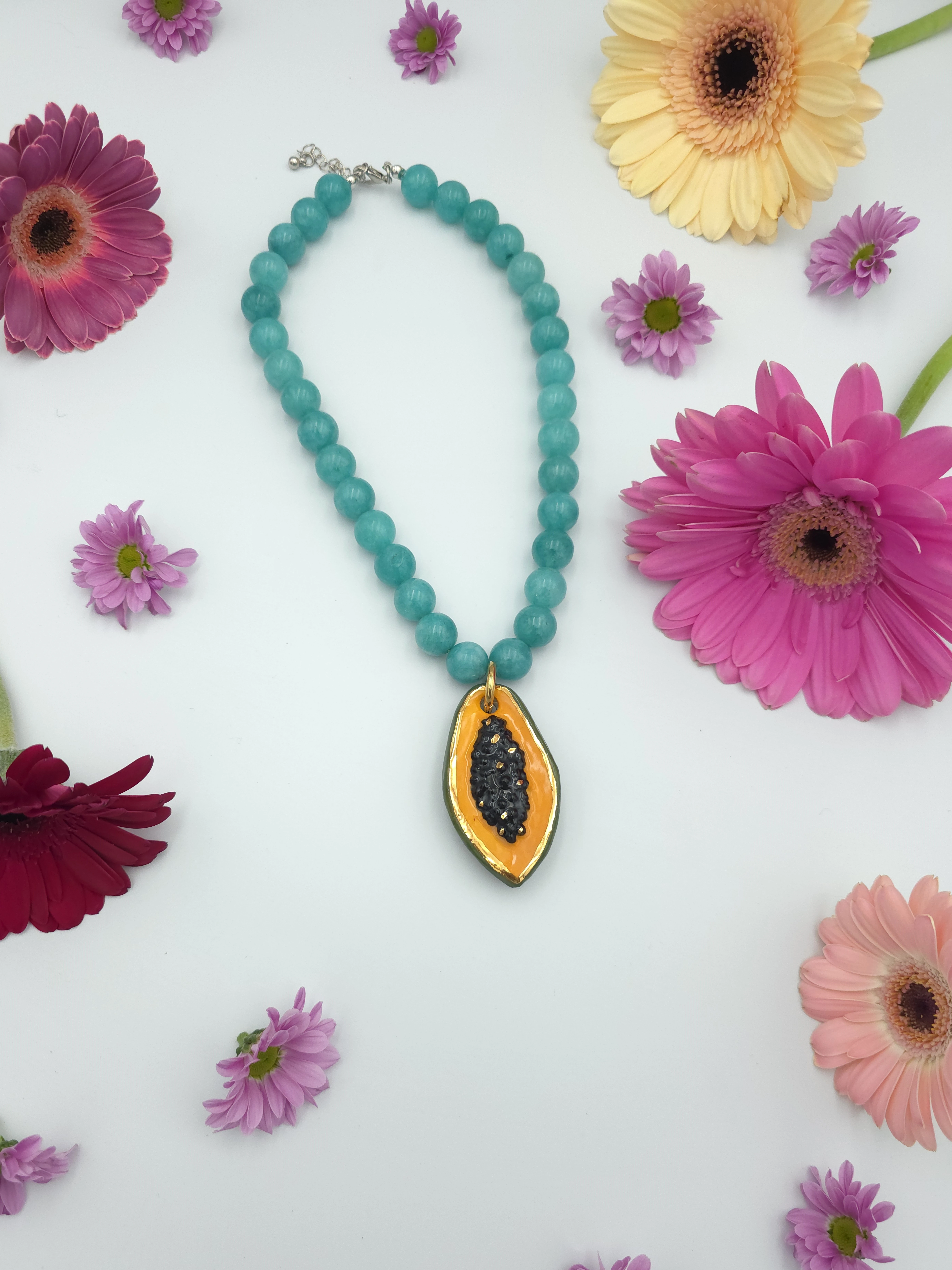 Naszyjnik z turkusowego amazonitu z porcelanową, złoconą papają.