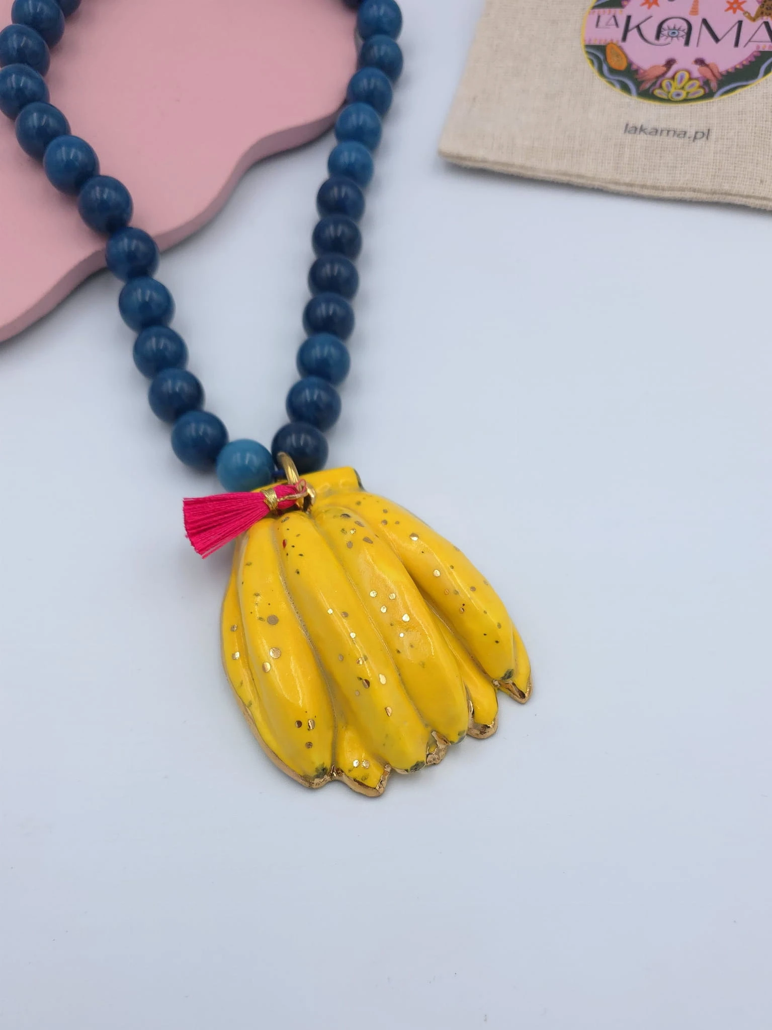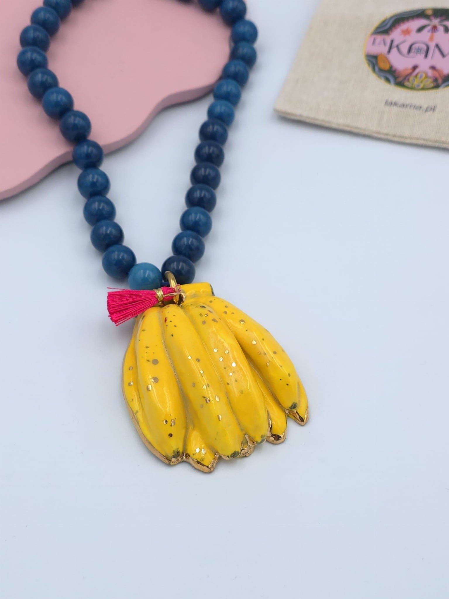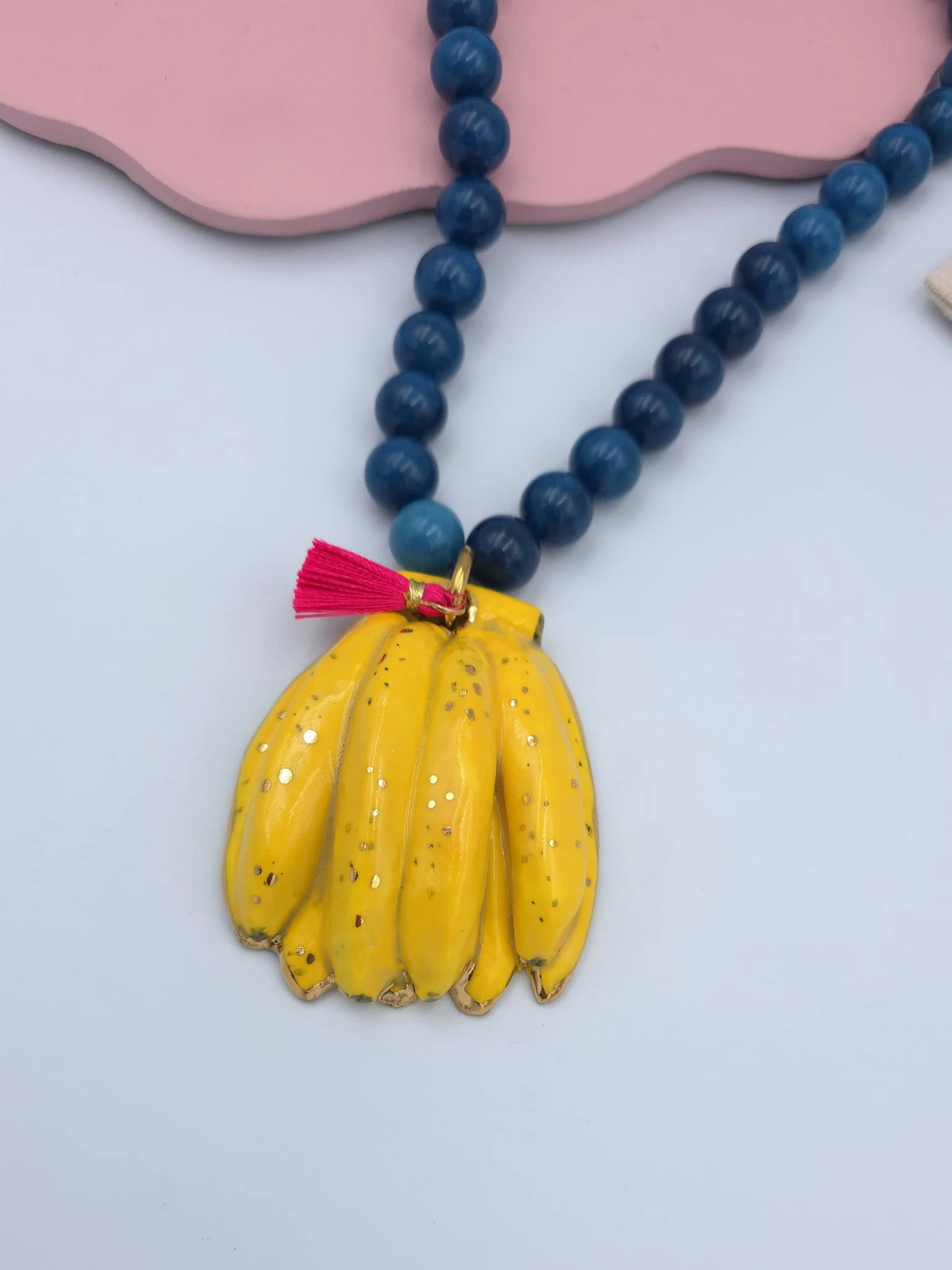 Naszyjnik z niebieskiego apatytu z porcelanowymi, muśniętymi złotem bananami, z różowym chwościkiem.
