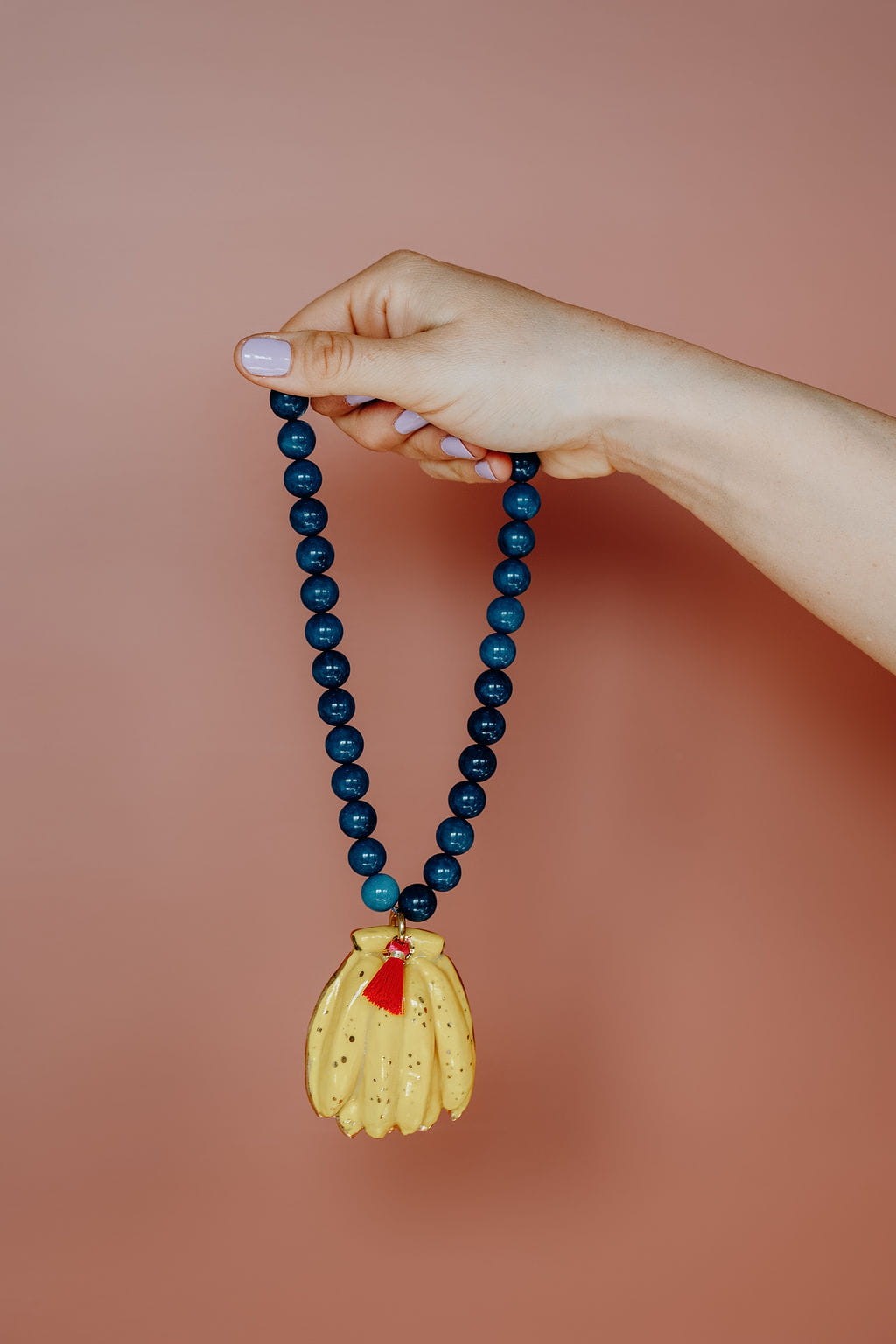 Naszyjnik z niebieskiego apatytu z porcelanowymi bananami, z różowym chwościkiem.