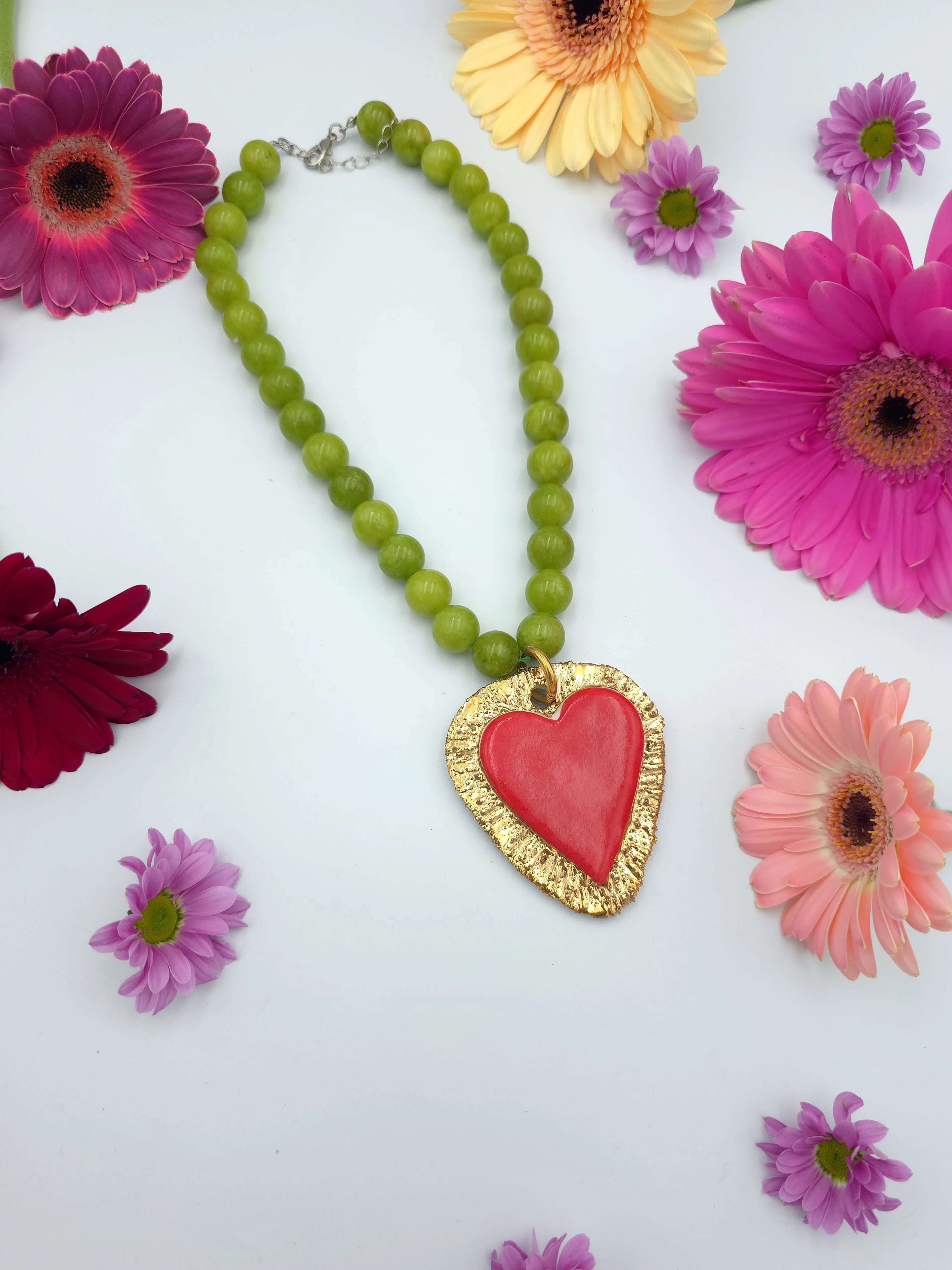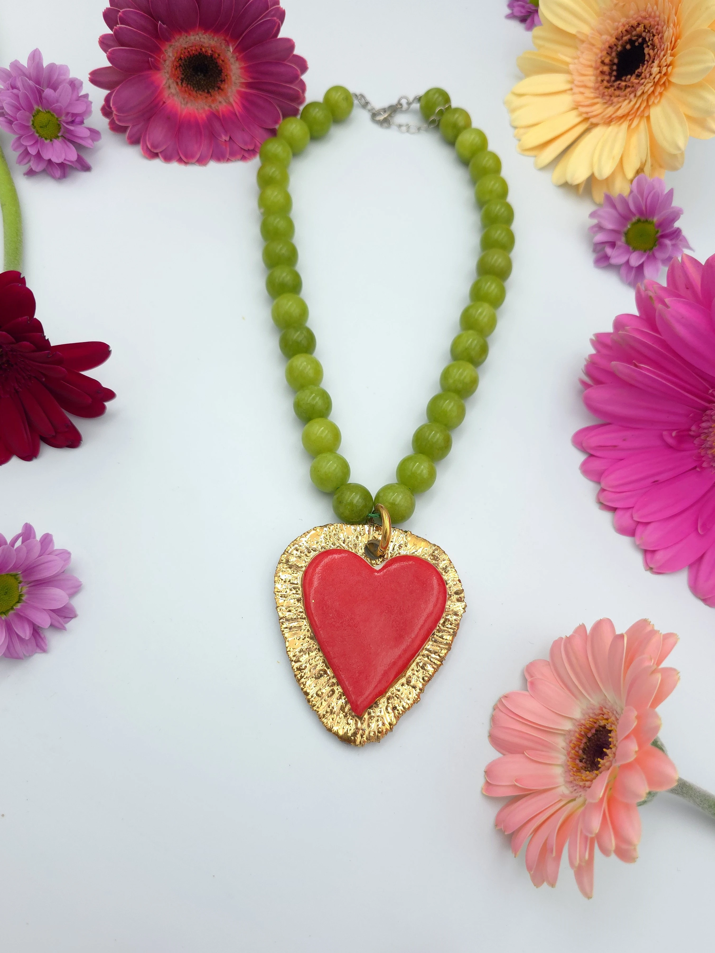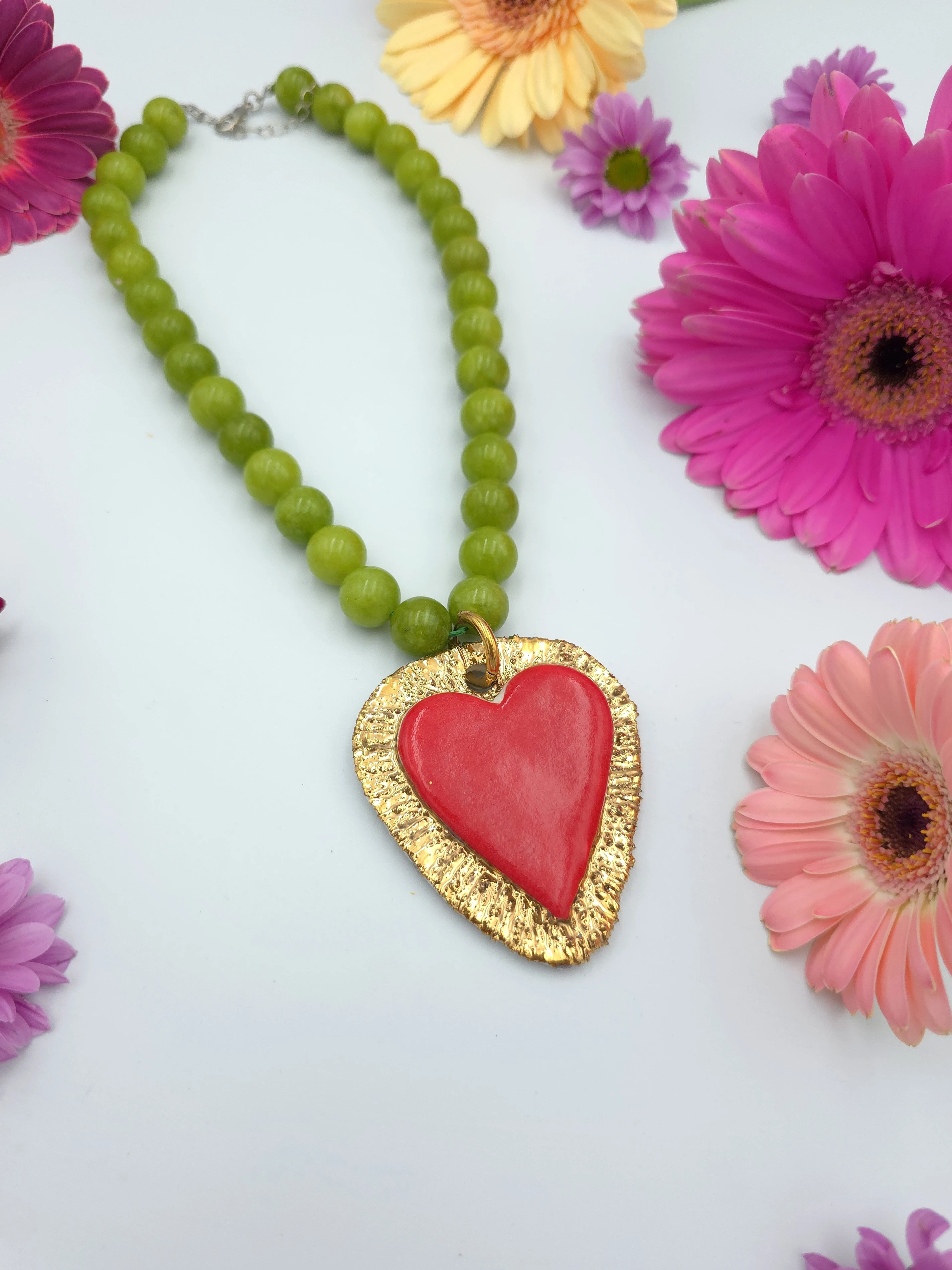 Jadeitowy naszyjnik z porcelanową, złoconą zawieszką.