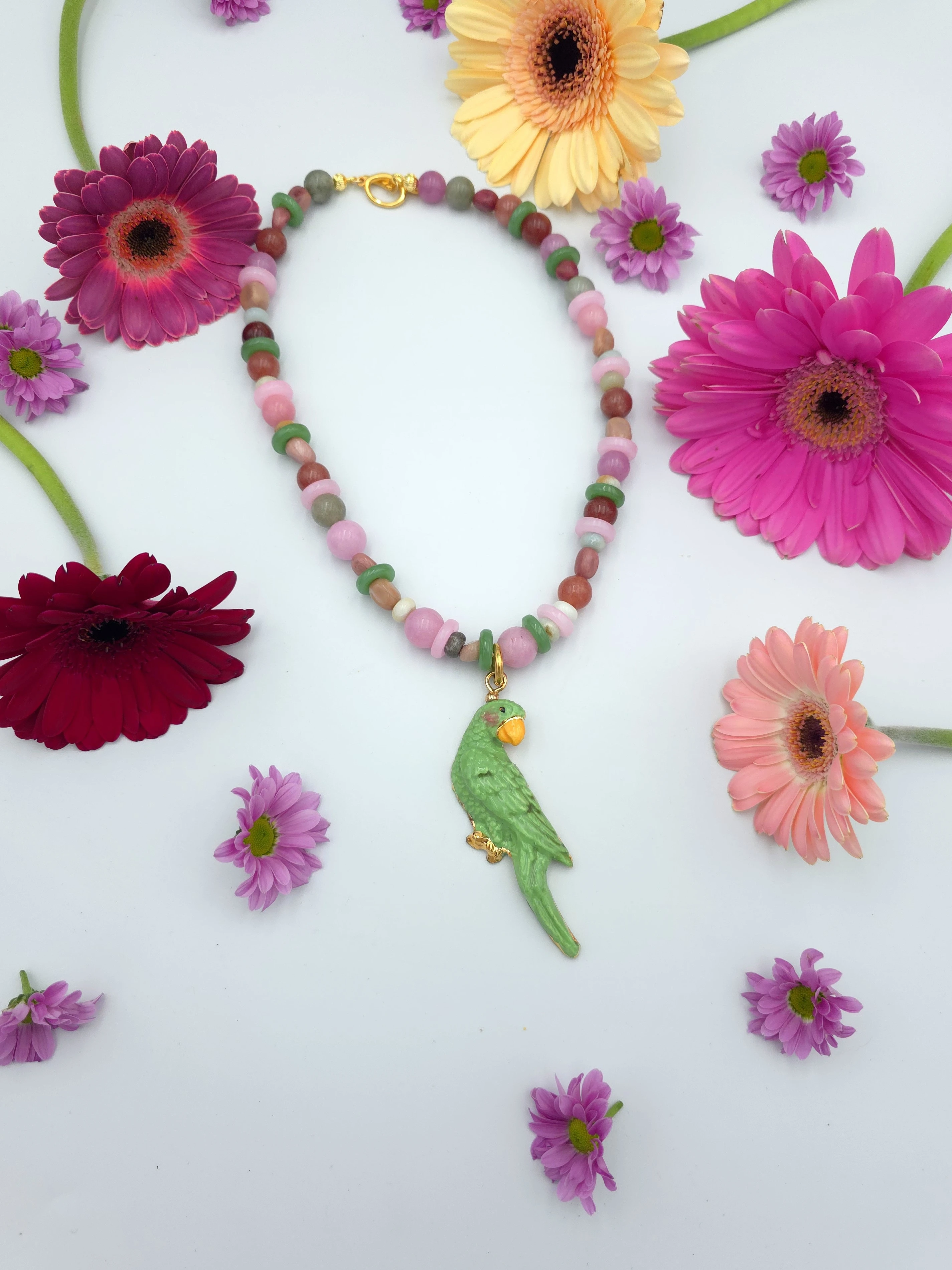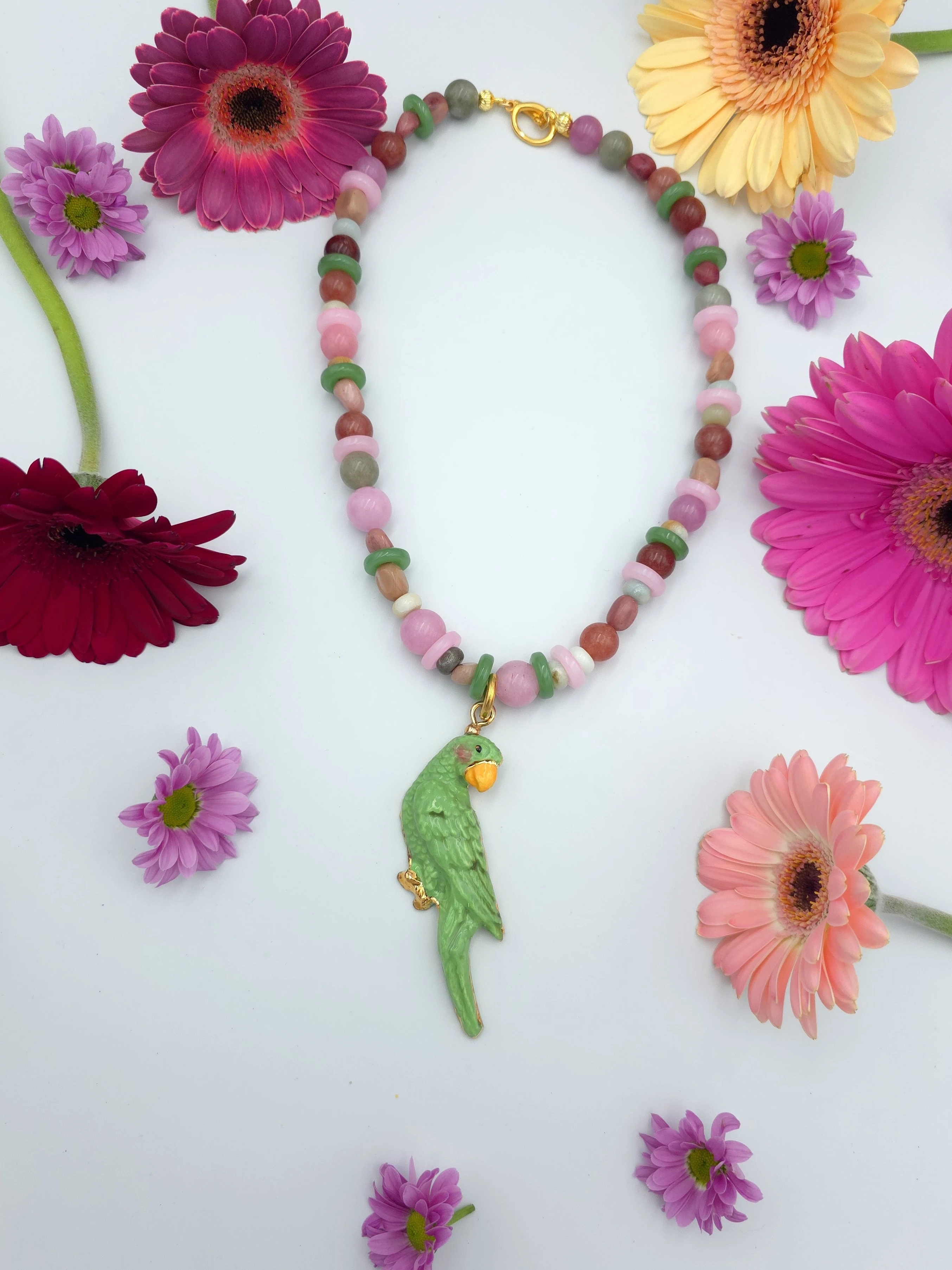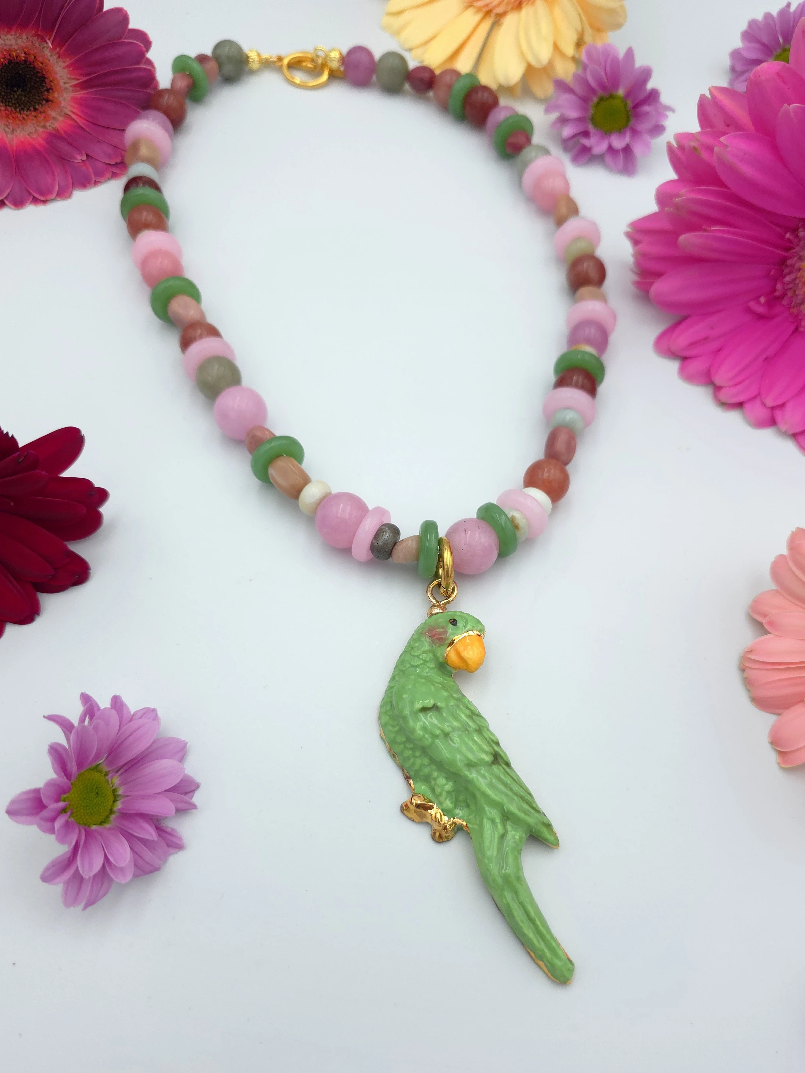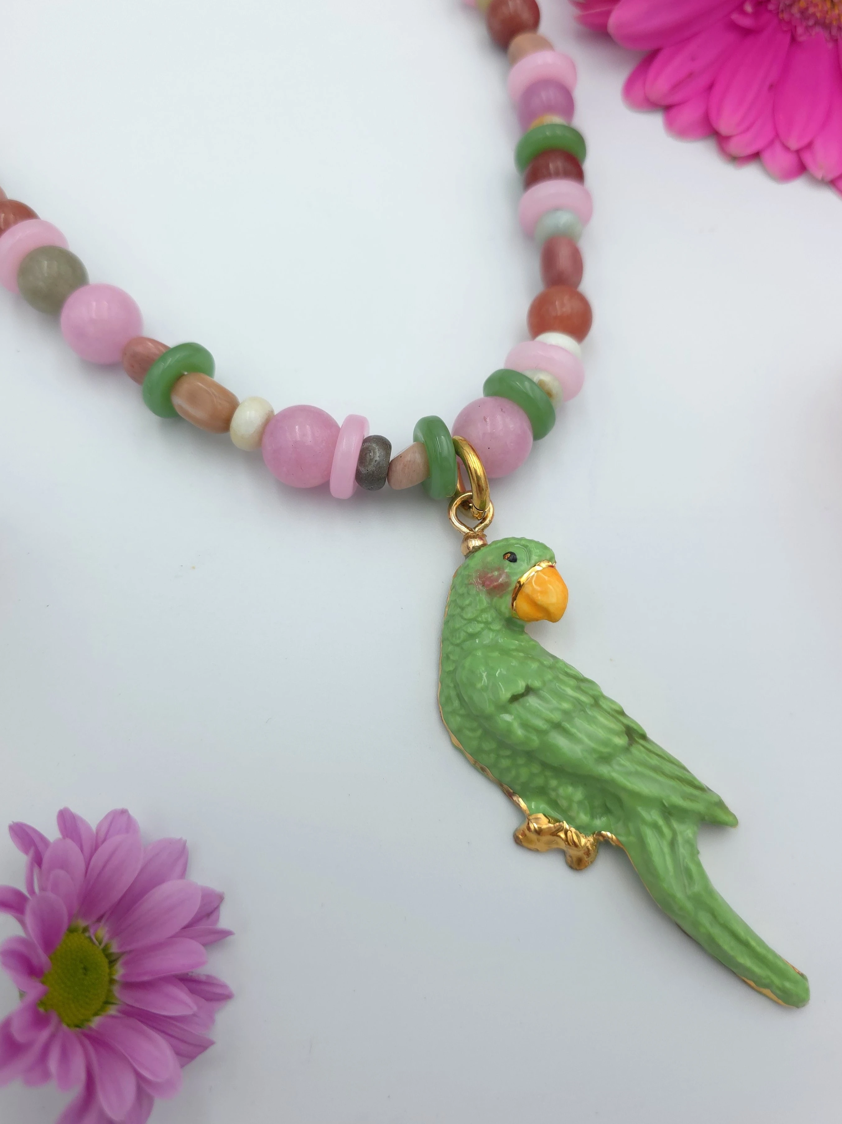 Naszyjnik z mieszanki kamieni naturalnych z porcelanową, złoconą papużką.