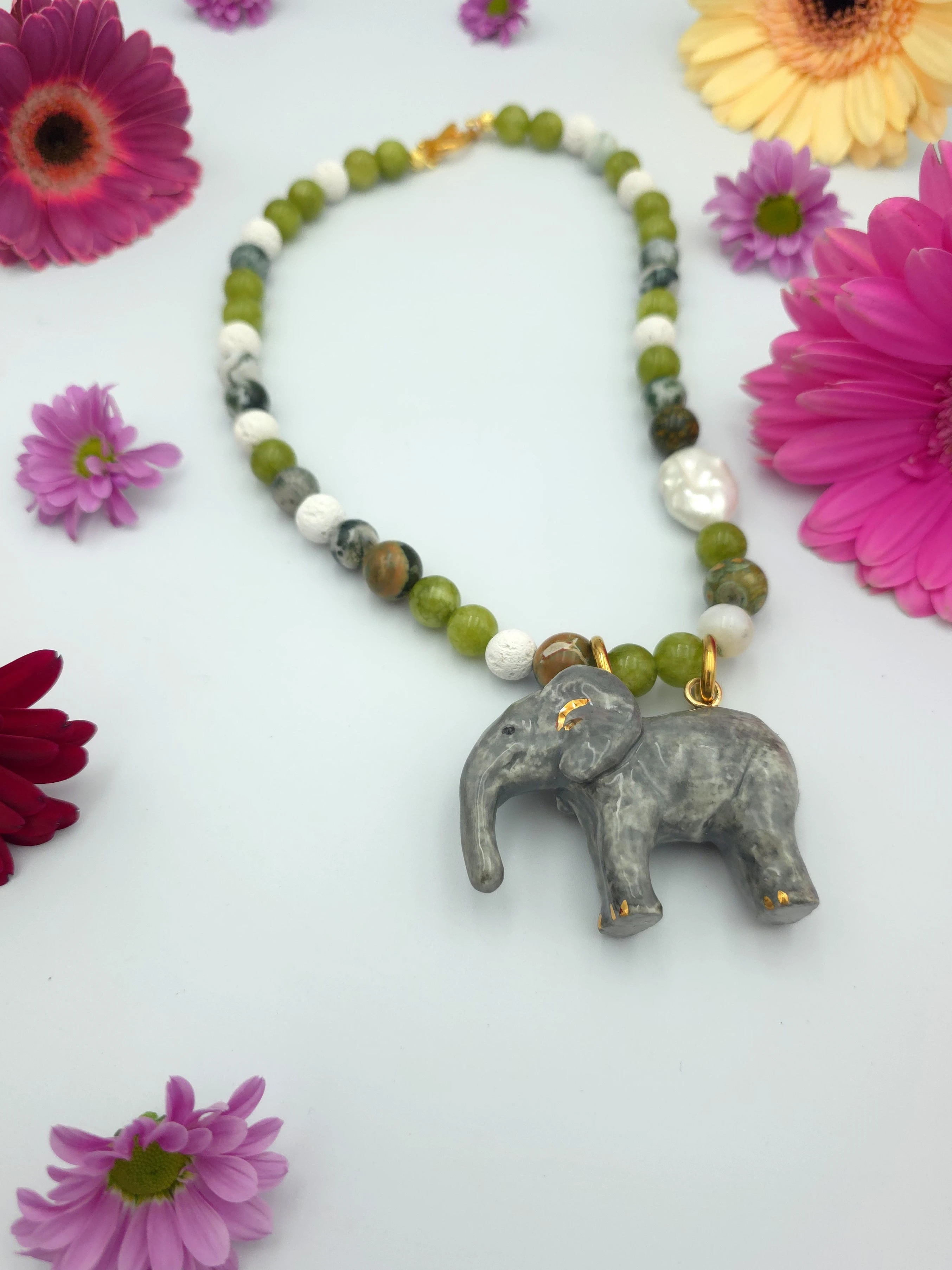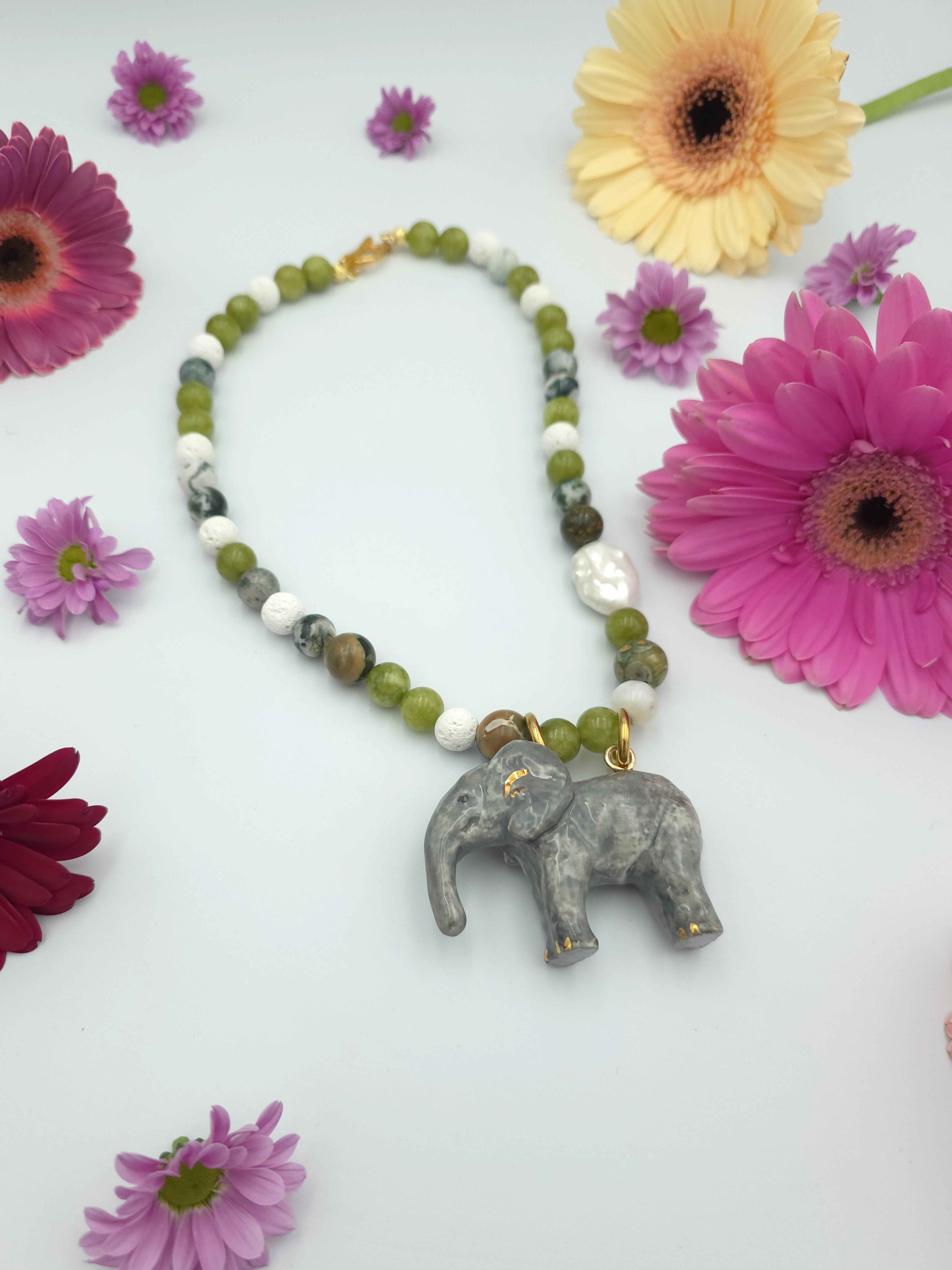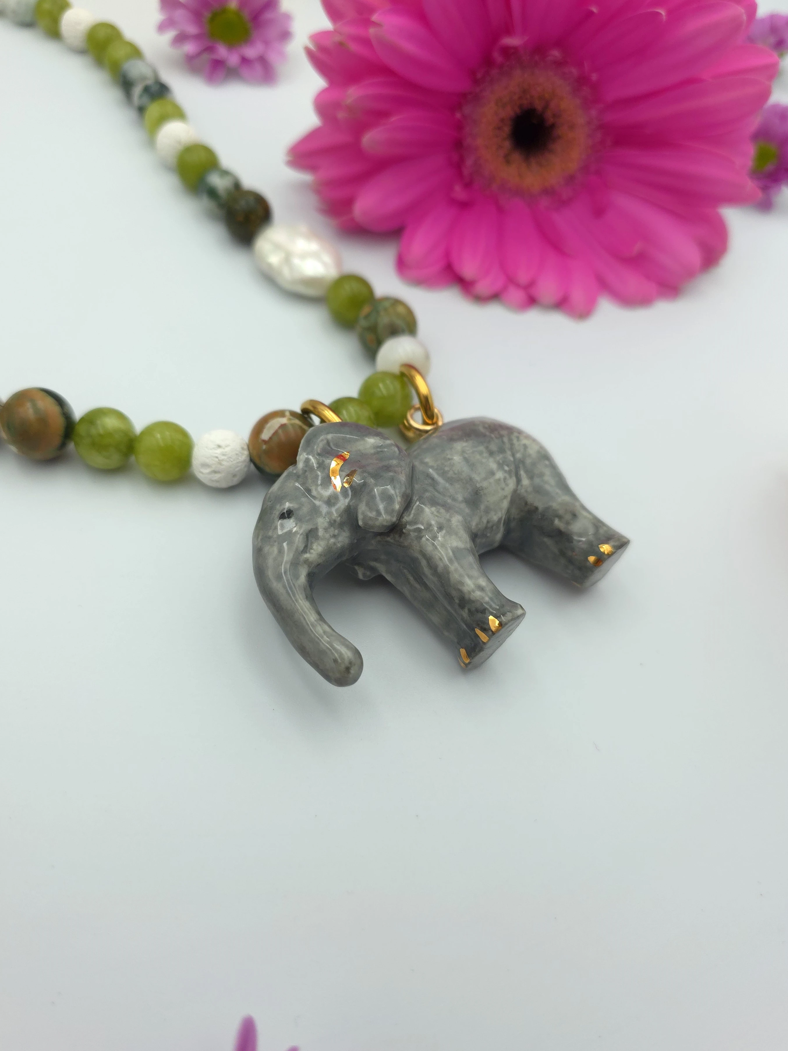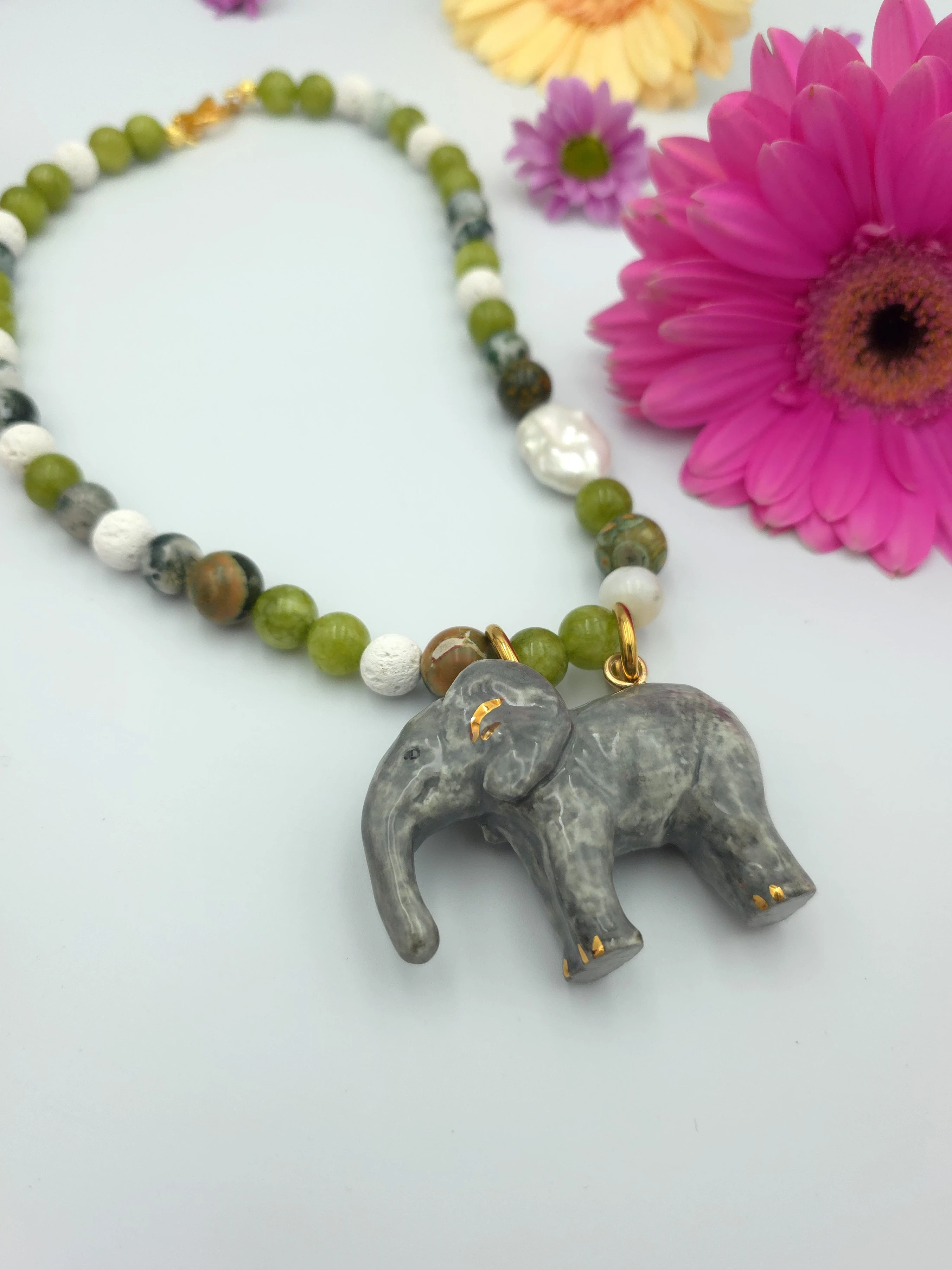 Naszyjnik z mieszanki kamieni naturalnych z porcelanowym, złoconym słoniem