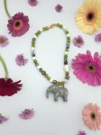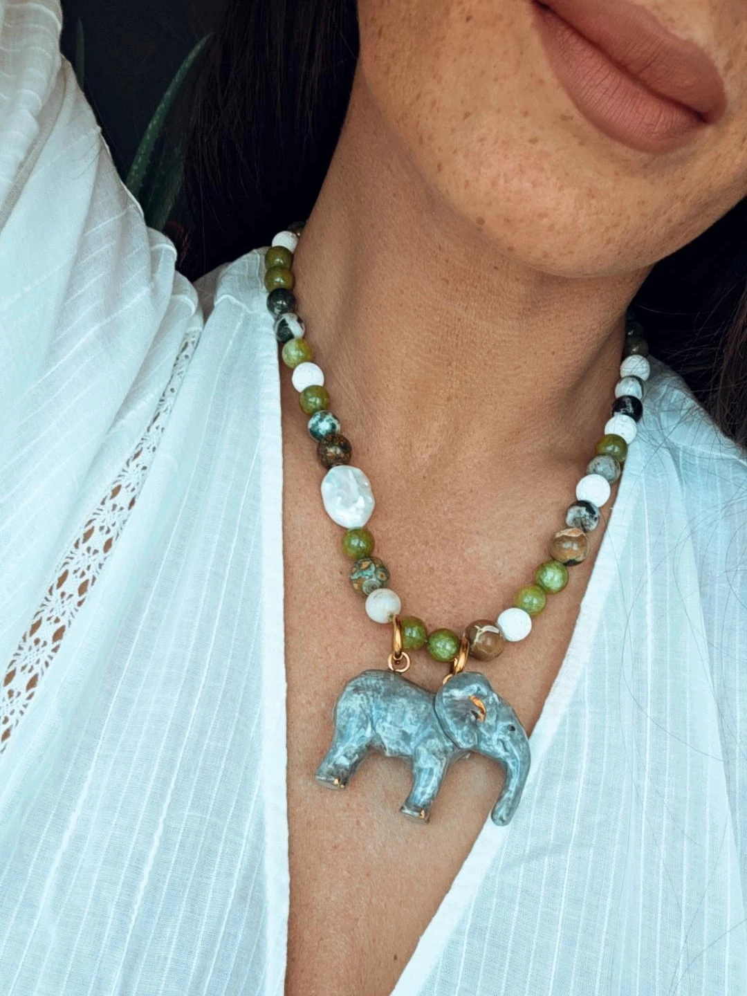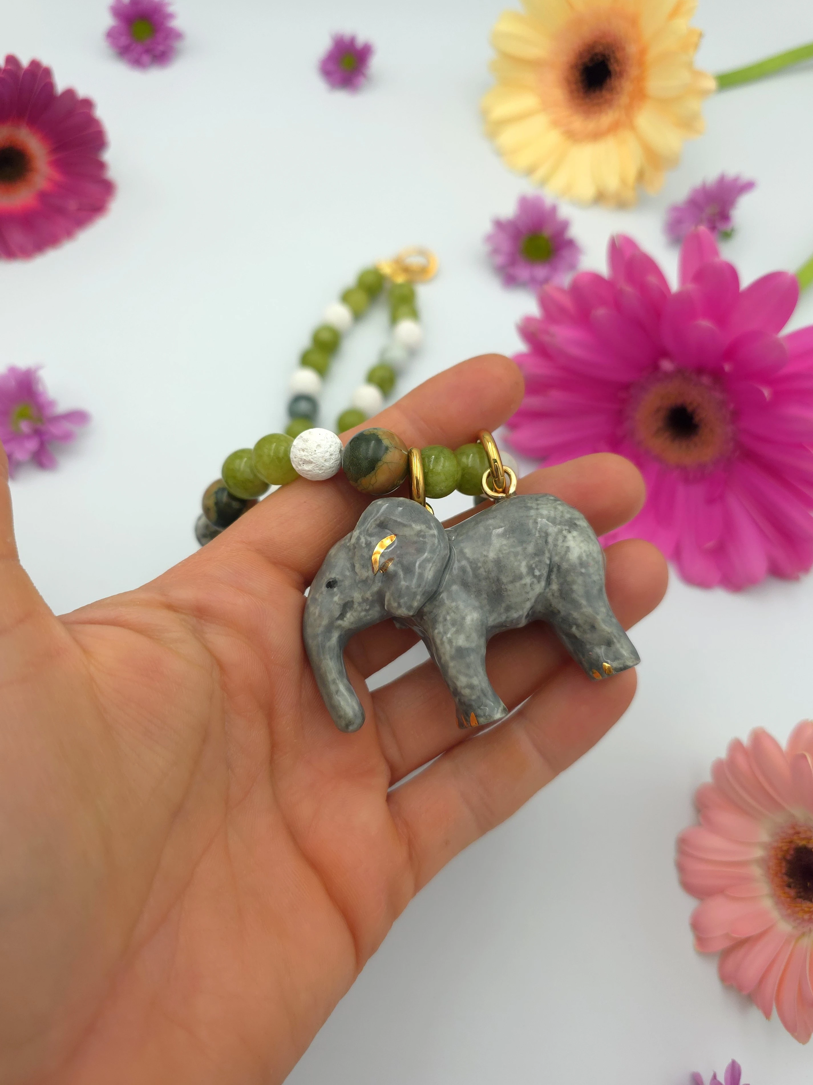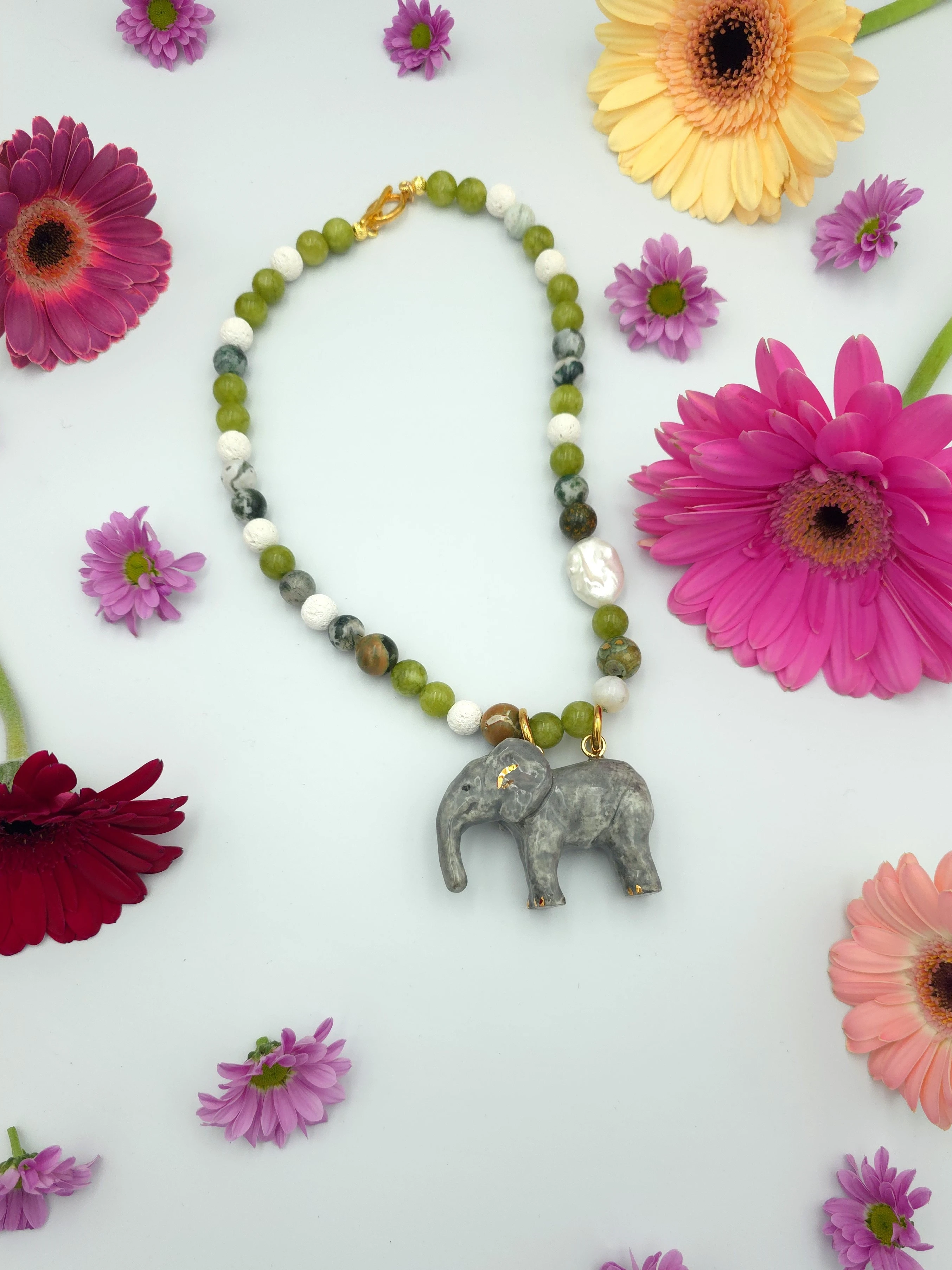 Naszyjnik z mieszanki kamieni naturalnych z porcelanowym, złoconym słoniem