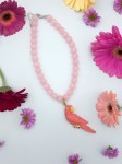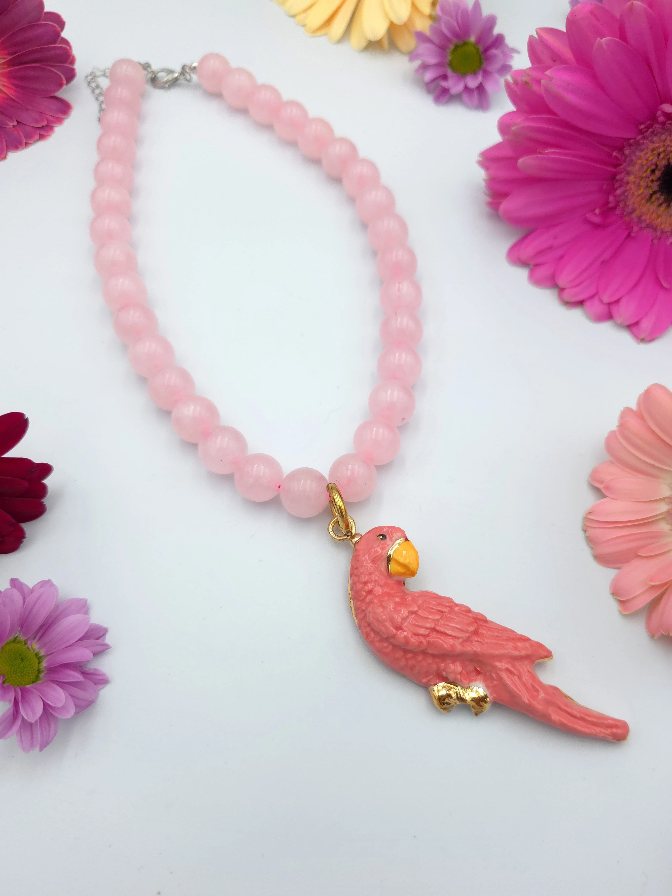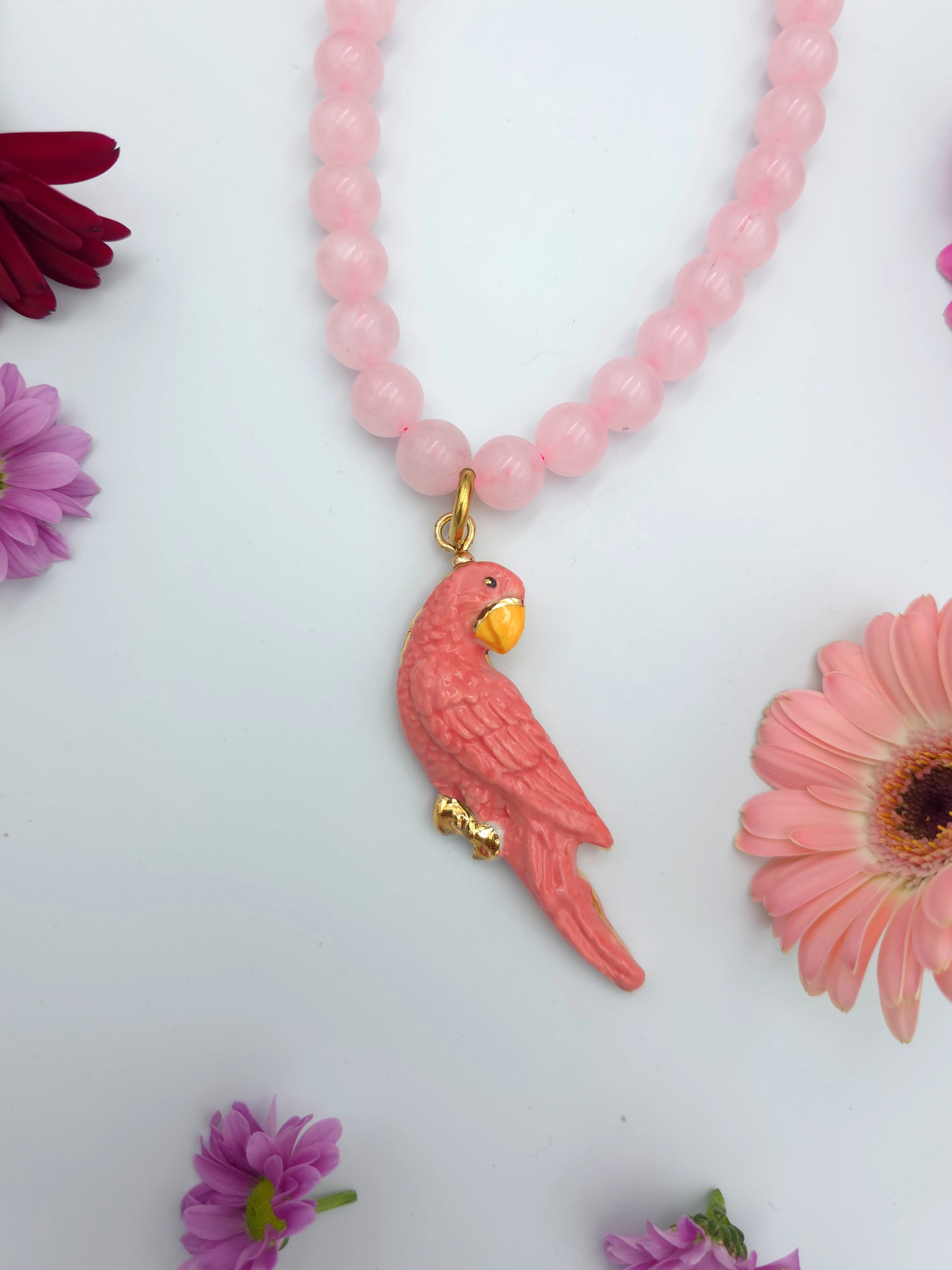 Naszyjnik z różowego kryształu górskiego z porcelanową papużką.