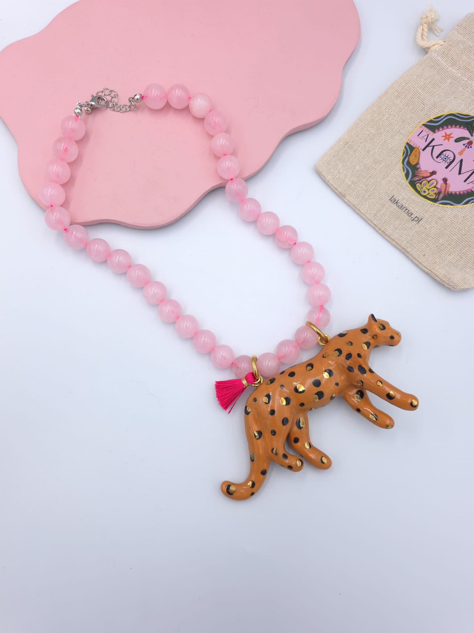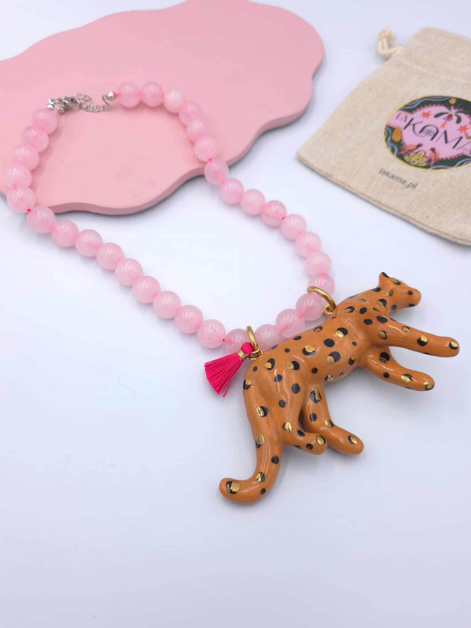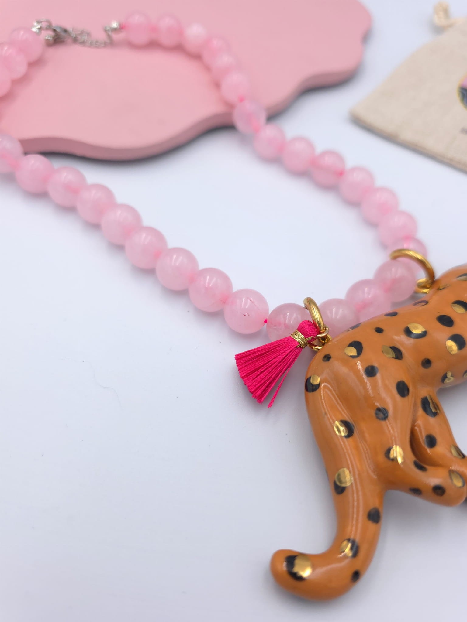 Dziki naszyjnik z kryształu górskiego z porcelanowym lampartem i różowym chwościkiem.