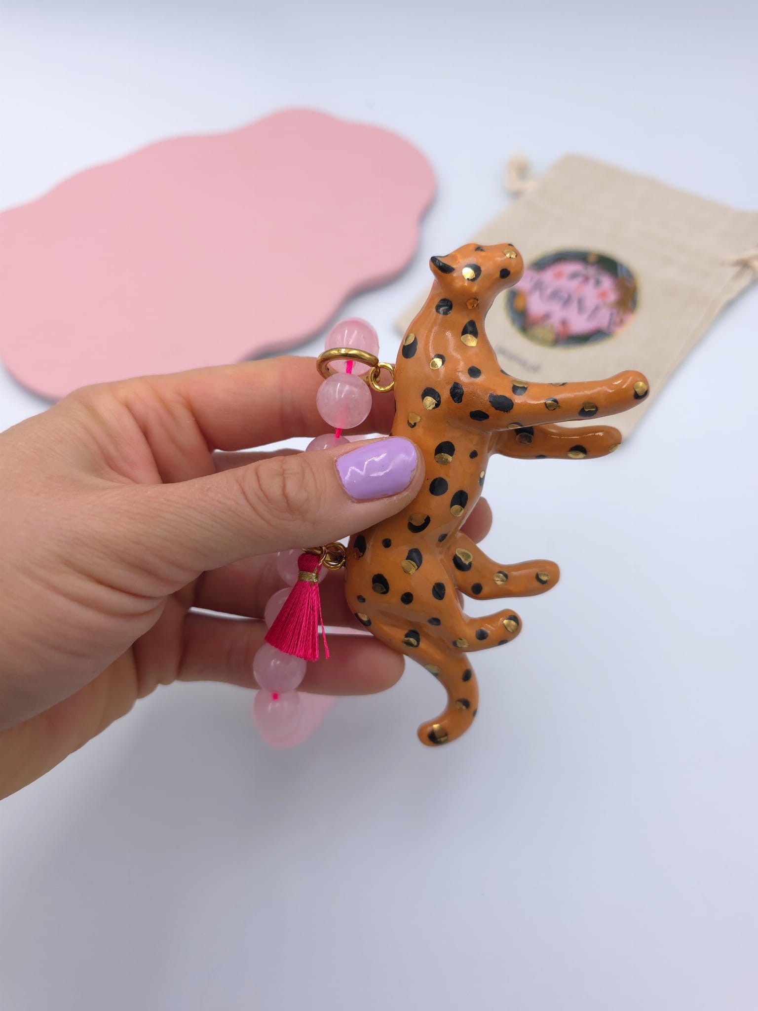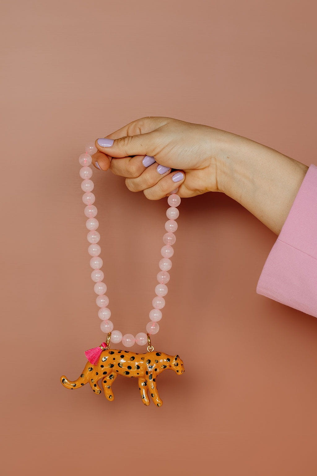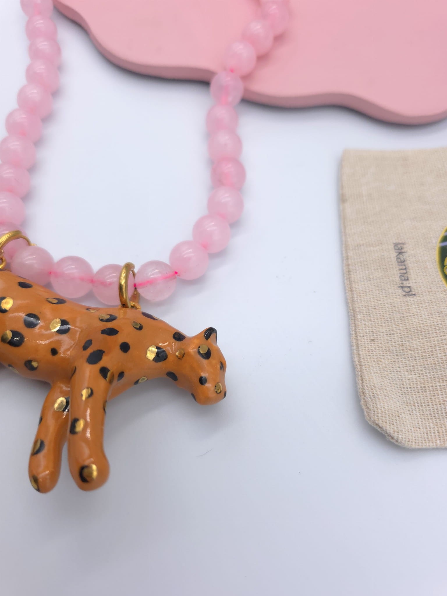 Dziki naszyjnik z kryształu górskiego z porcelanowym lampartem i różowym chwościkiem.