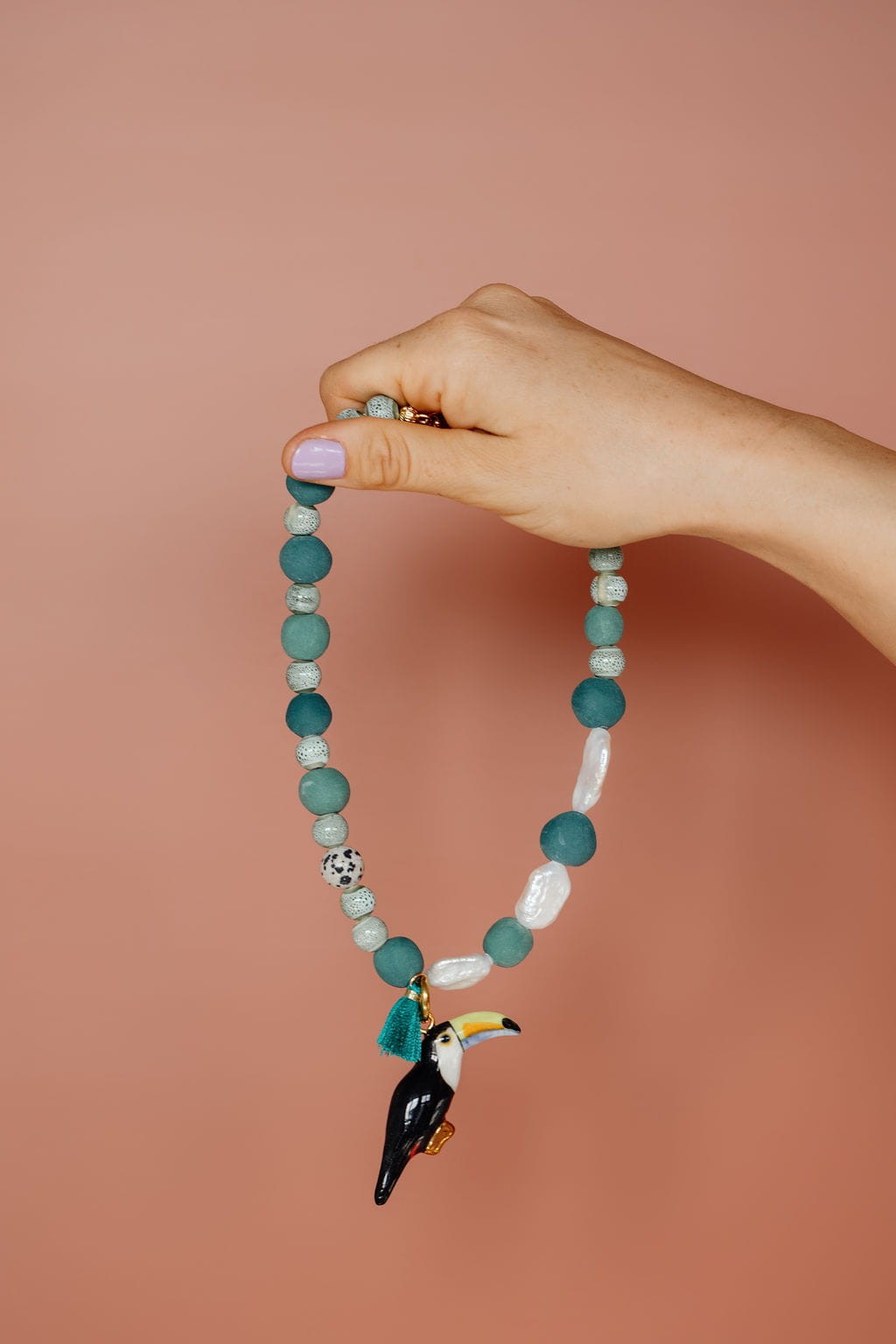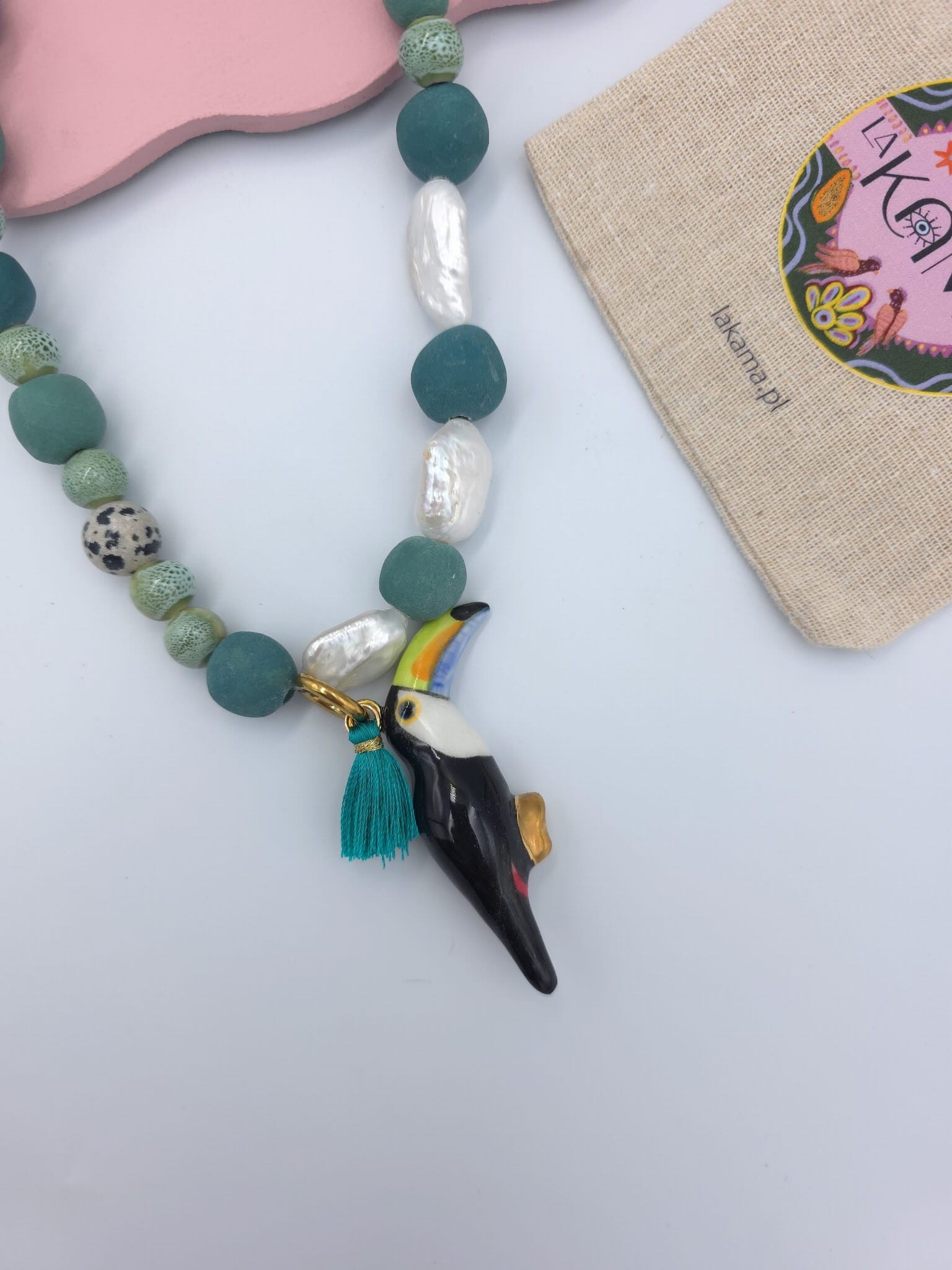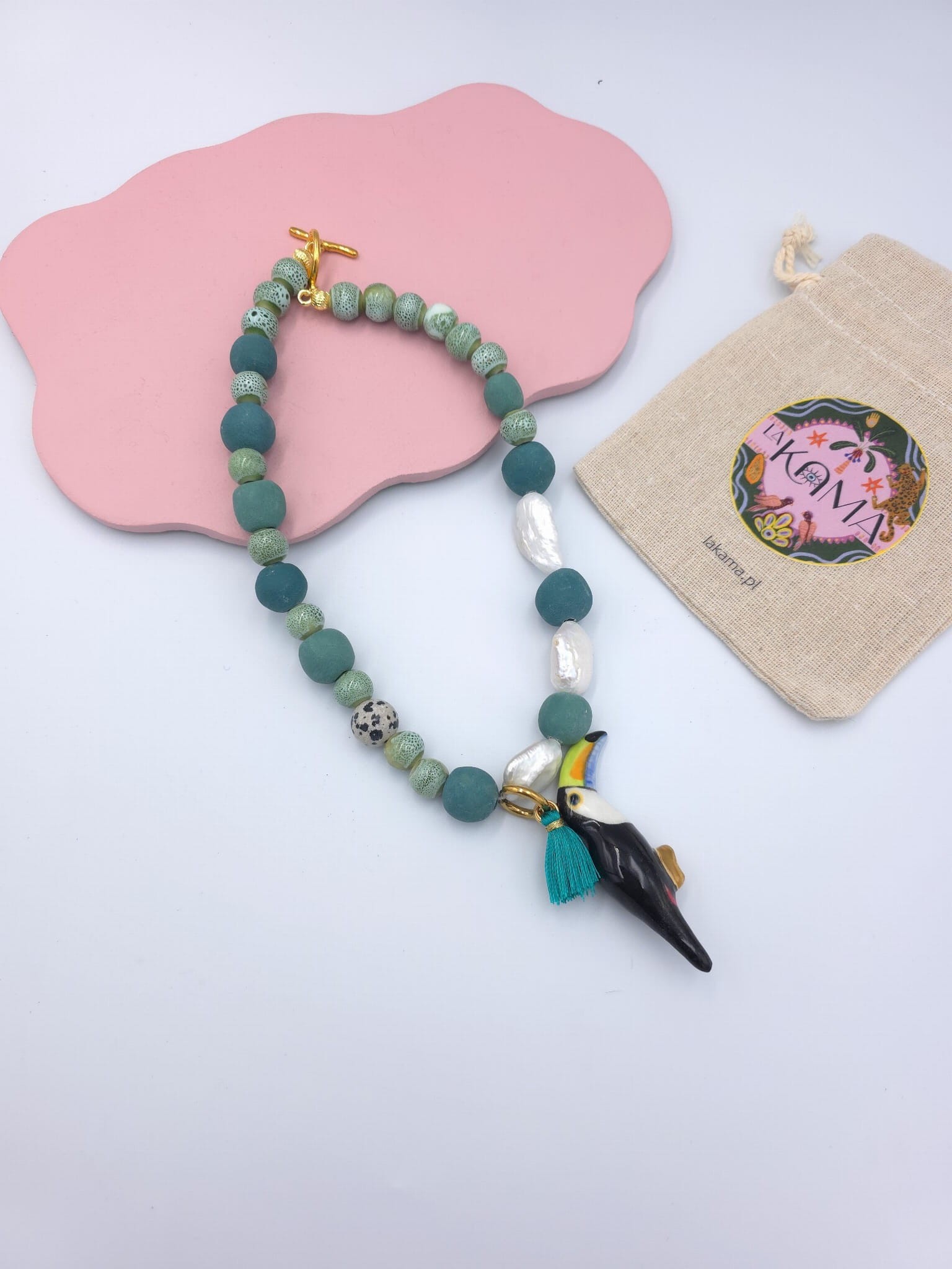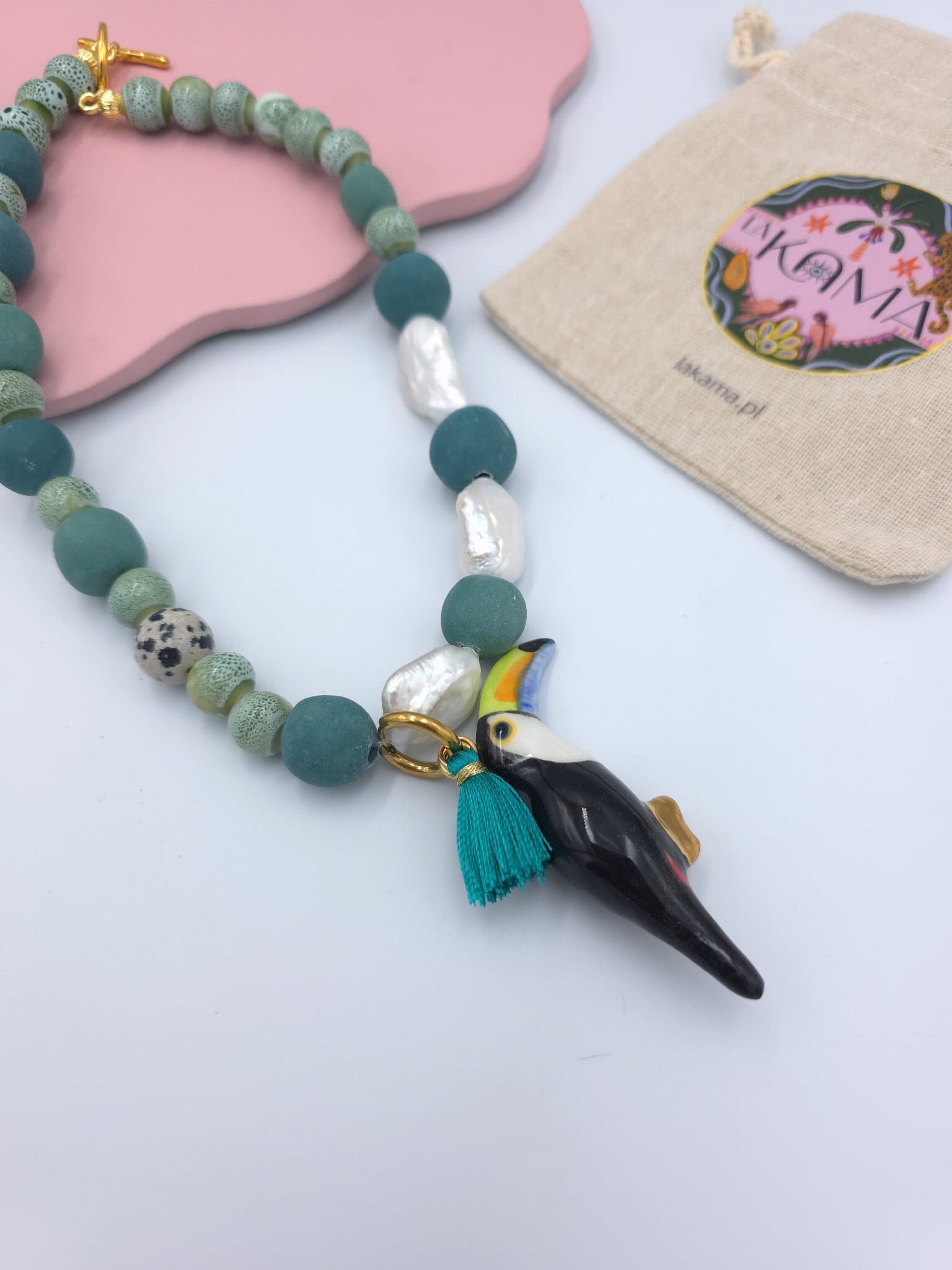 Naszyjnik- perły i koraliki ceramiczne z tukanem
