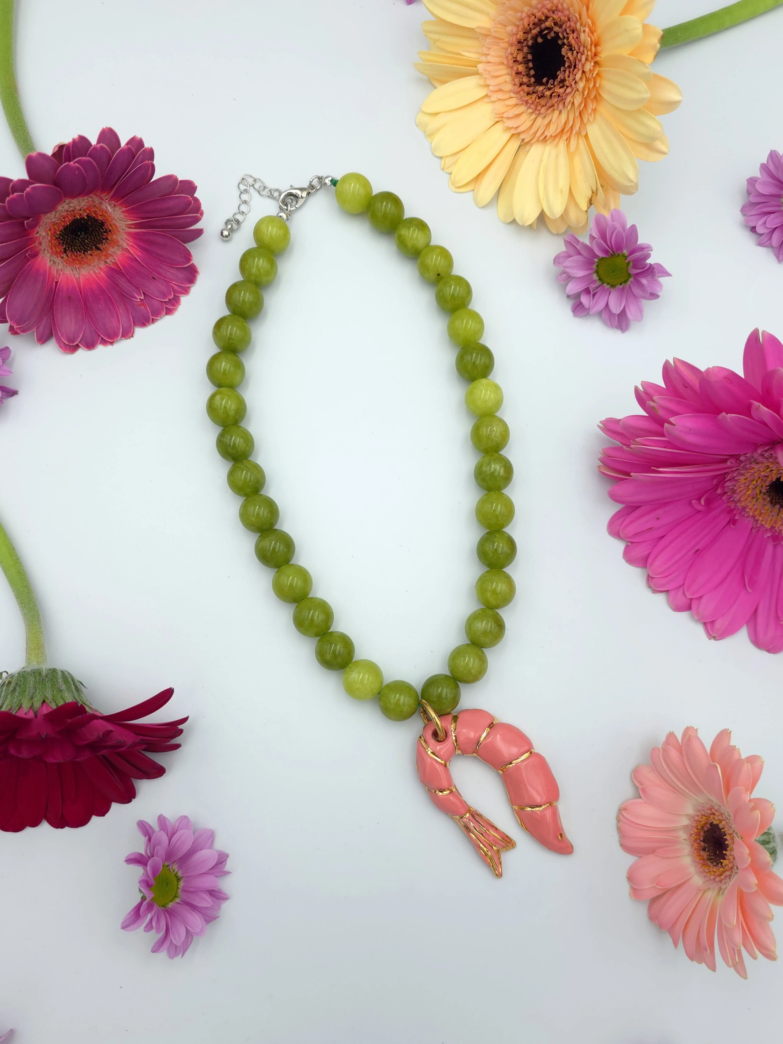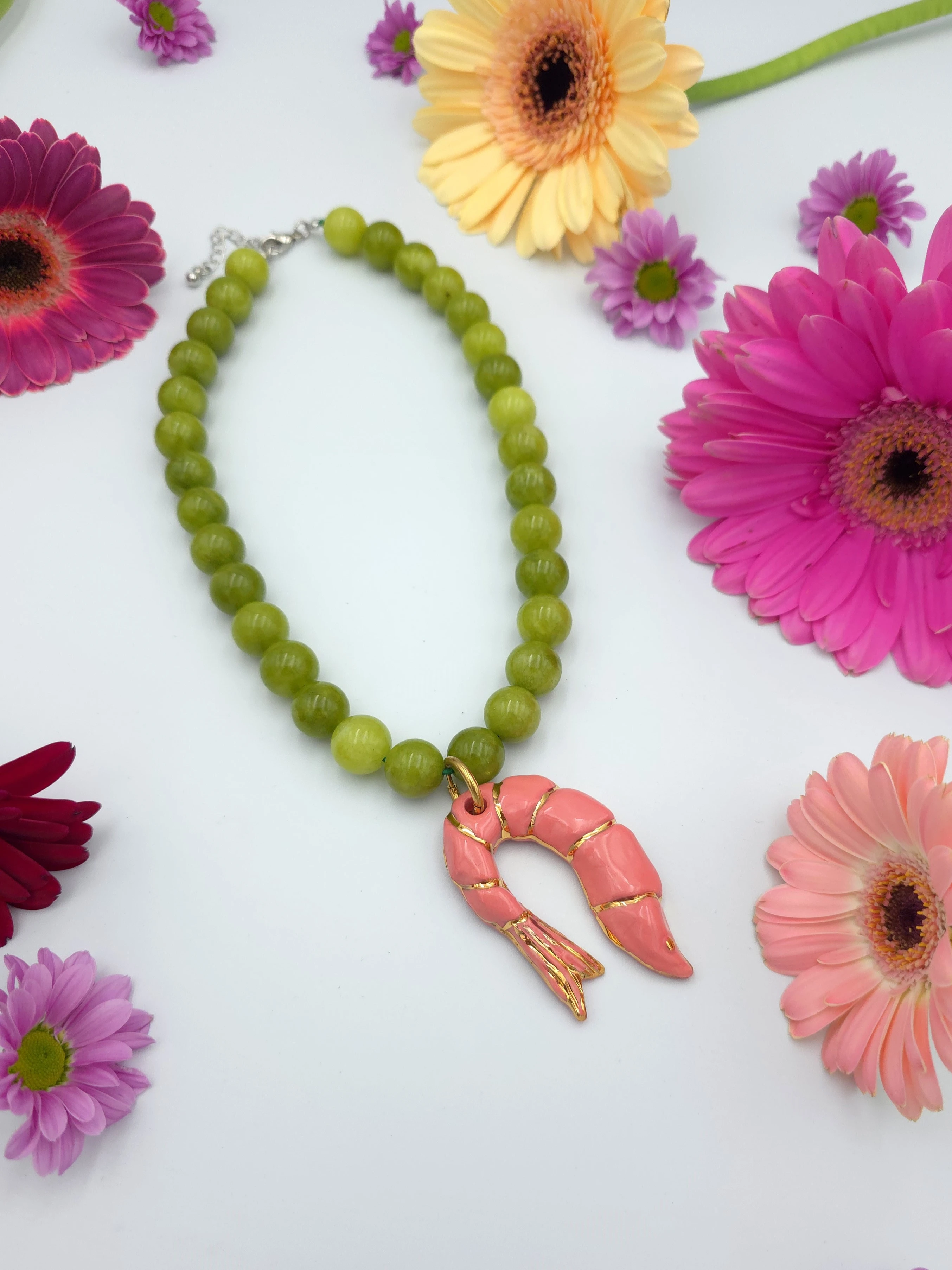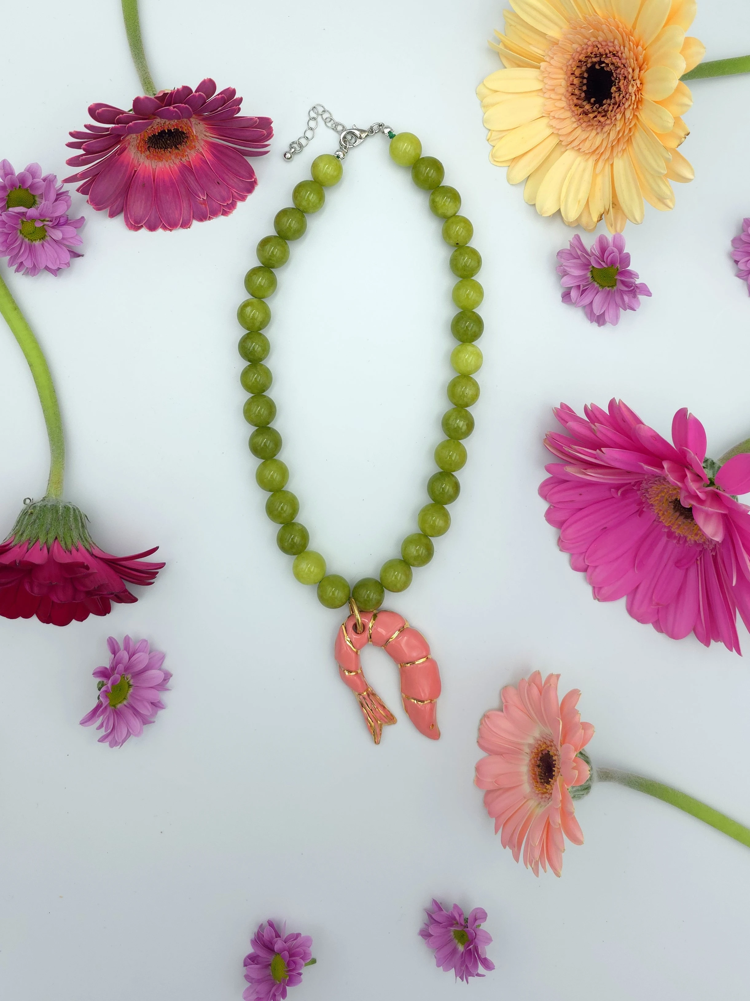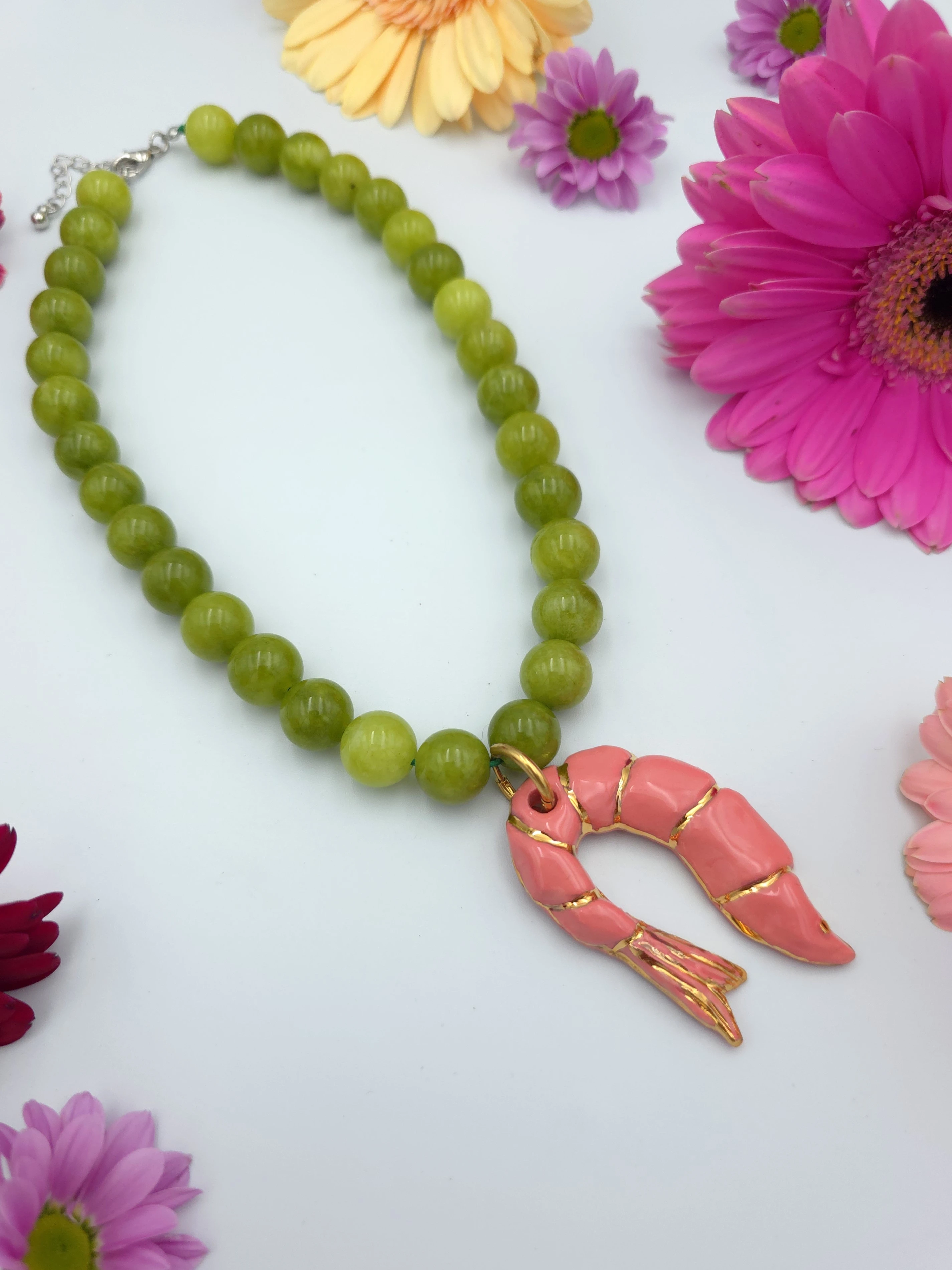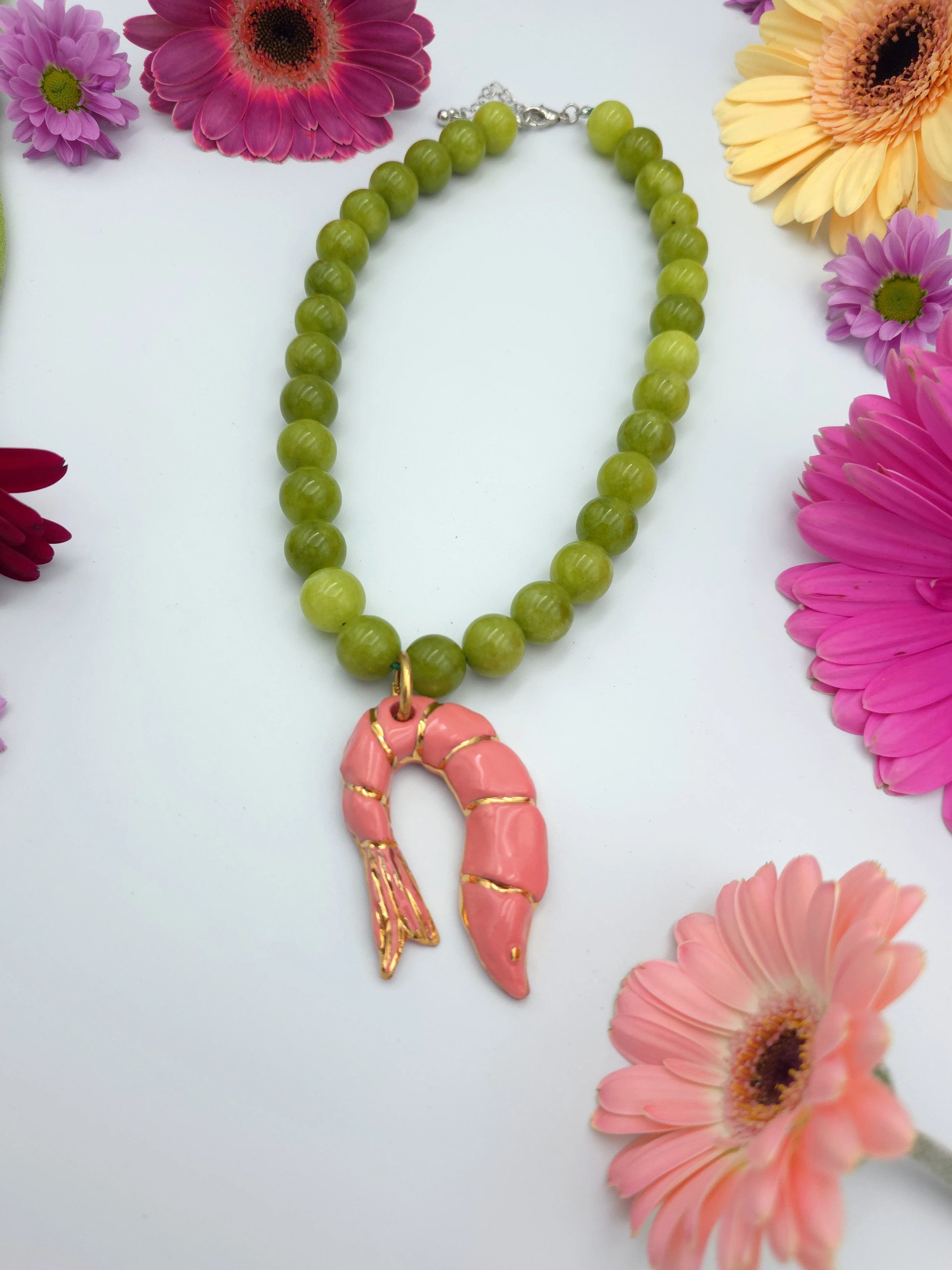 Jadeitowy naszyjnik z porcelanową, złoconą zawieszką.
