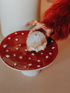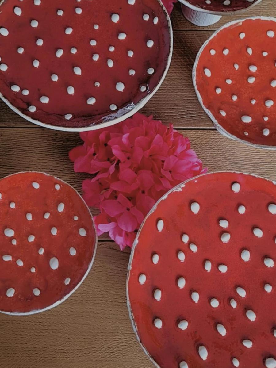 Ręcznie lepiona patera ceramiczna w formie muchomora.