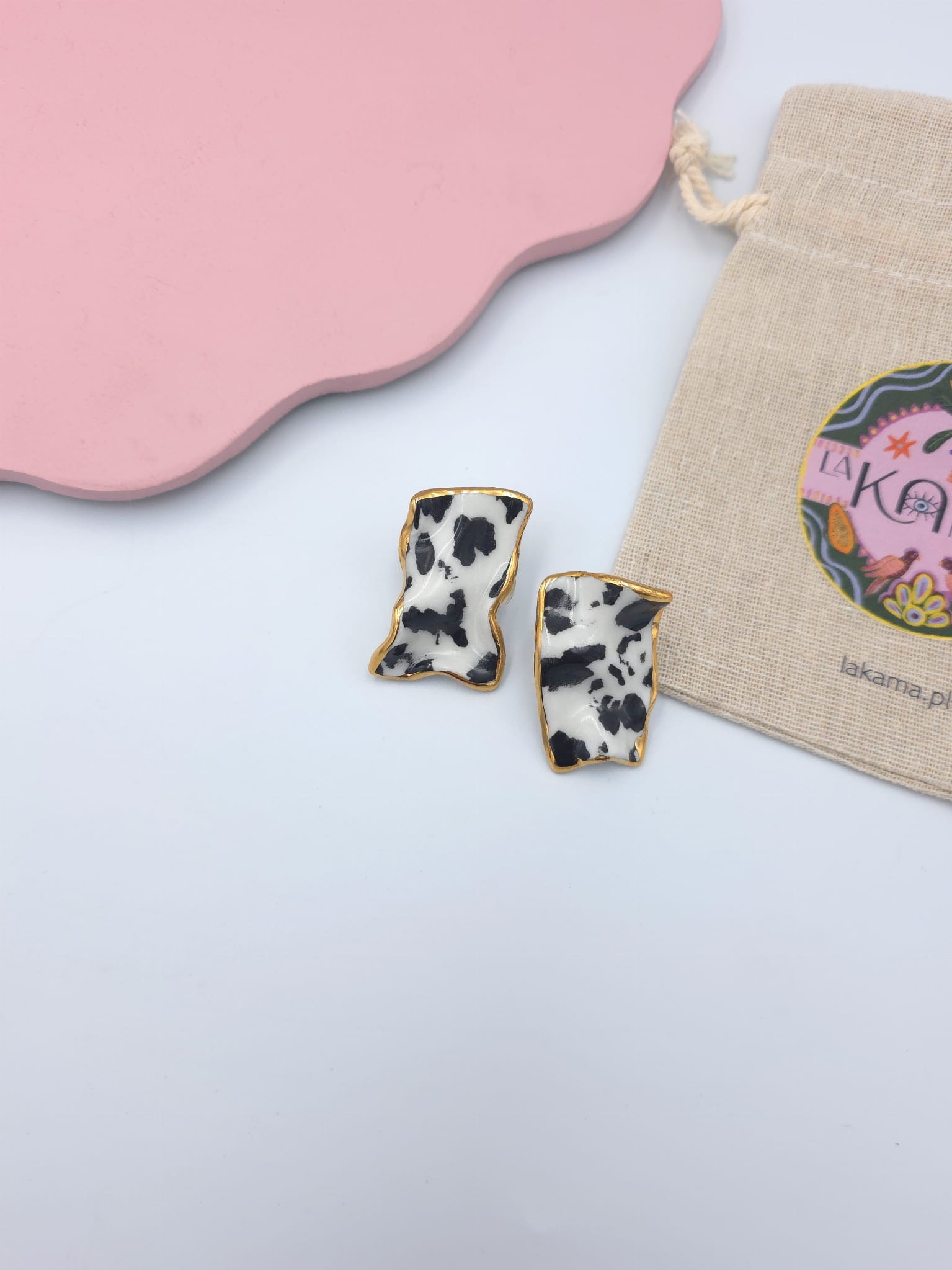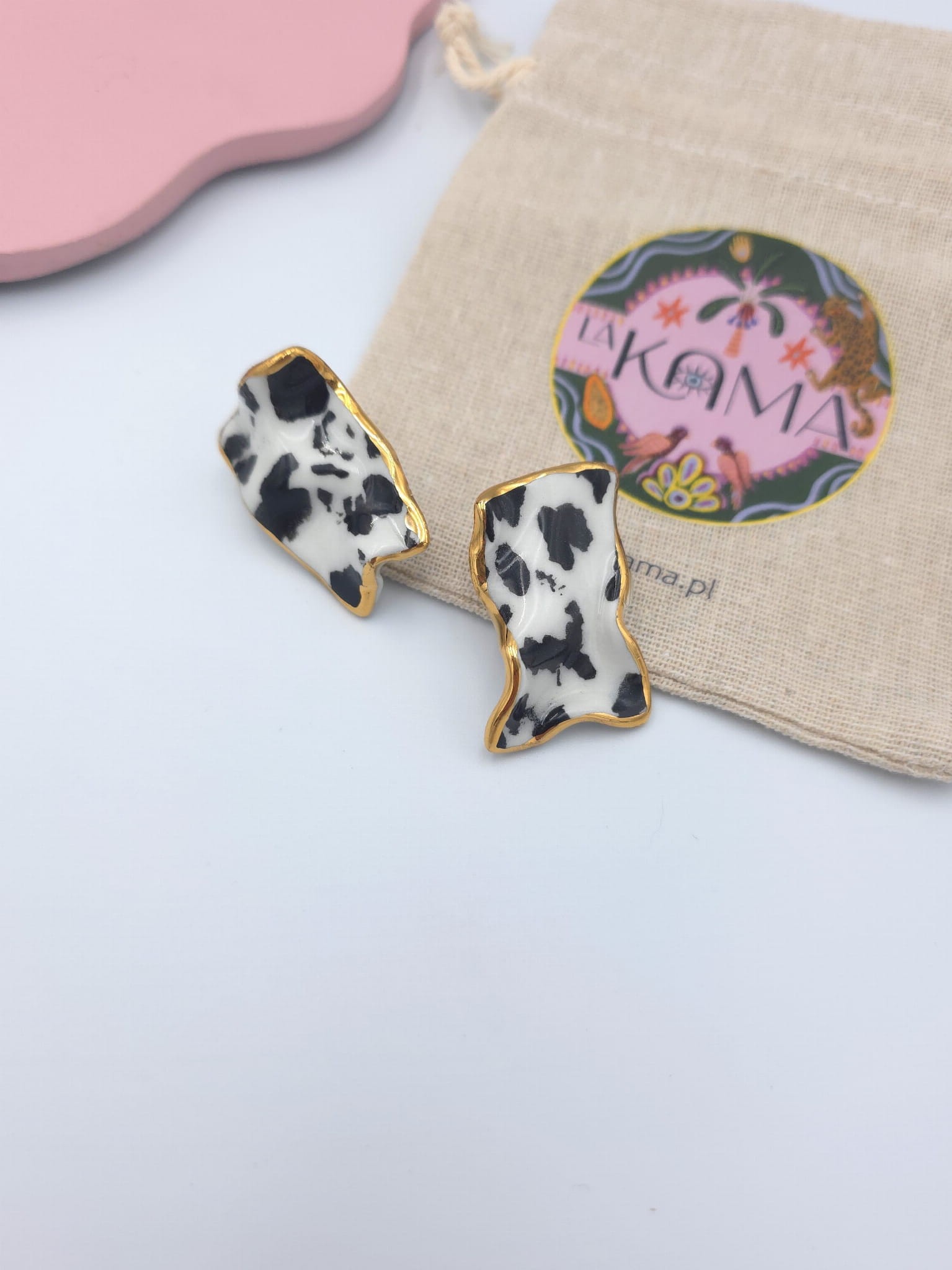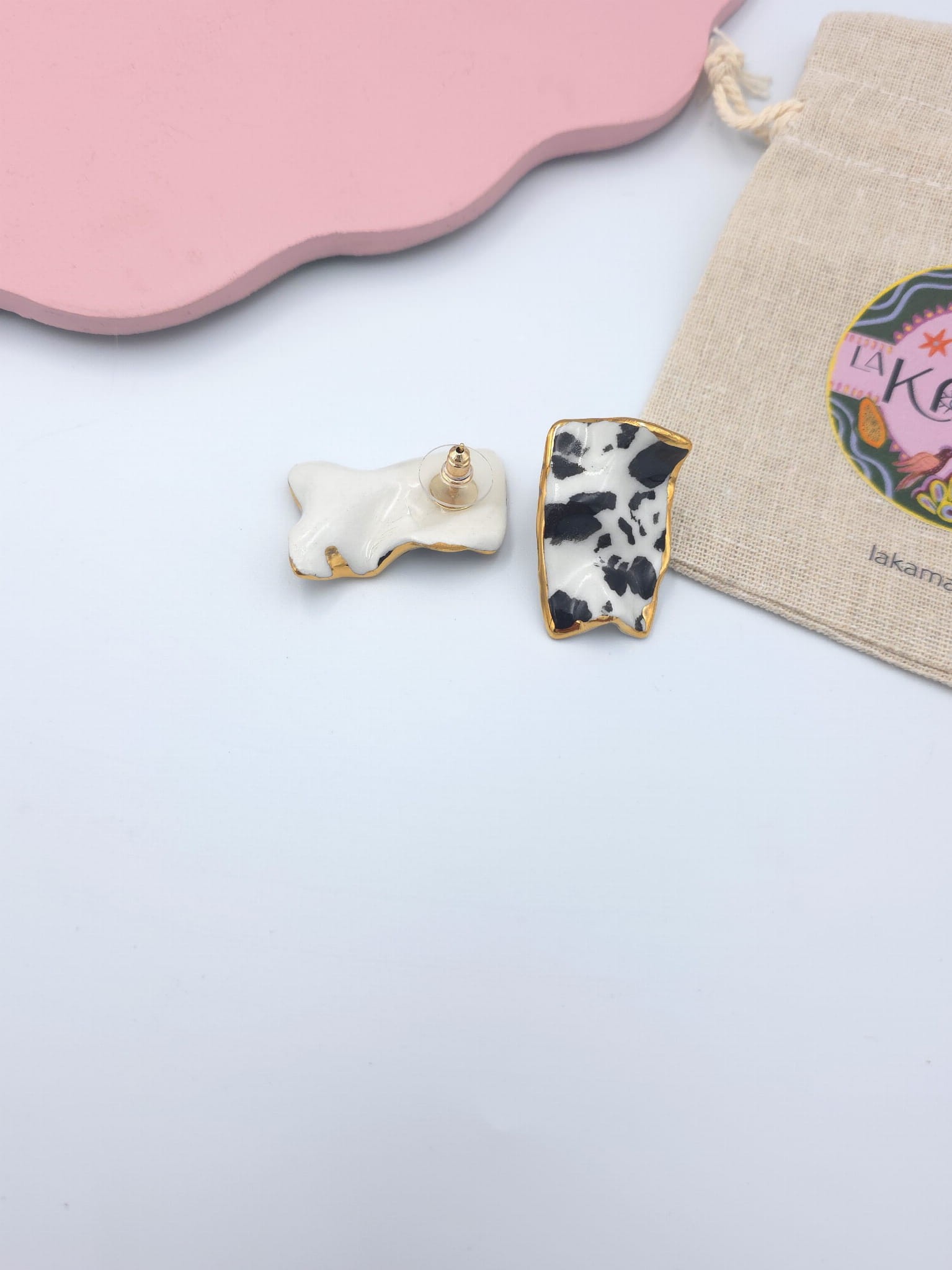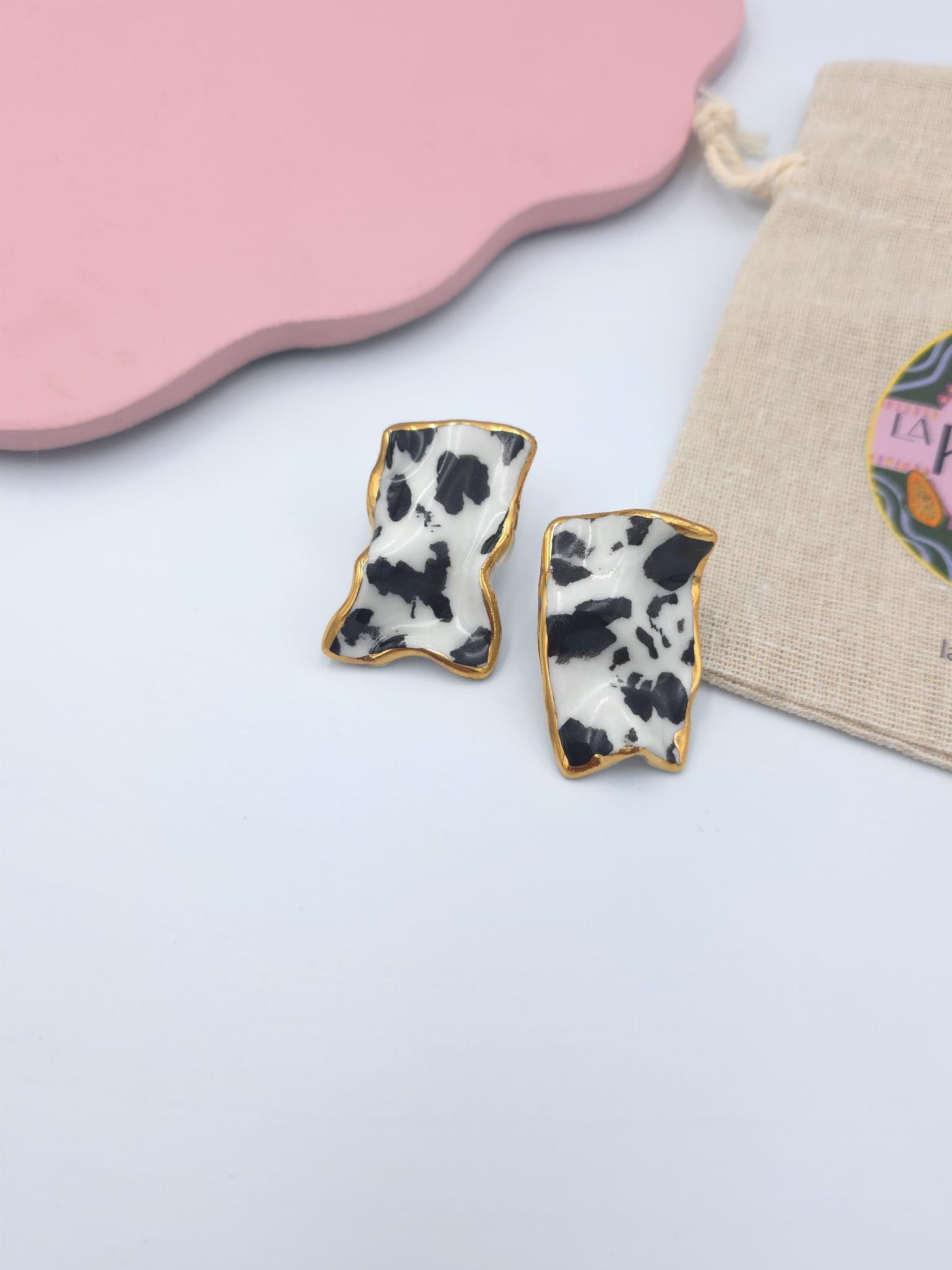 Asymetryczne kolczyki z porcelany, zdobione prawdziwym złotem.