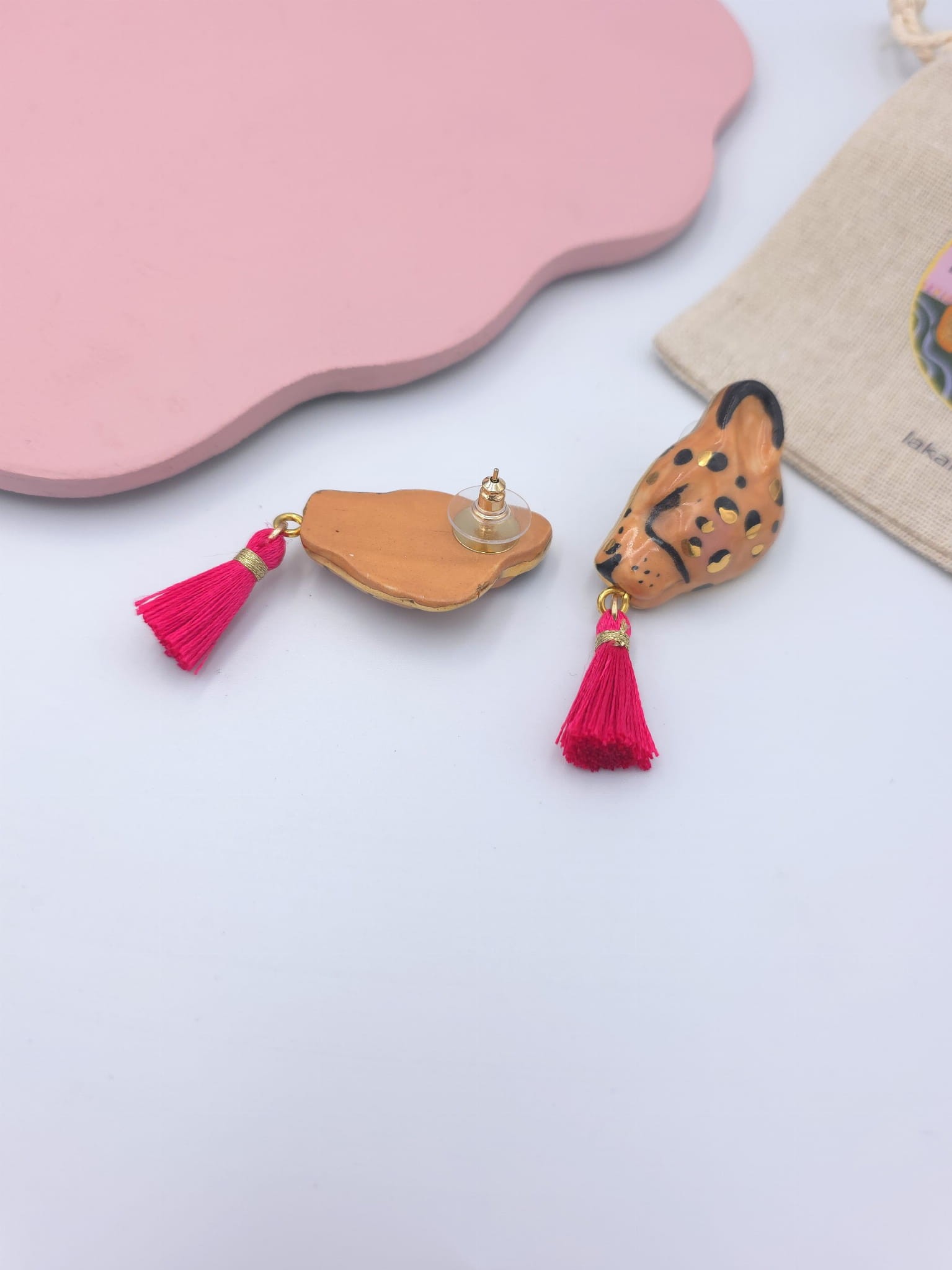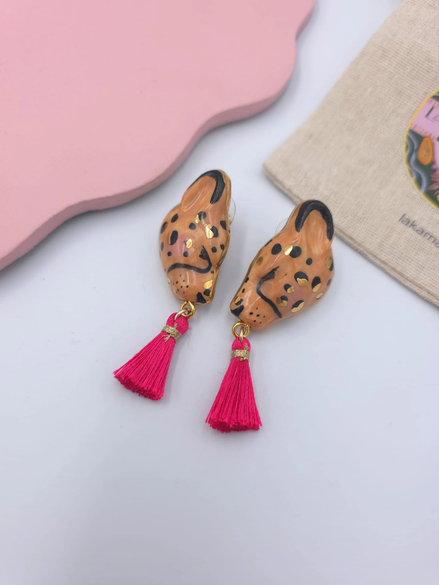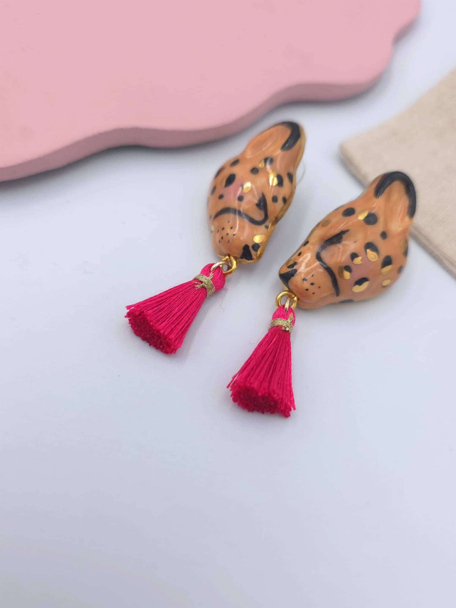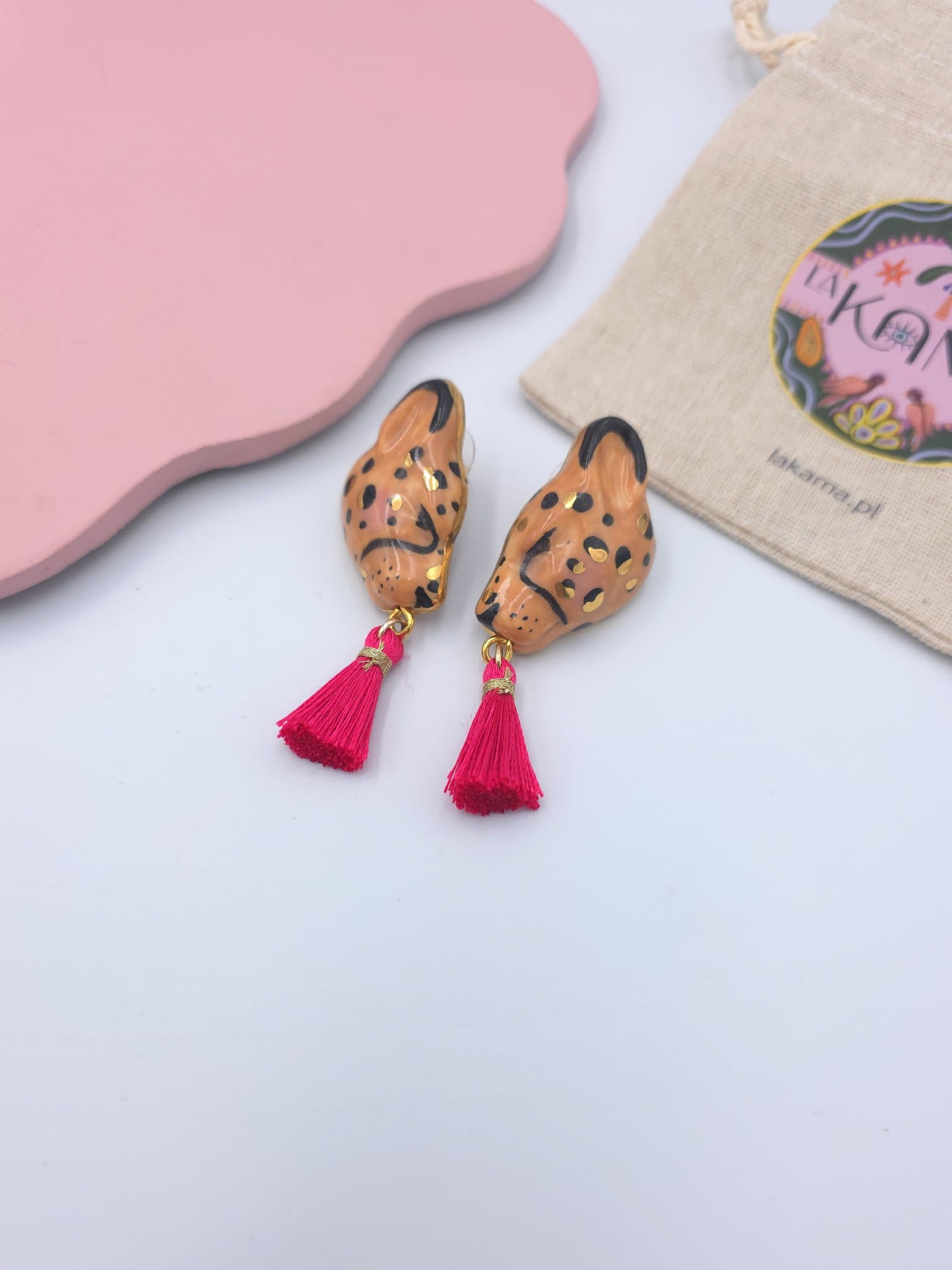Porcelanowe kolczyki - lamparty z różowym chwostem