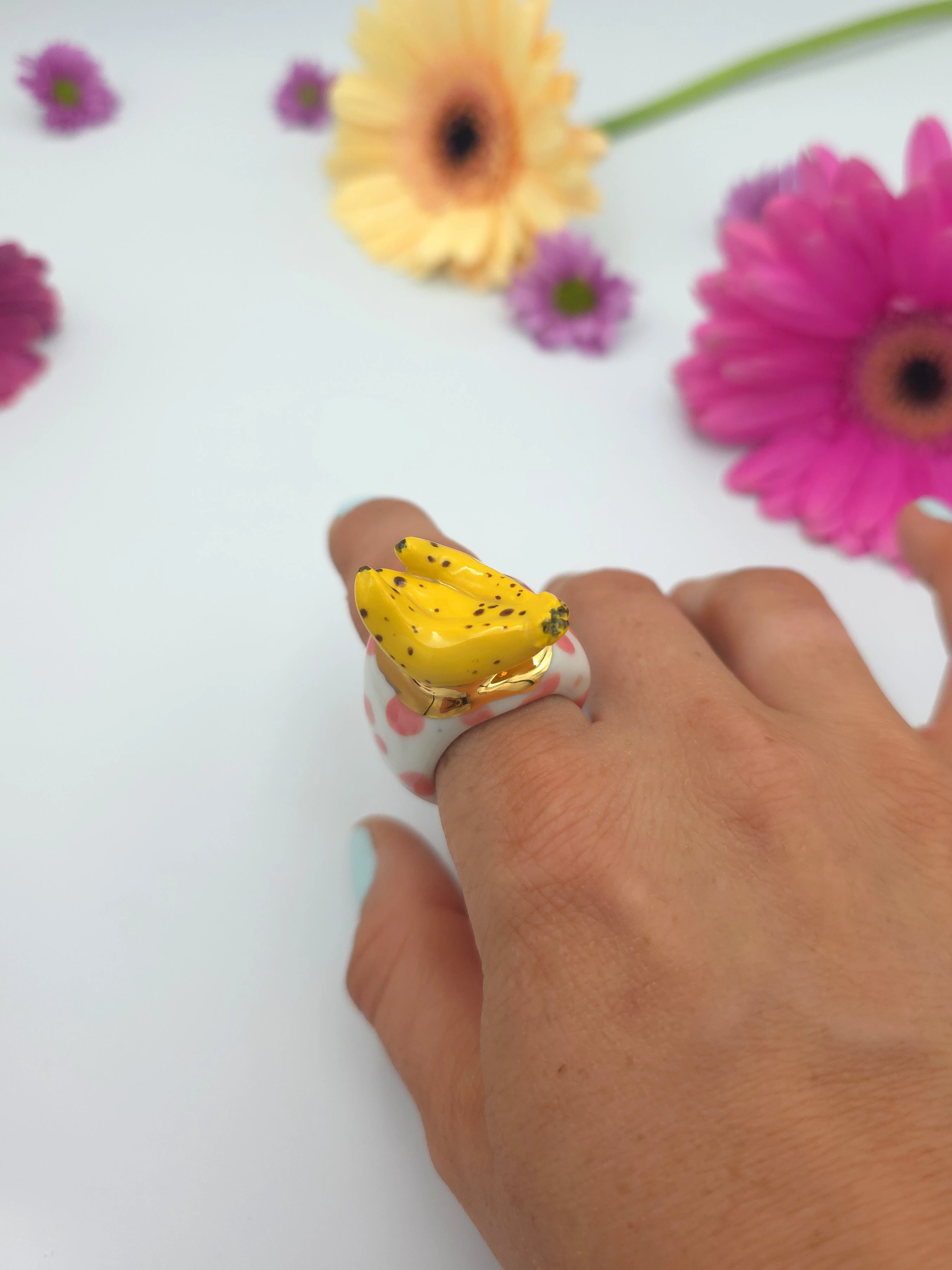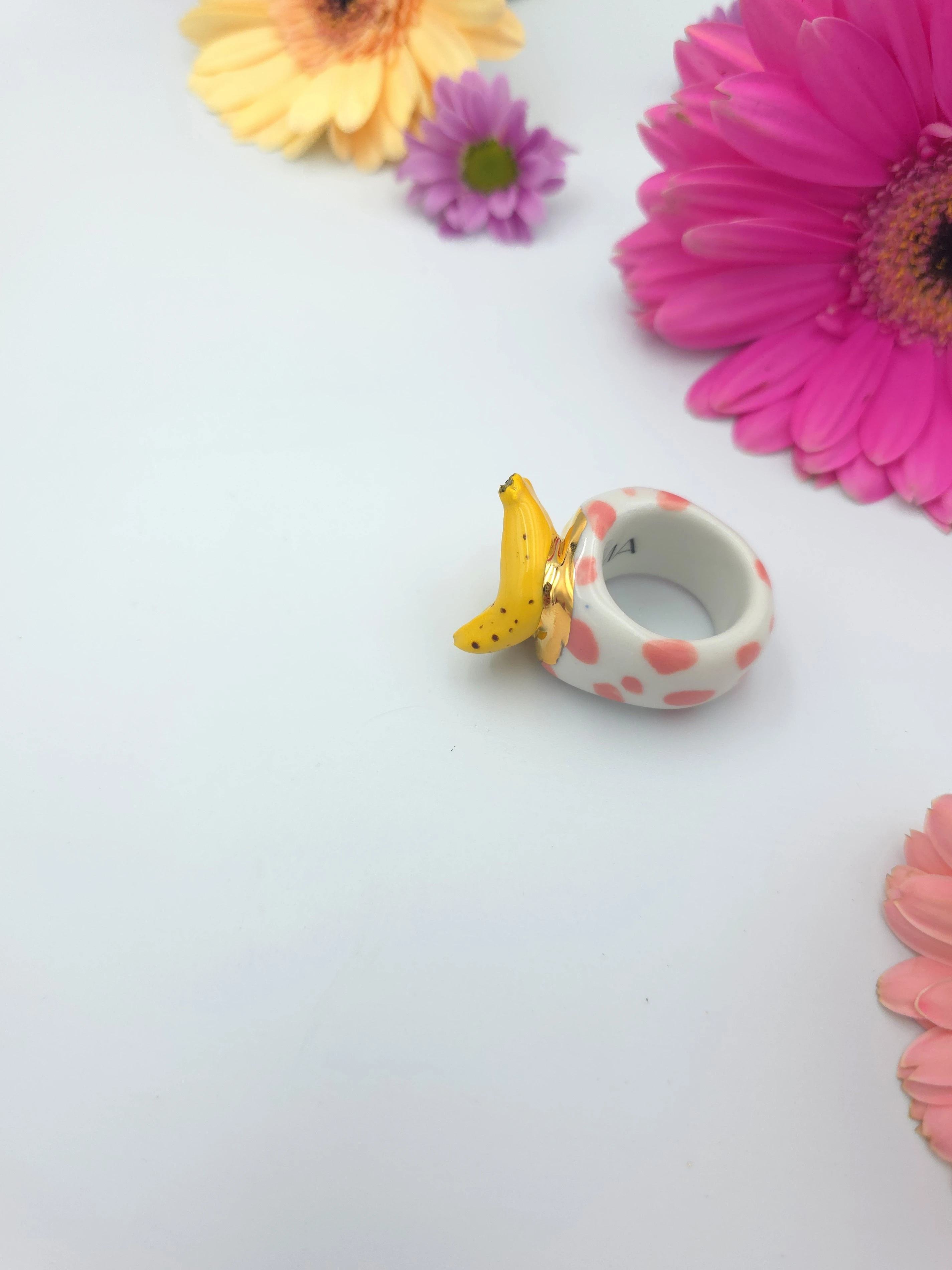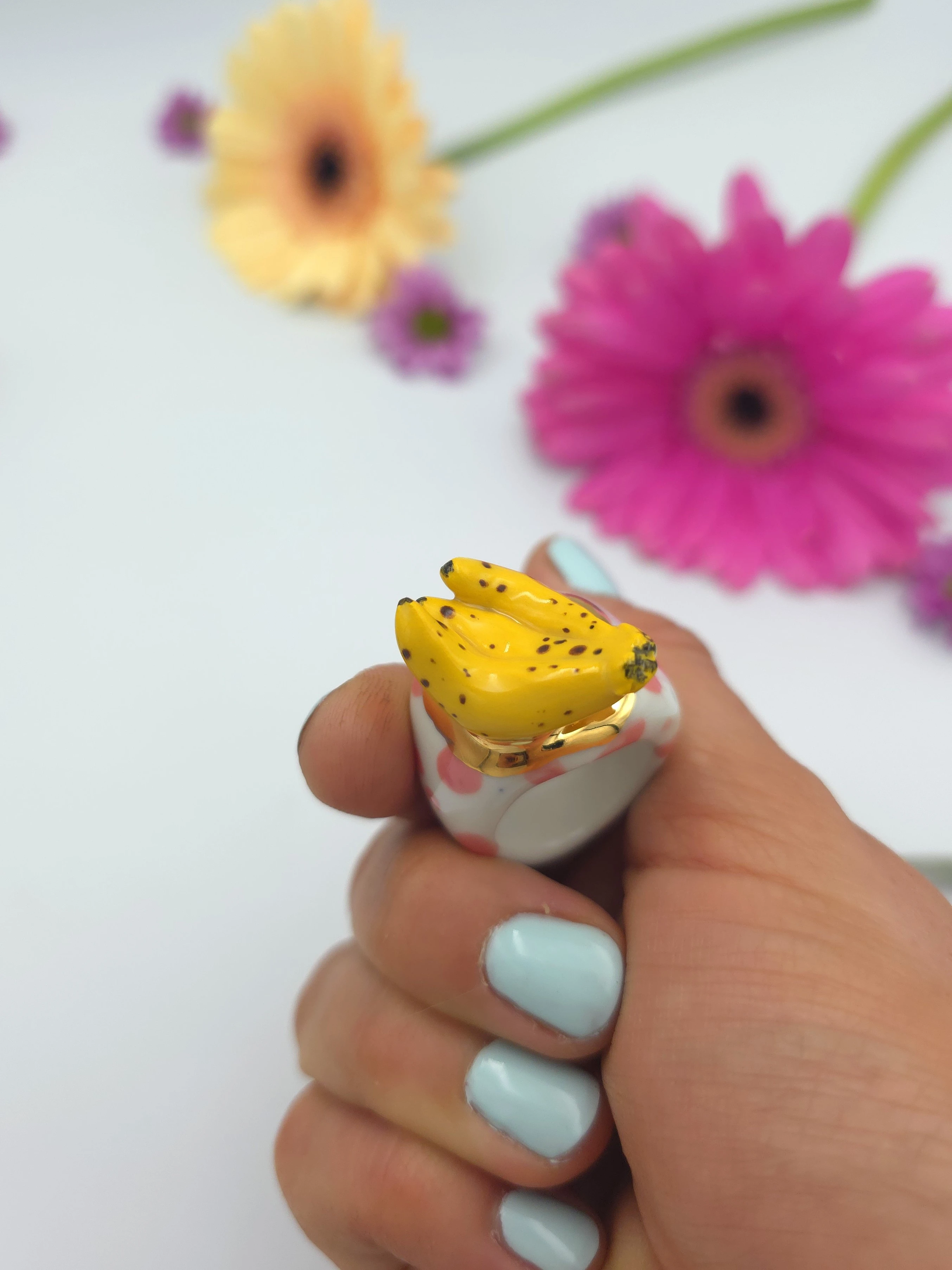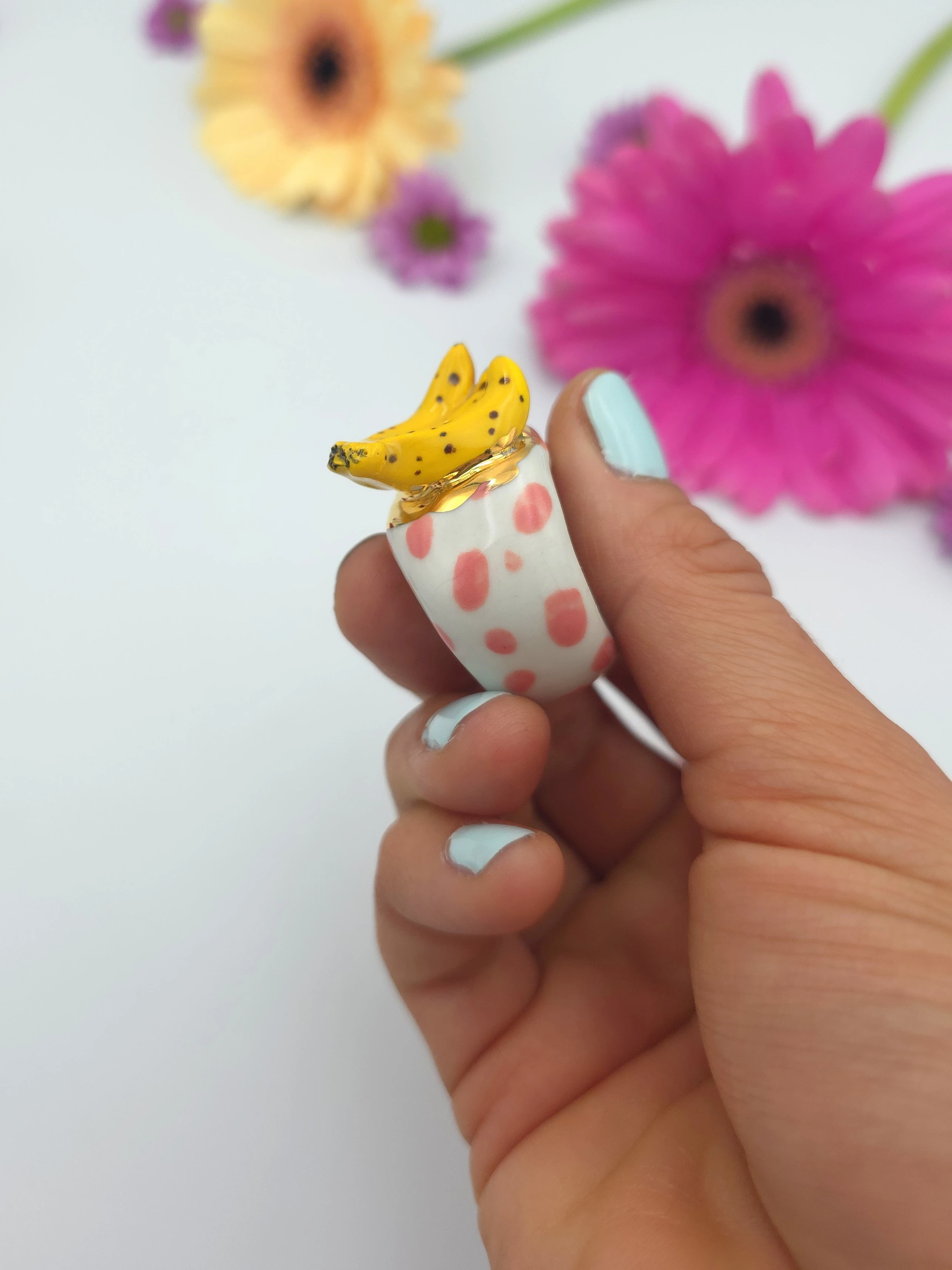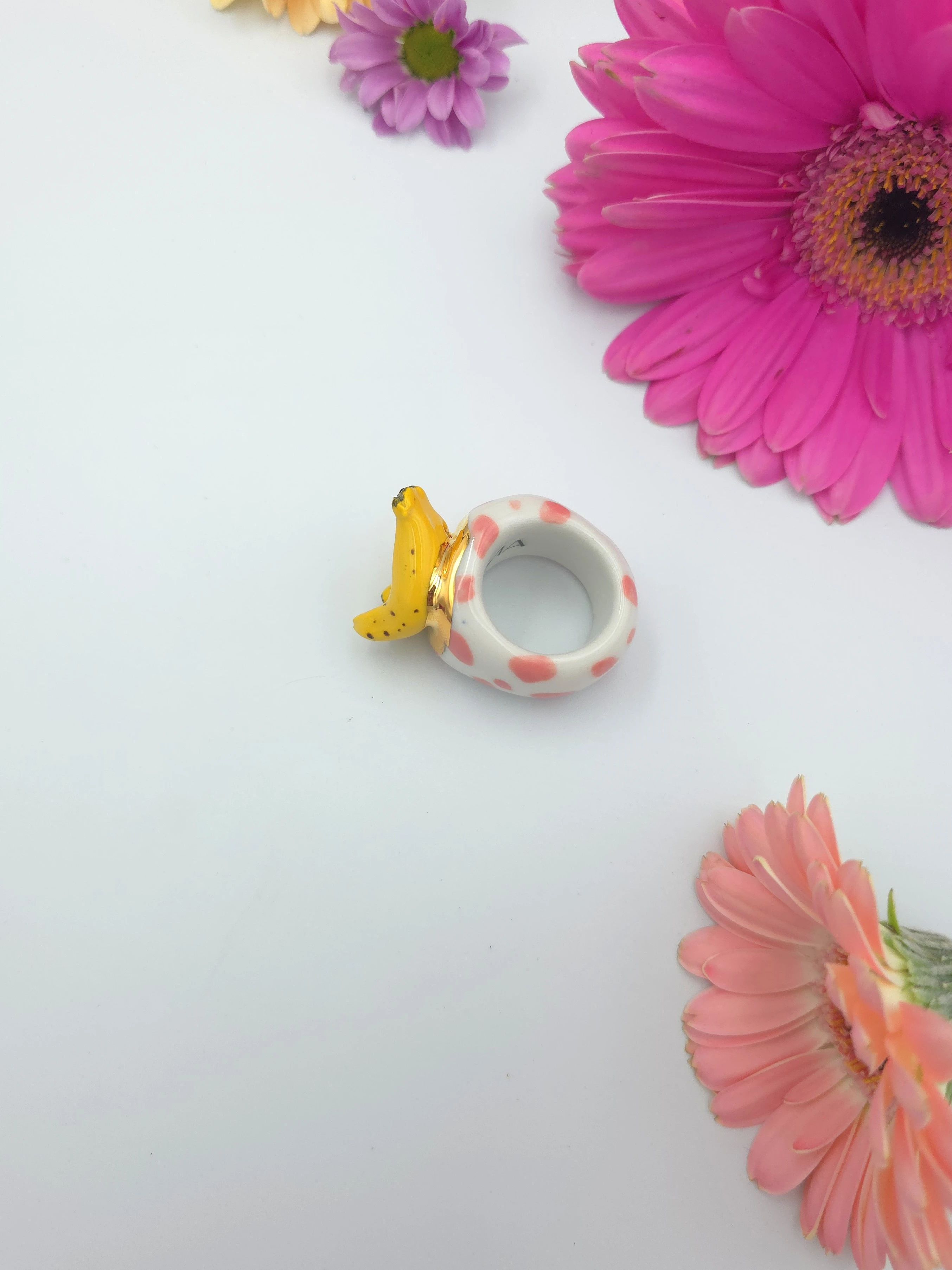 Unikatowy pierścionek z porcelany, zdobiony prawdziwym złotem.