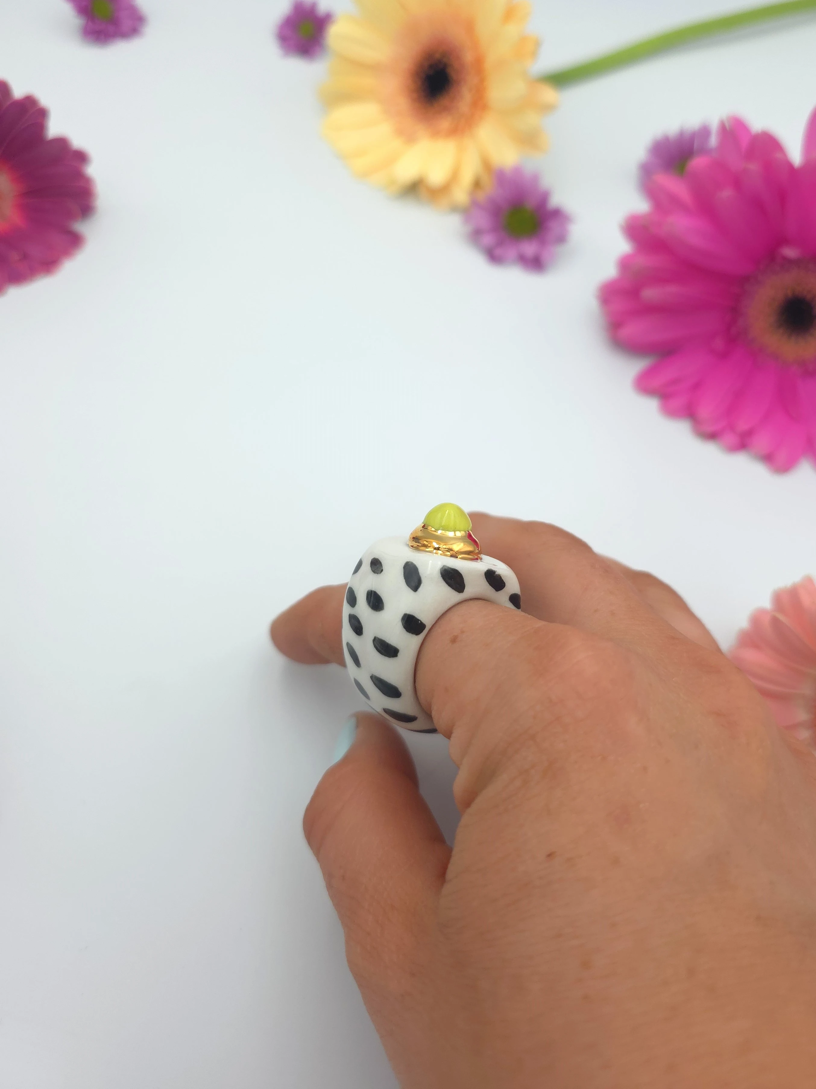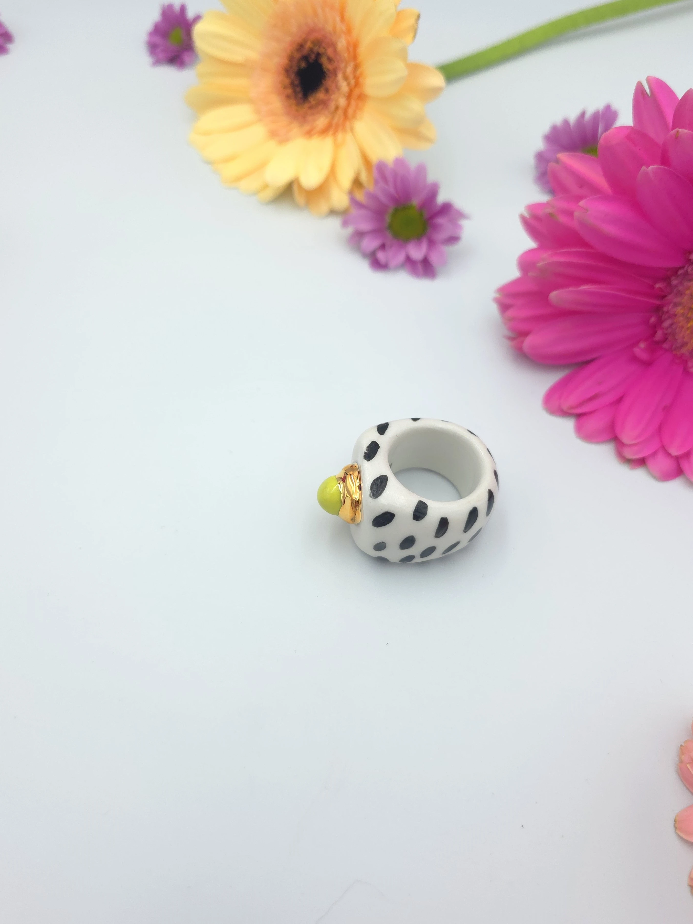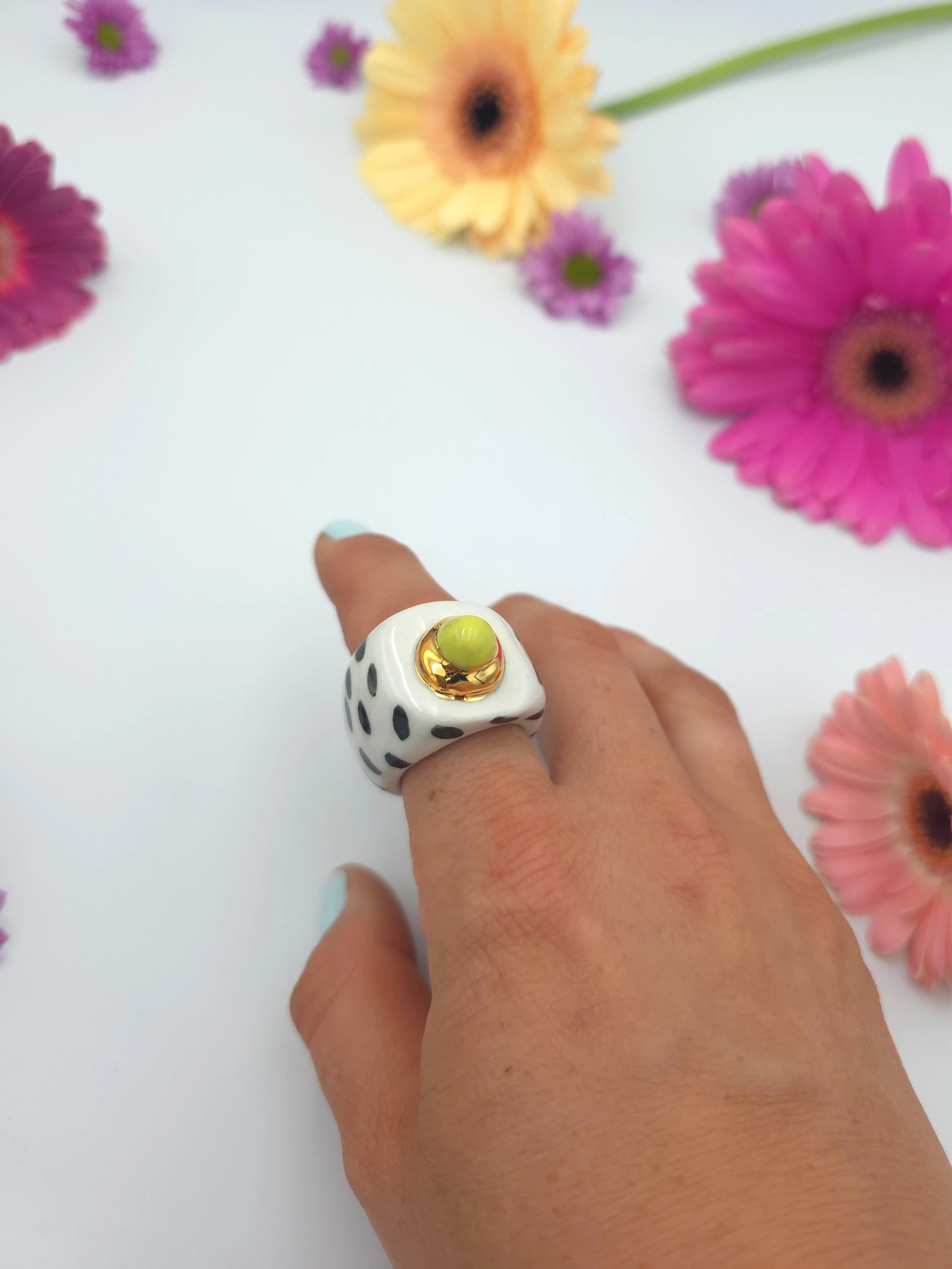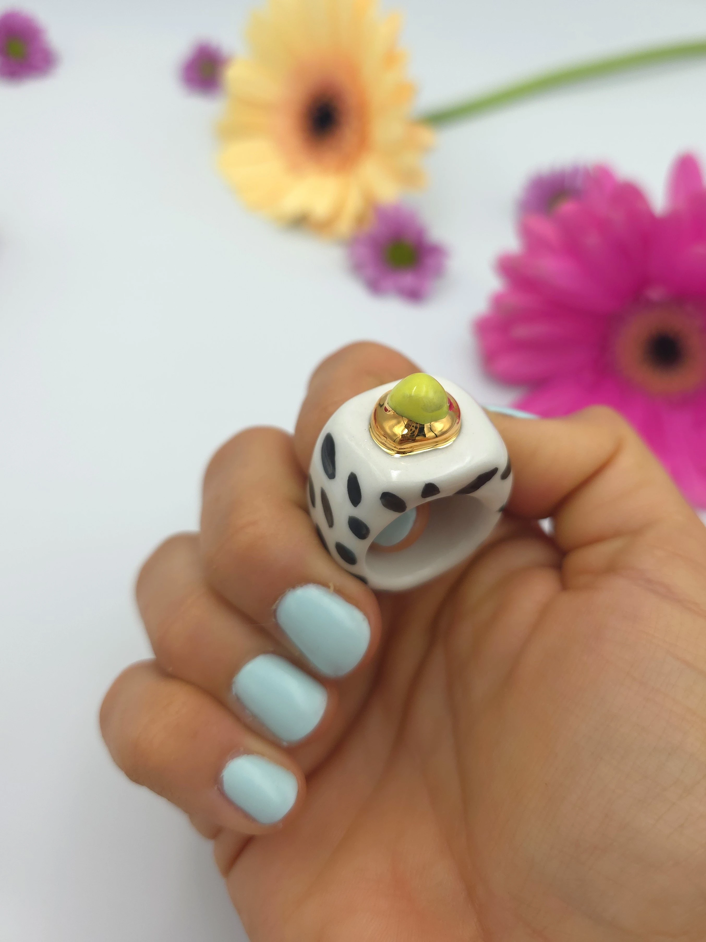 Porcelanowy pierścionek - ciapki z żółtą kuleczką