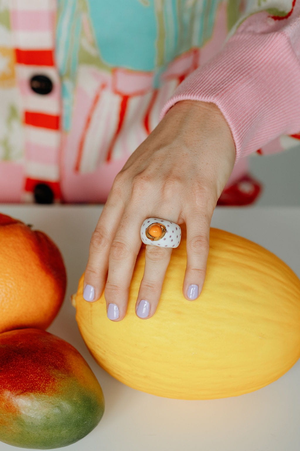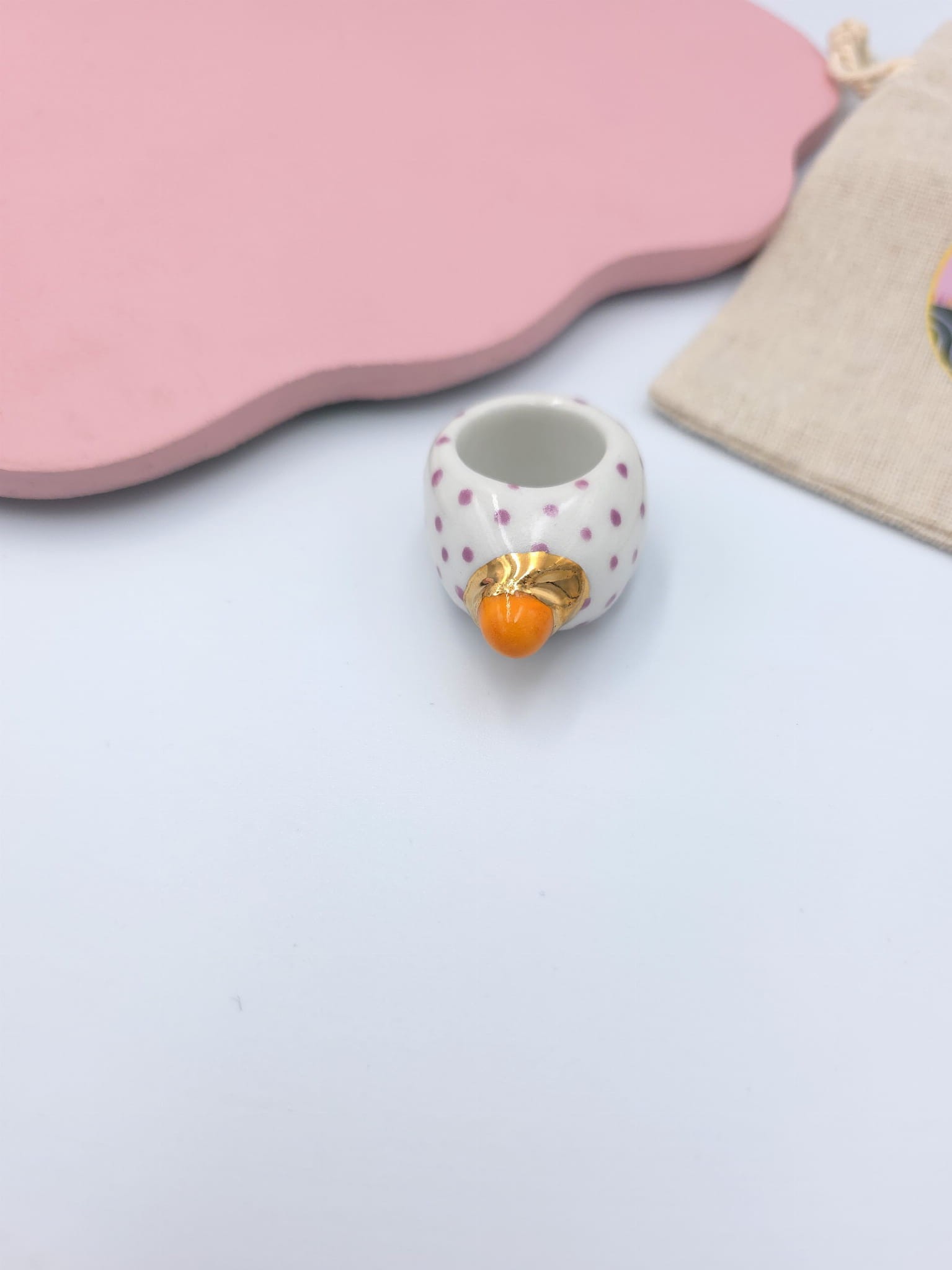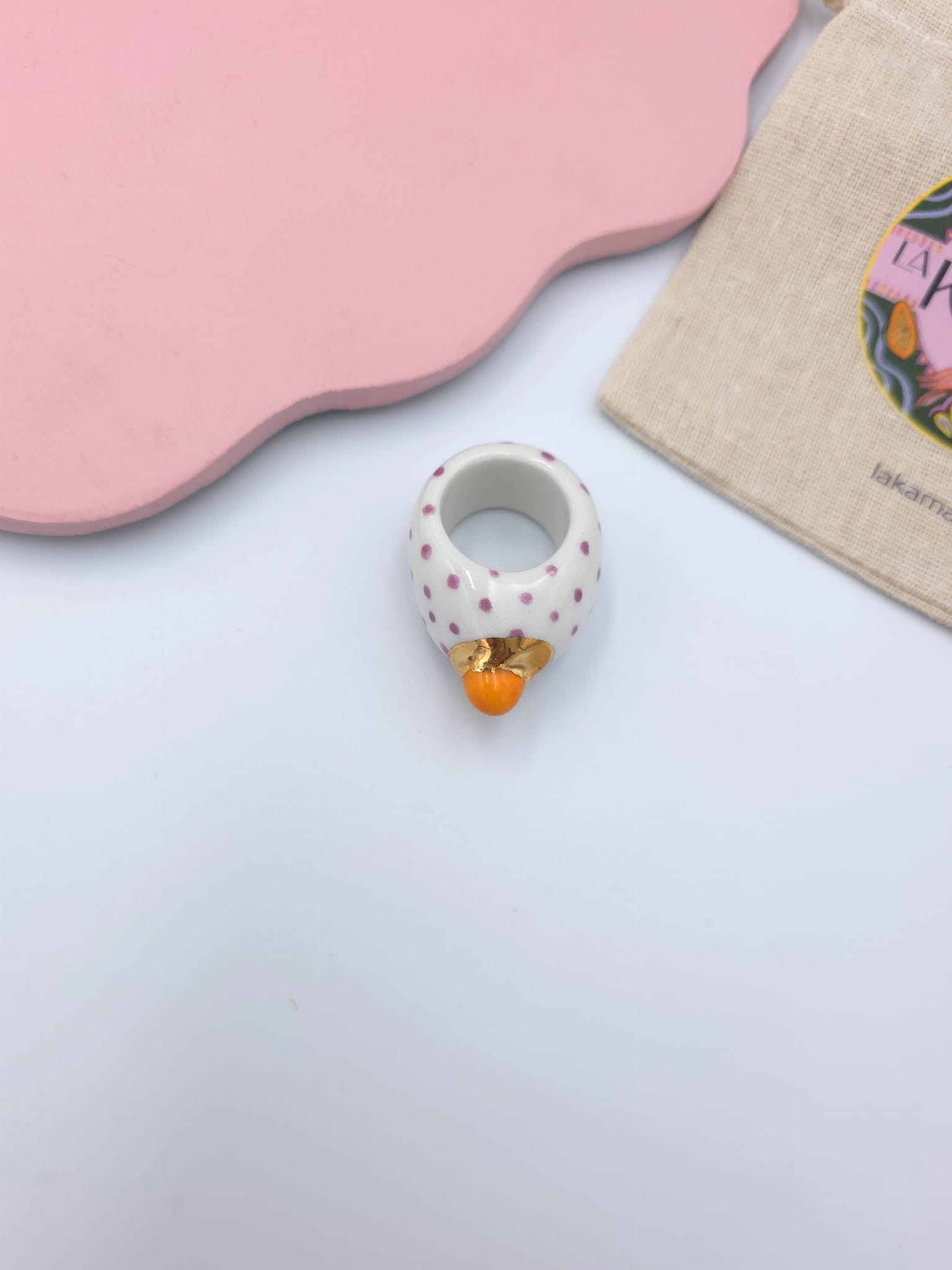 Porcelanowy pierścionek - fioletowe kropeczki z pomarańczową kulką