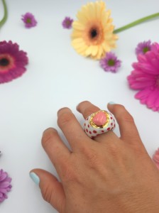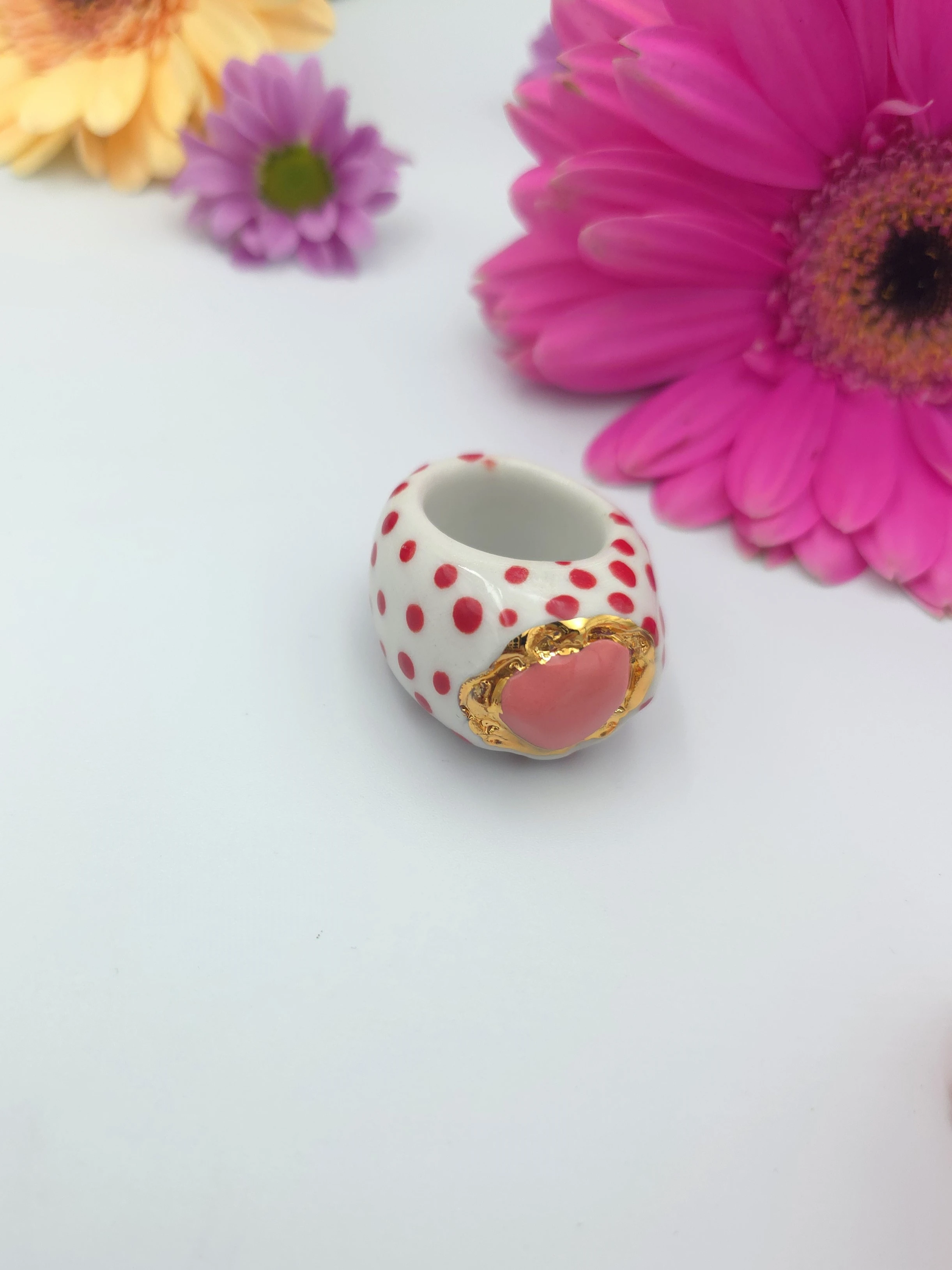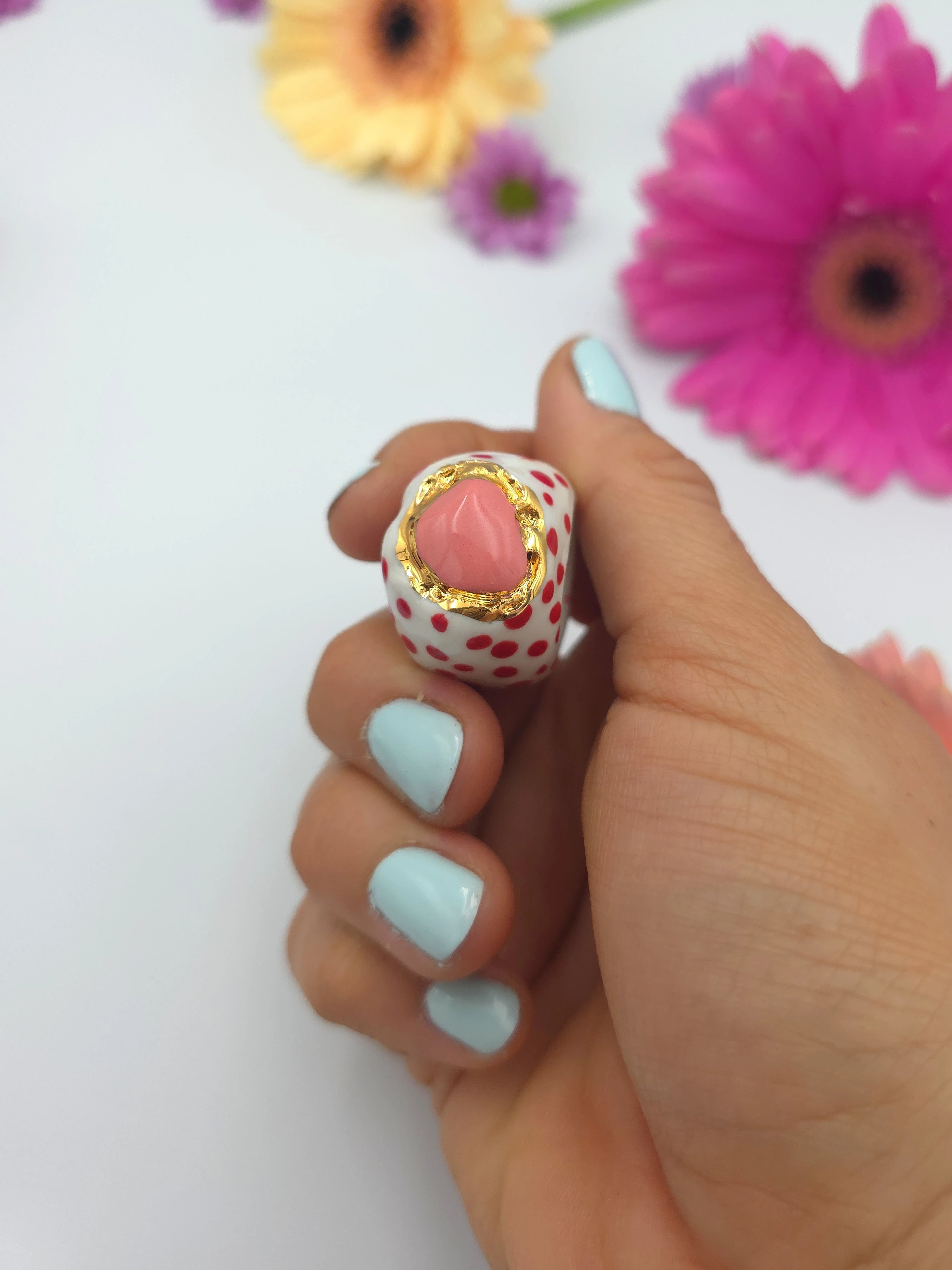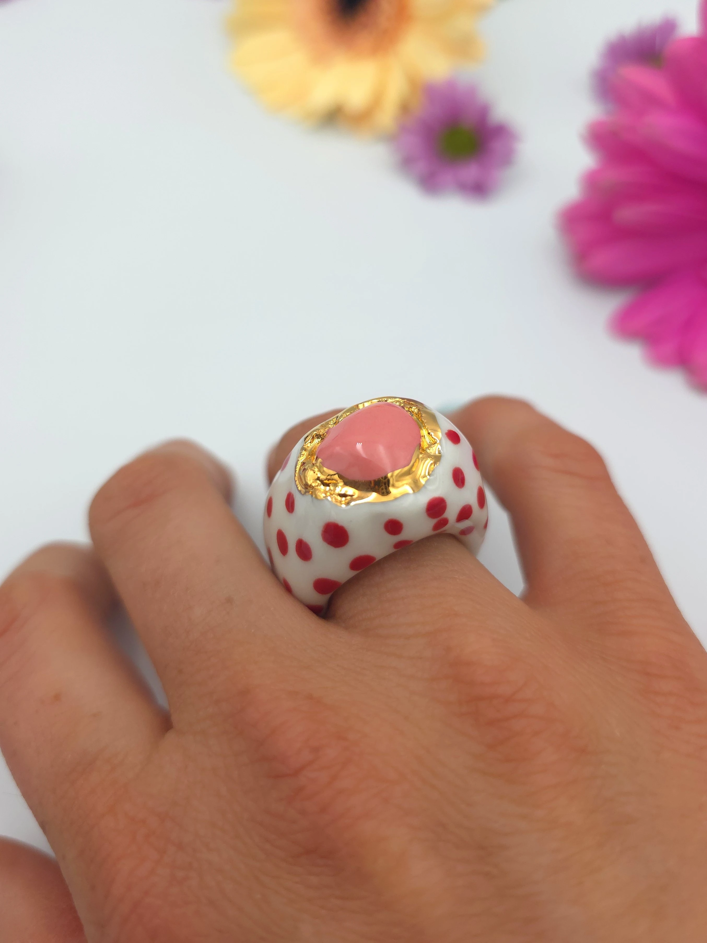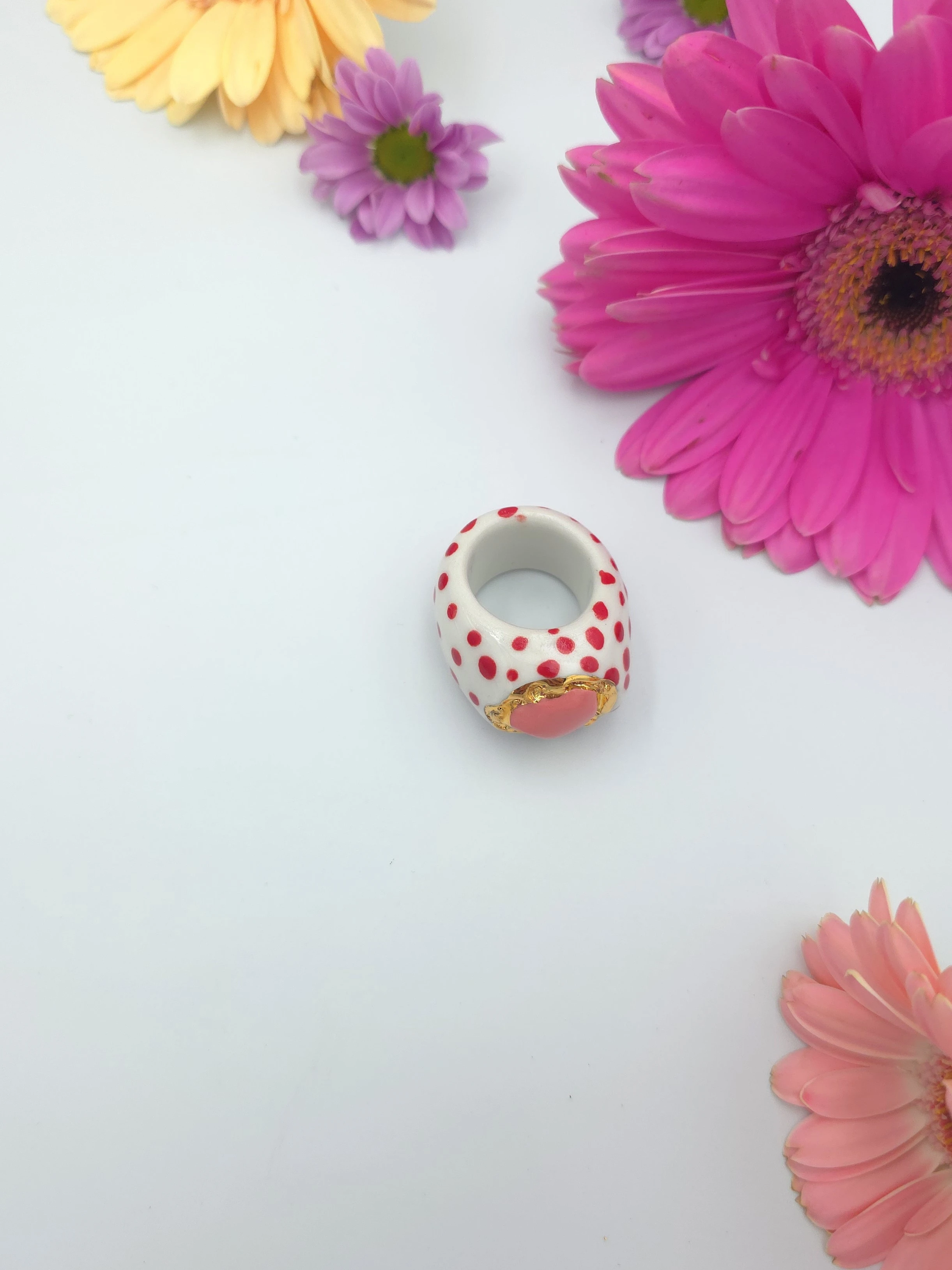Porcelanowy pierścionek - kropeczki czerwone z różowym środkiem