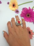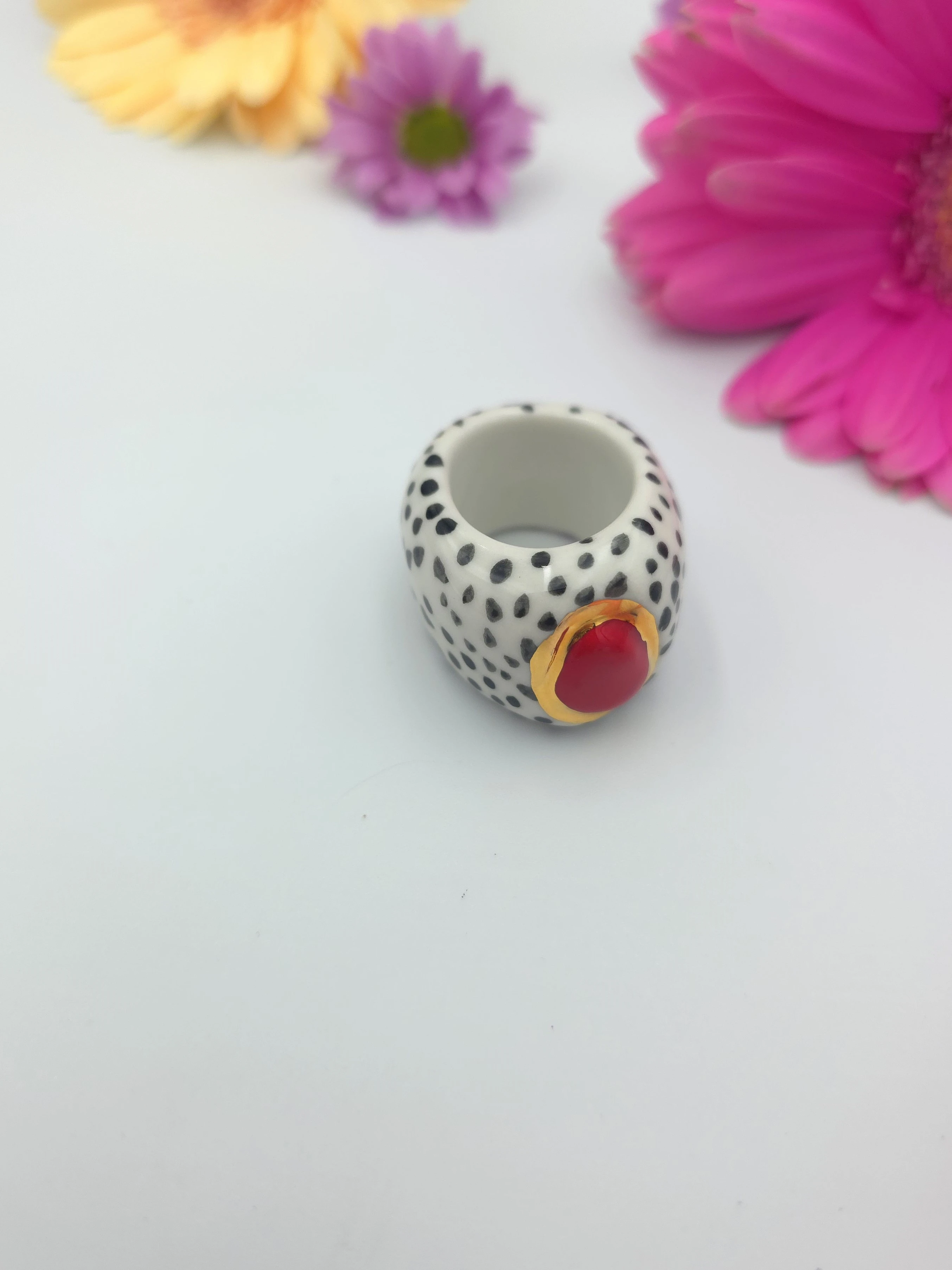 Porcelanowy pierścionek - kropeczki z czerwonym środkiem