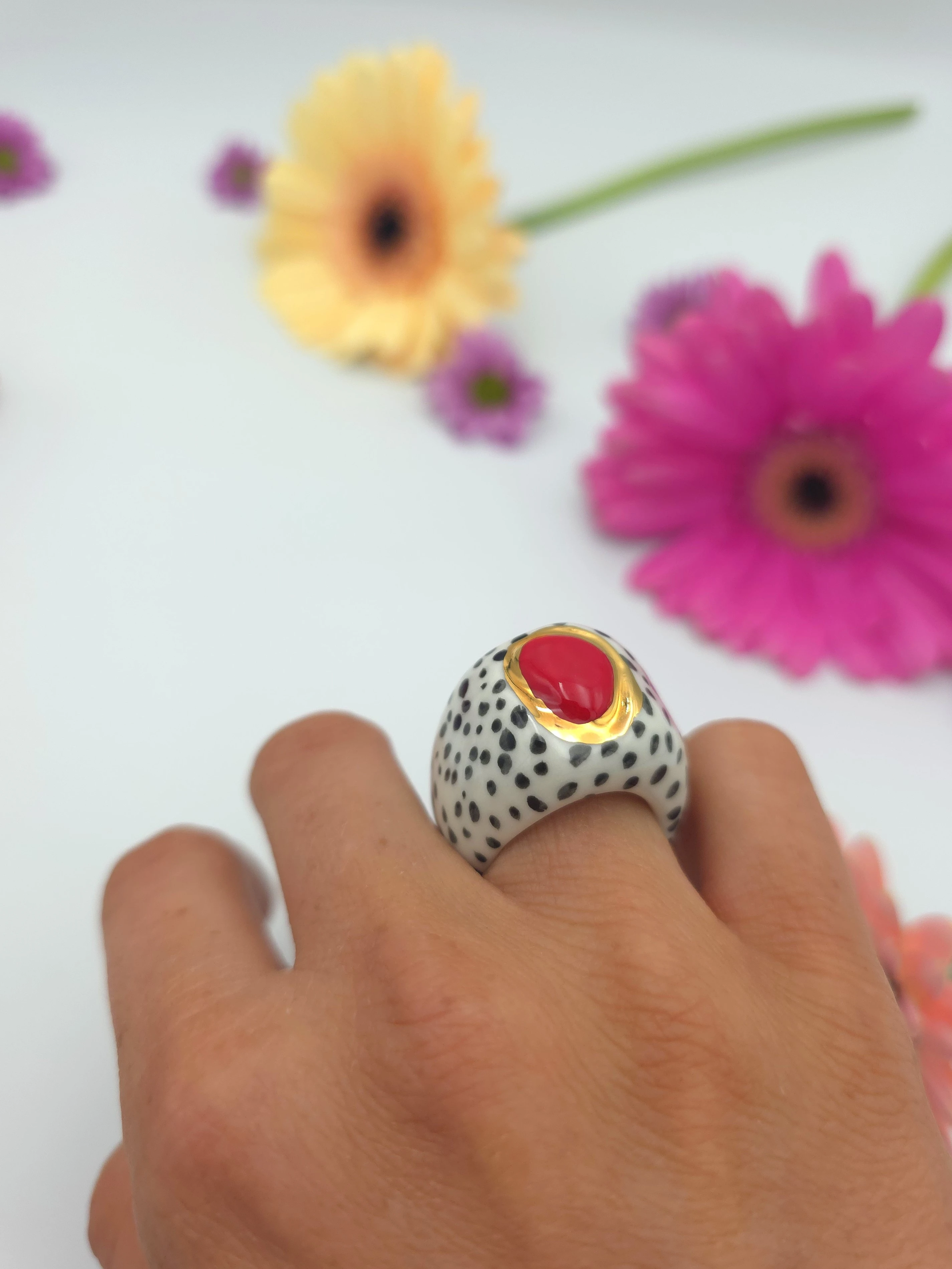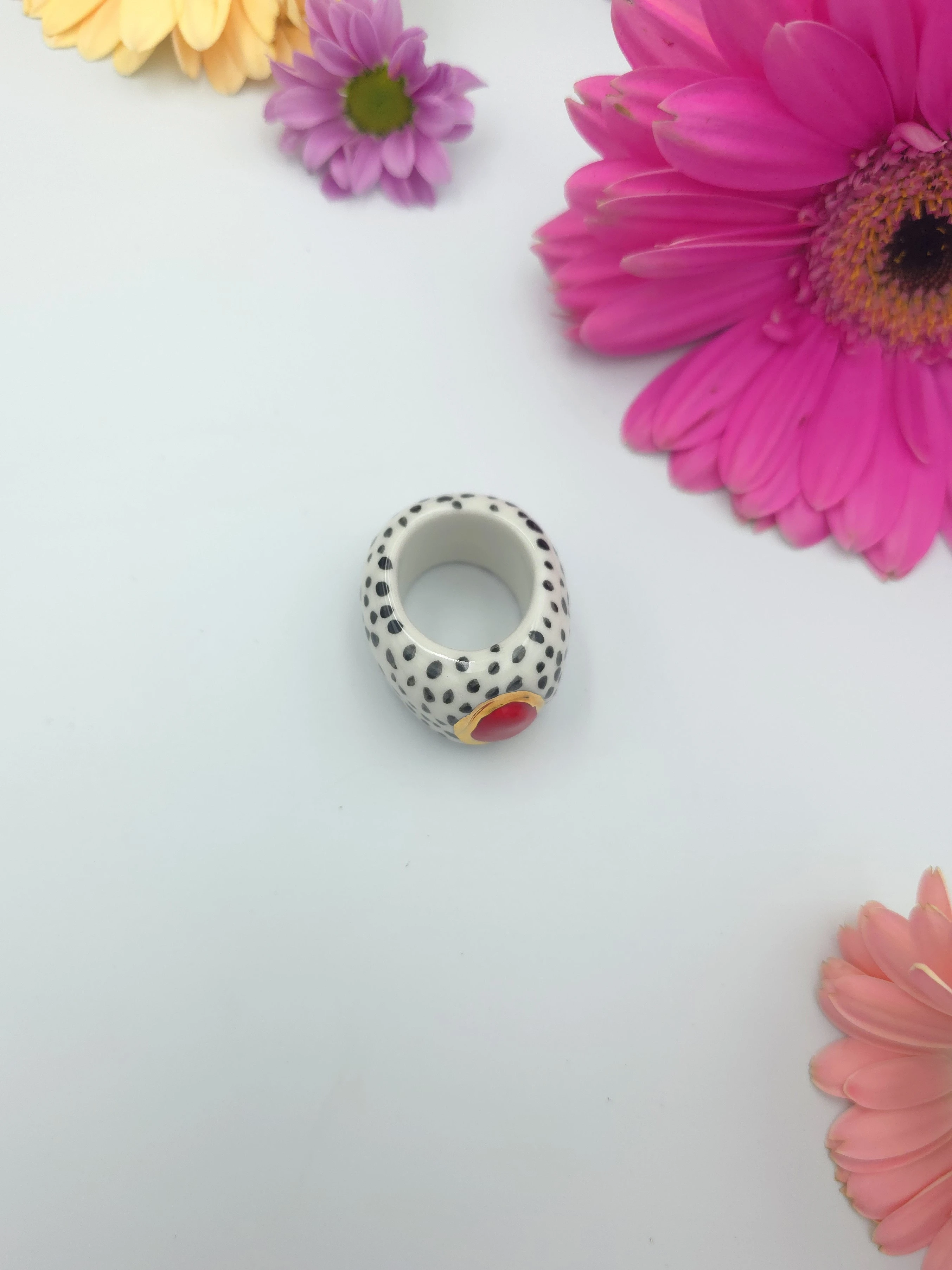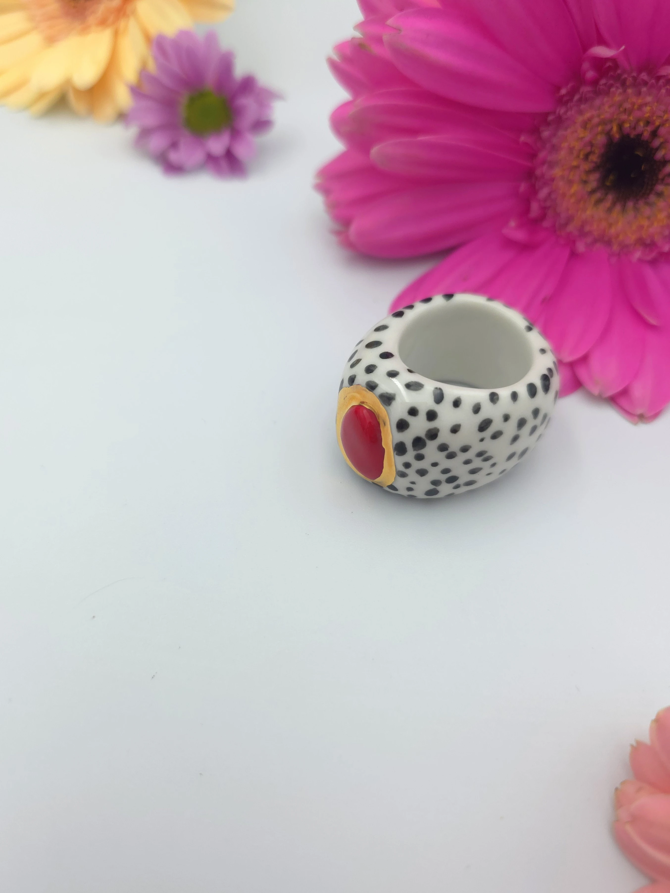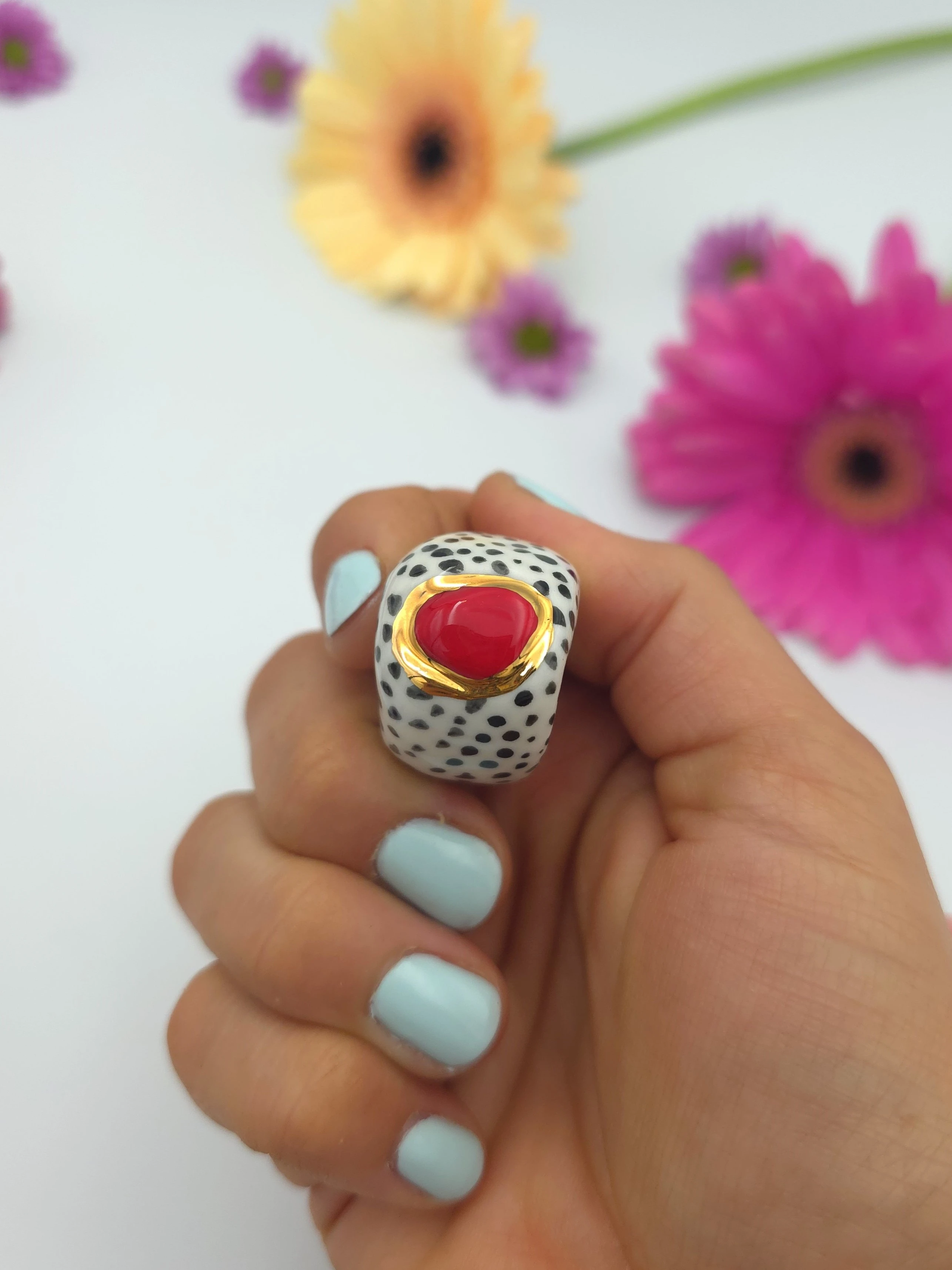 Każdy pierścionek jest ręcznie formowany, malowany i zdobiony. Wszystkie moje prace są starannie wykończone moimi rękami, co sprawia, że nie powstanie drugi taki sam egzemplarz. Pierścionki z porcelany są lekkie i łatwe w noszeniu.