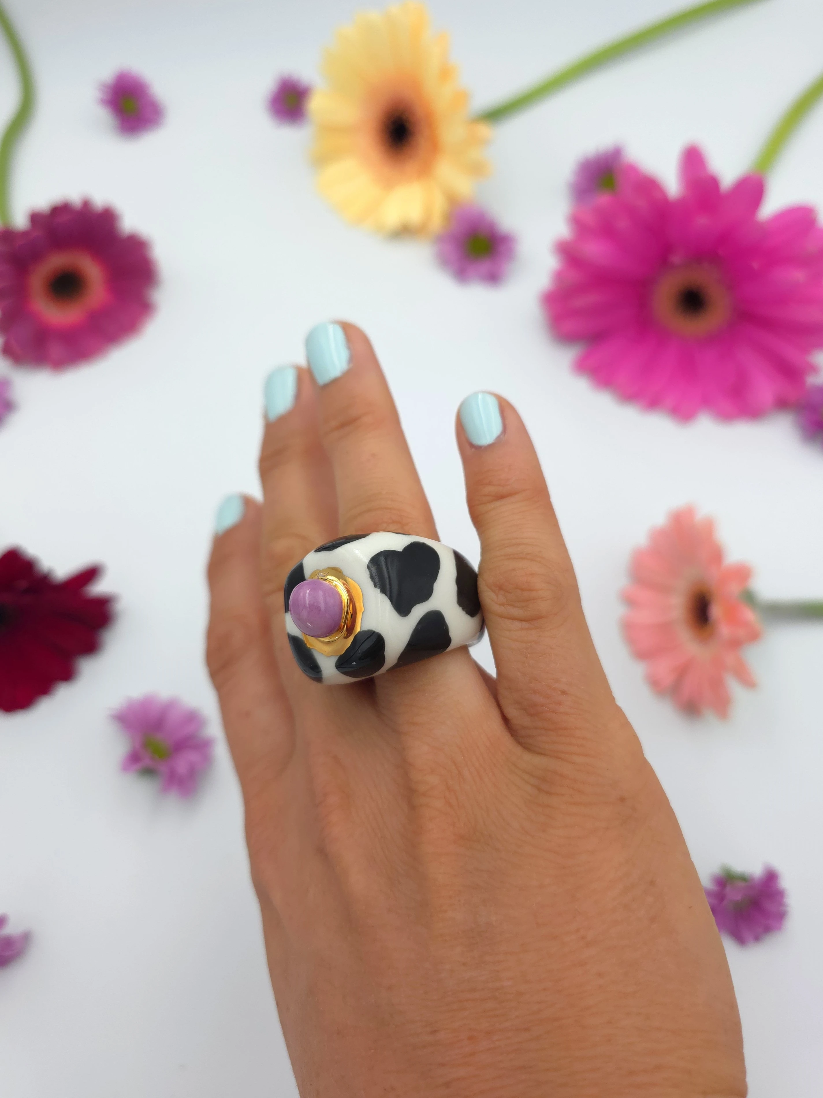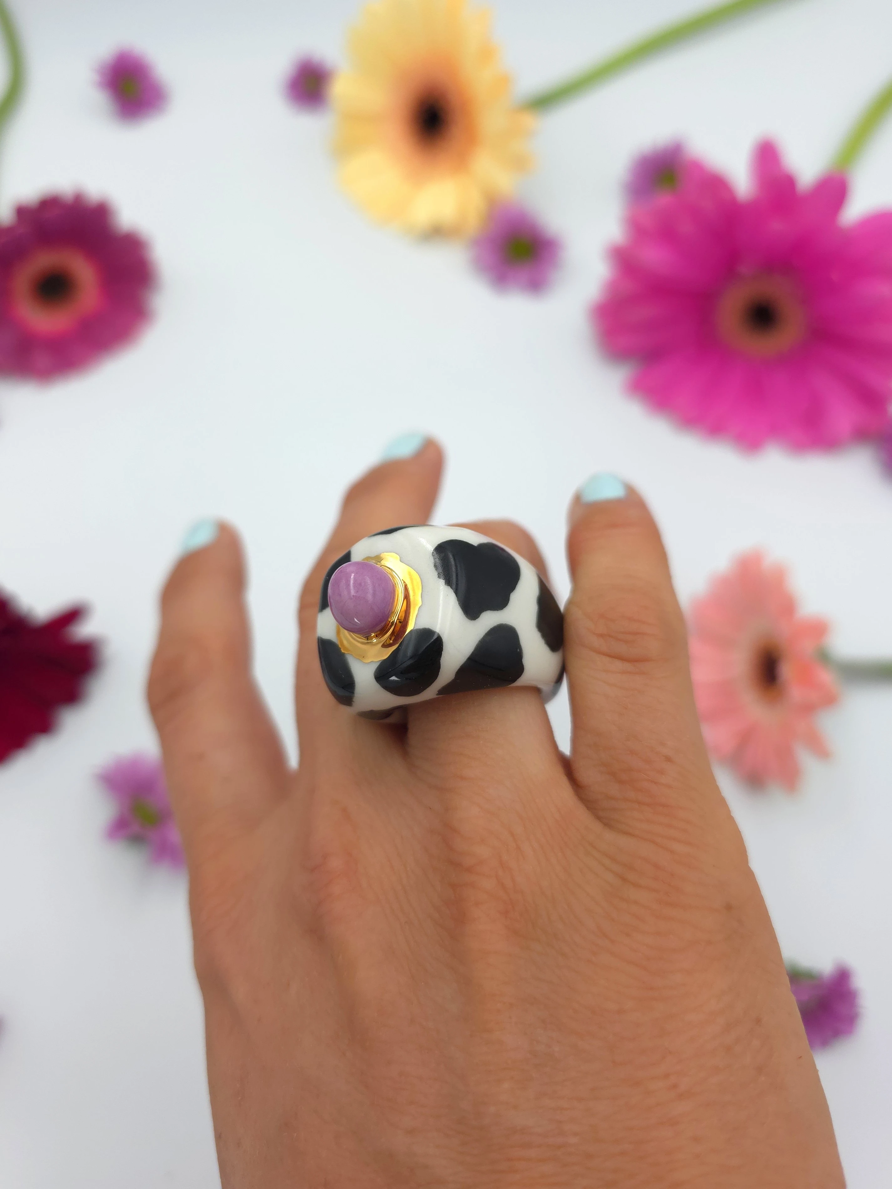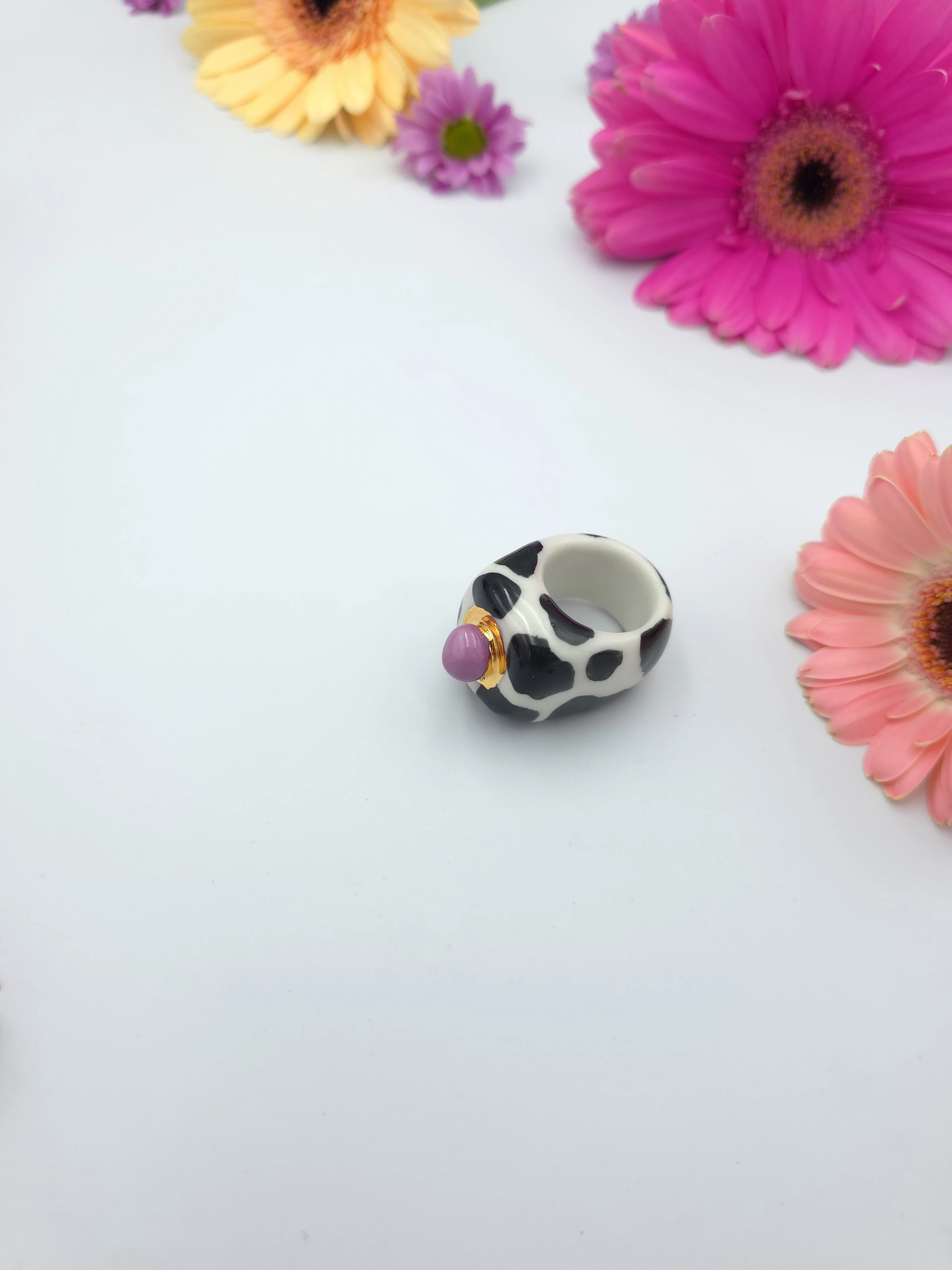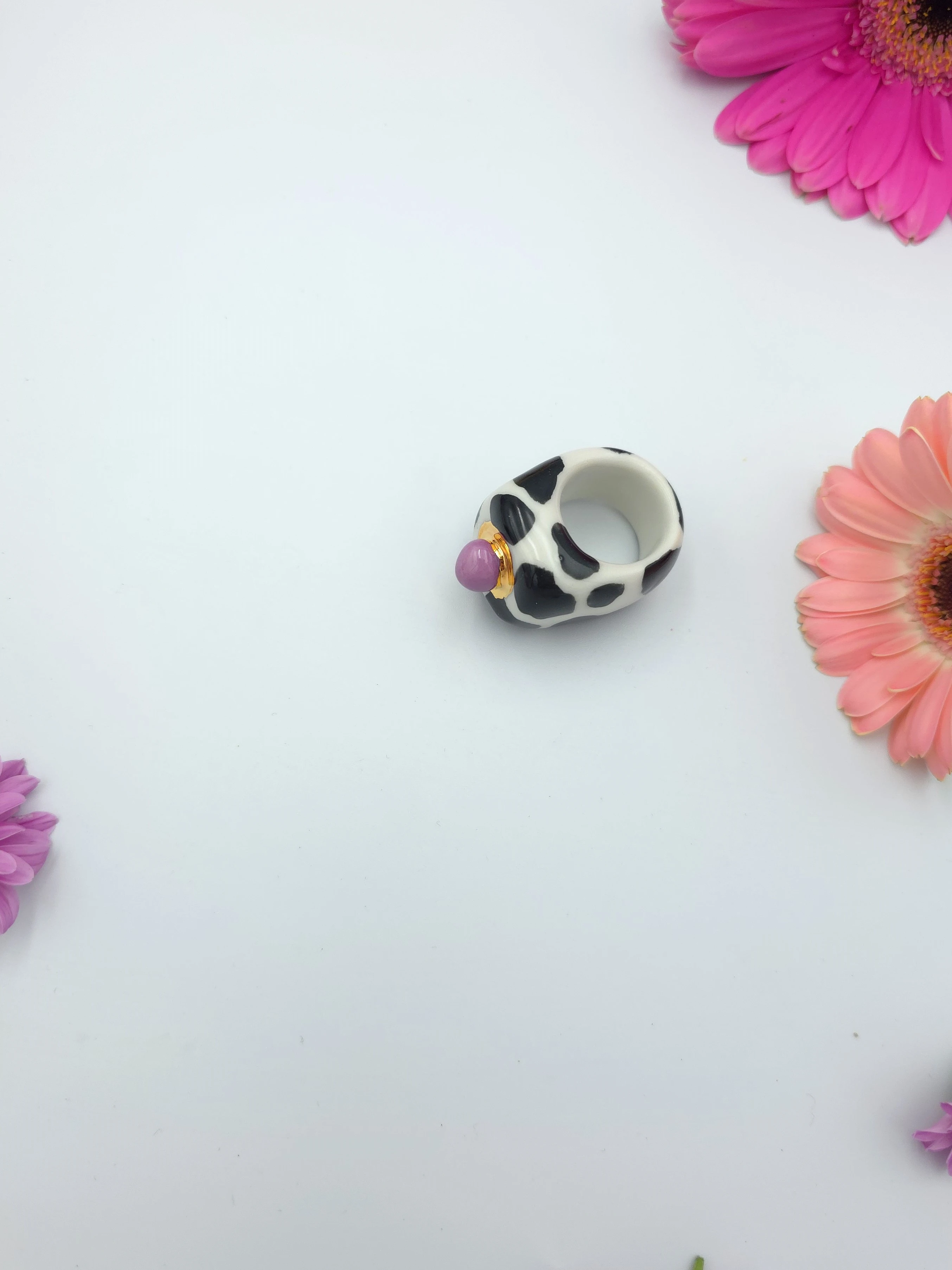 Porcelanowy pierścionek - krowa z fioletową kulką