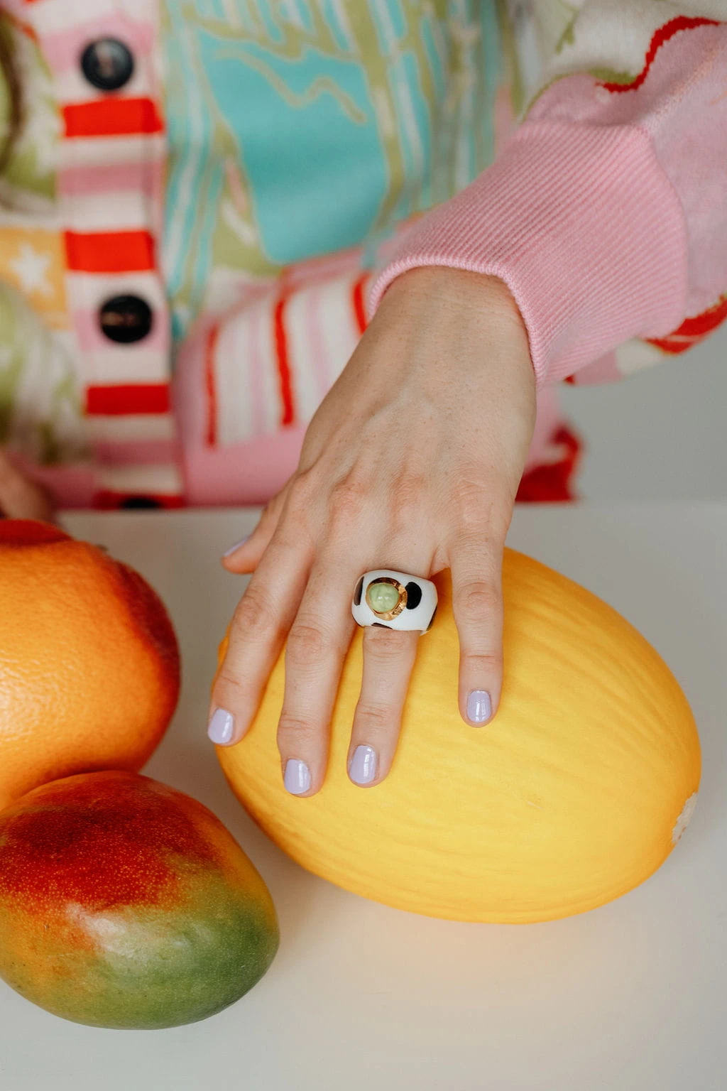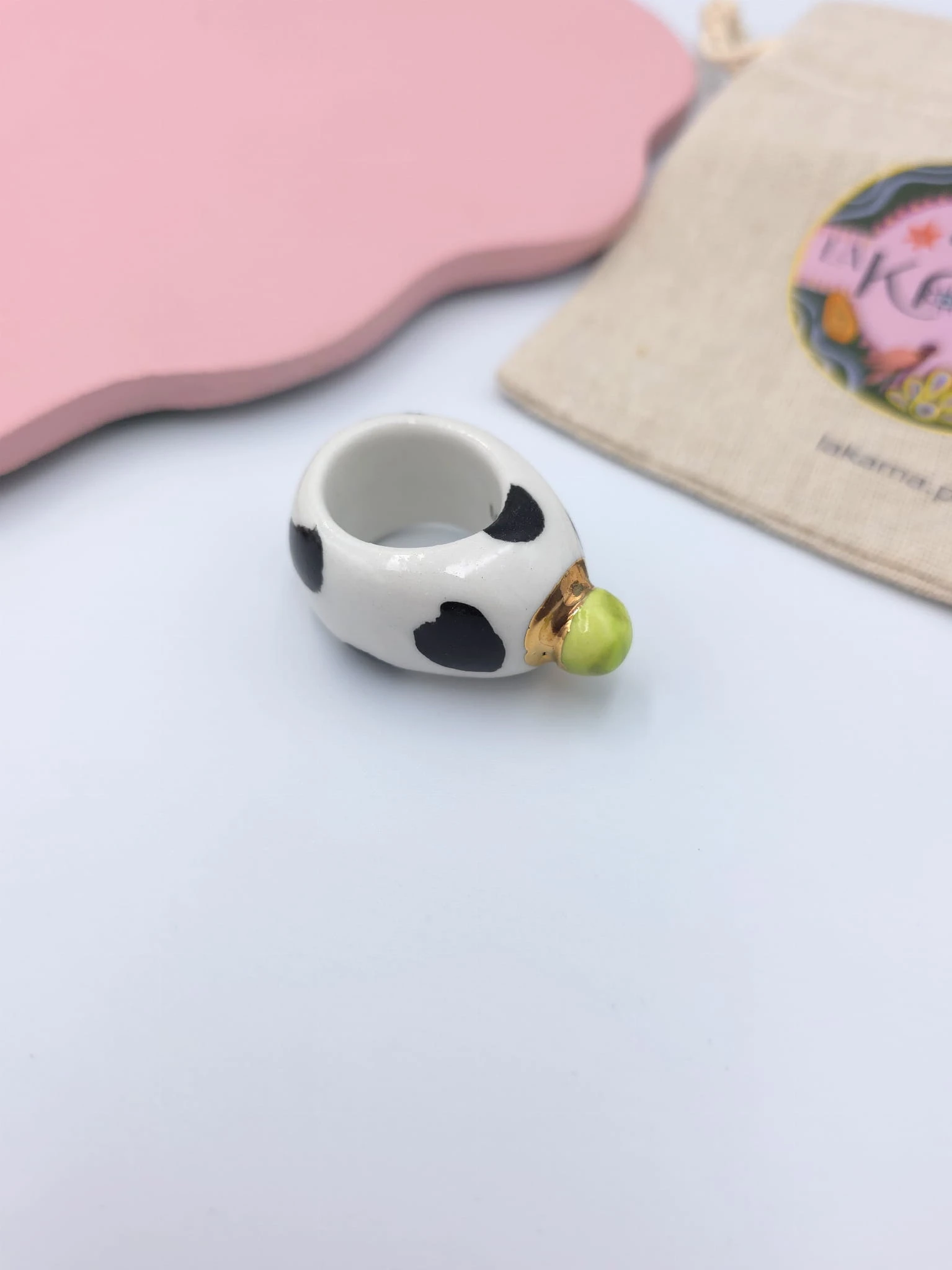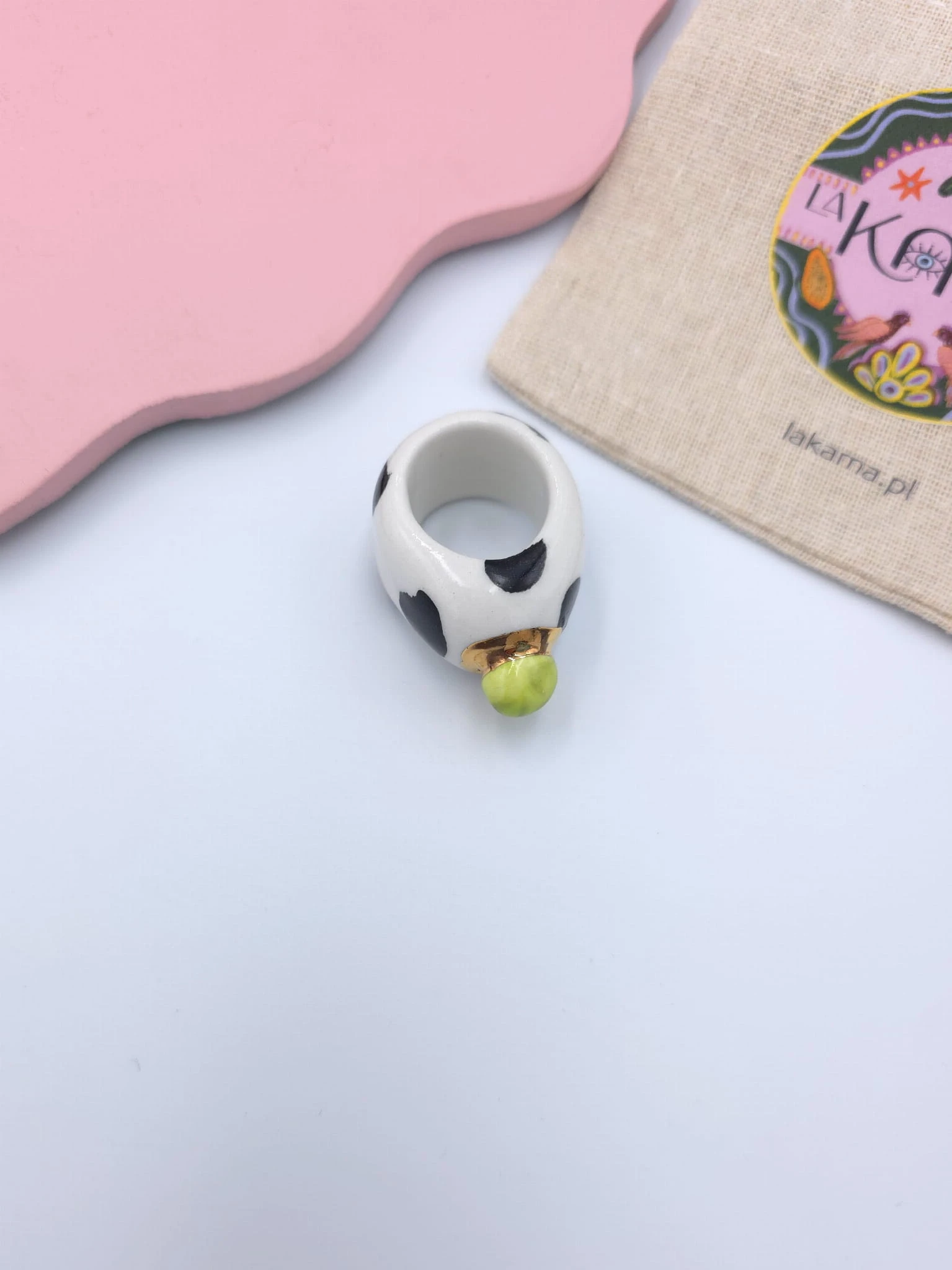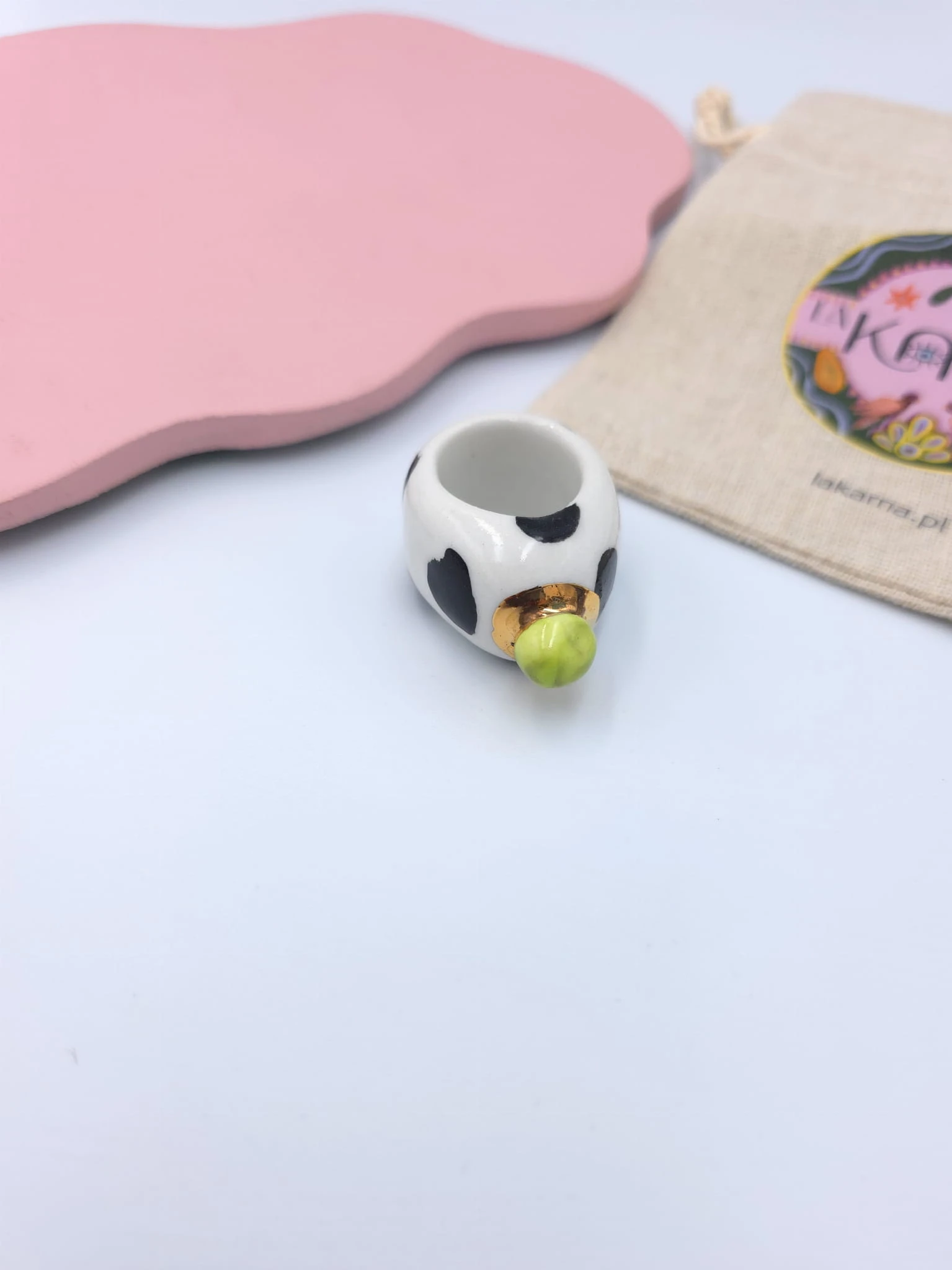 Porcelanowy pierścionek - krówka z limonkową kulką
