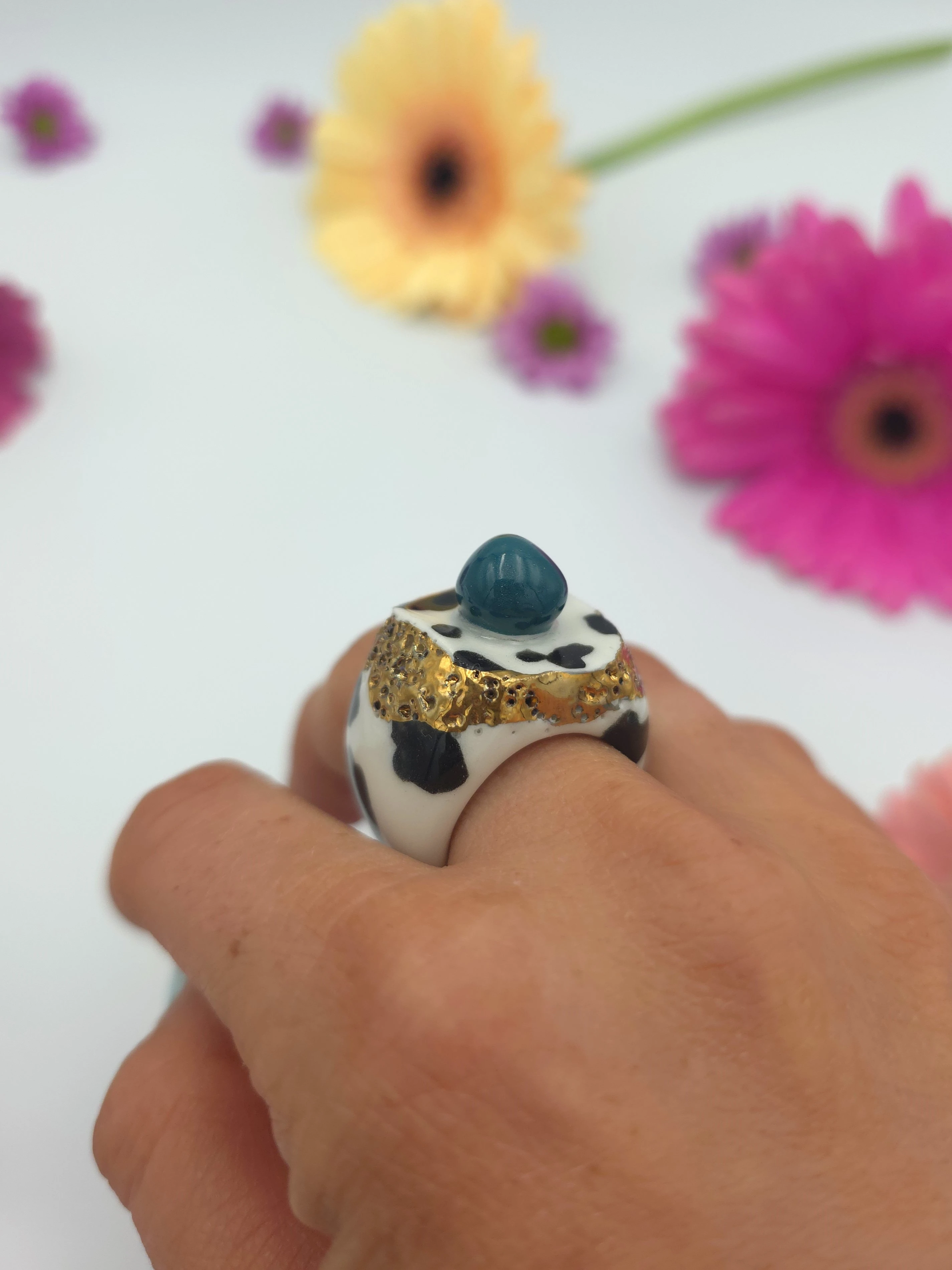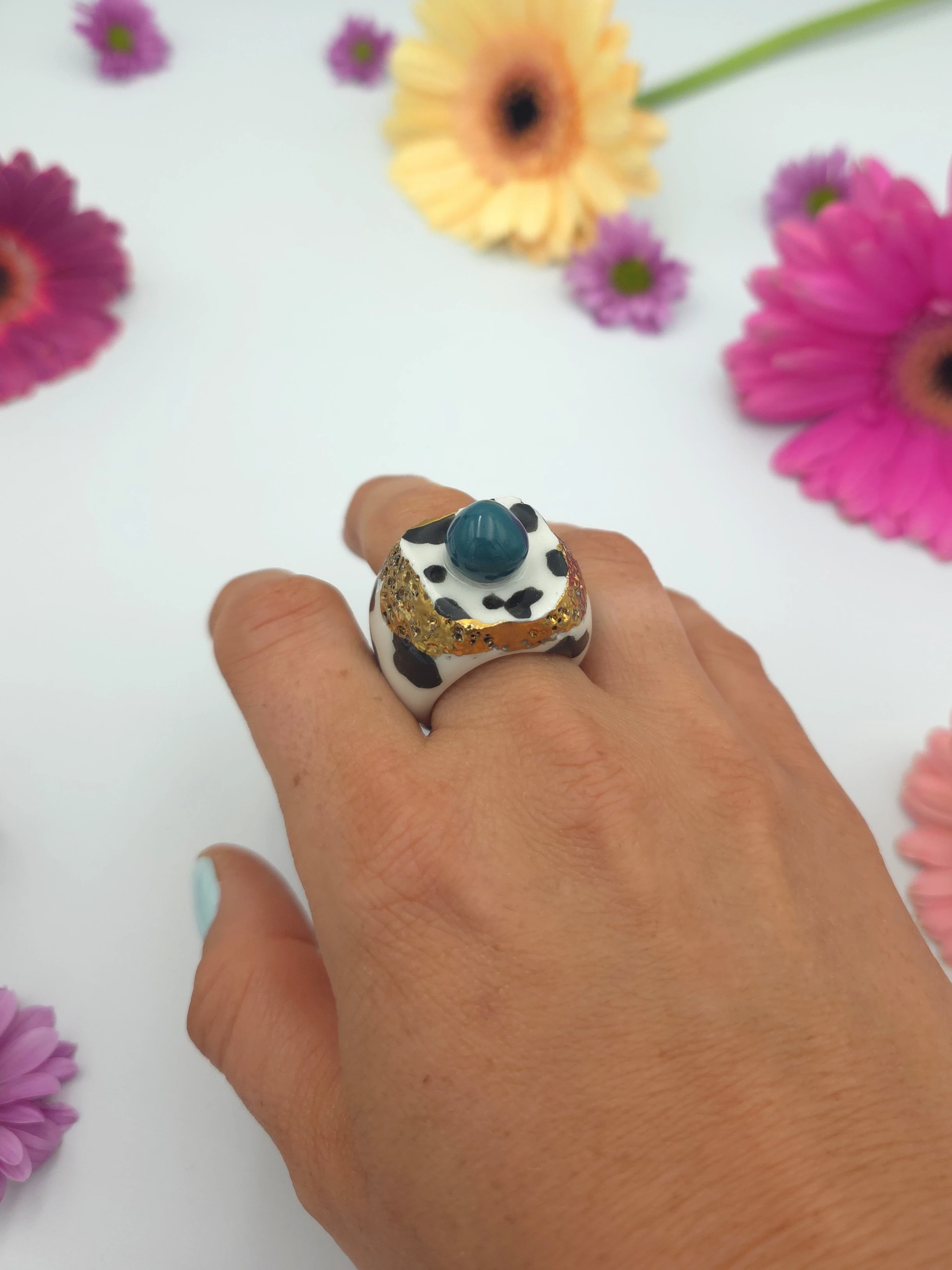 Każdy pierścionek jest ręcznie formowany, malowany i zdobiony. Wszystkie moje prace są starannie wykończone moimi rękami, co sprawia, że nie powstanie drugi taki sam egzemplarz. Pierścionki z porcelany są lekkie i łatwe w noszeniu.
