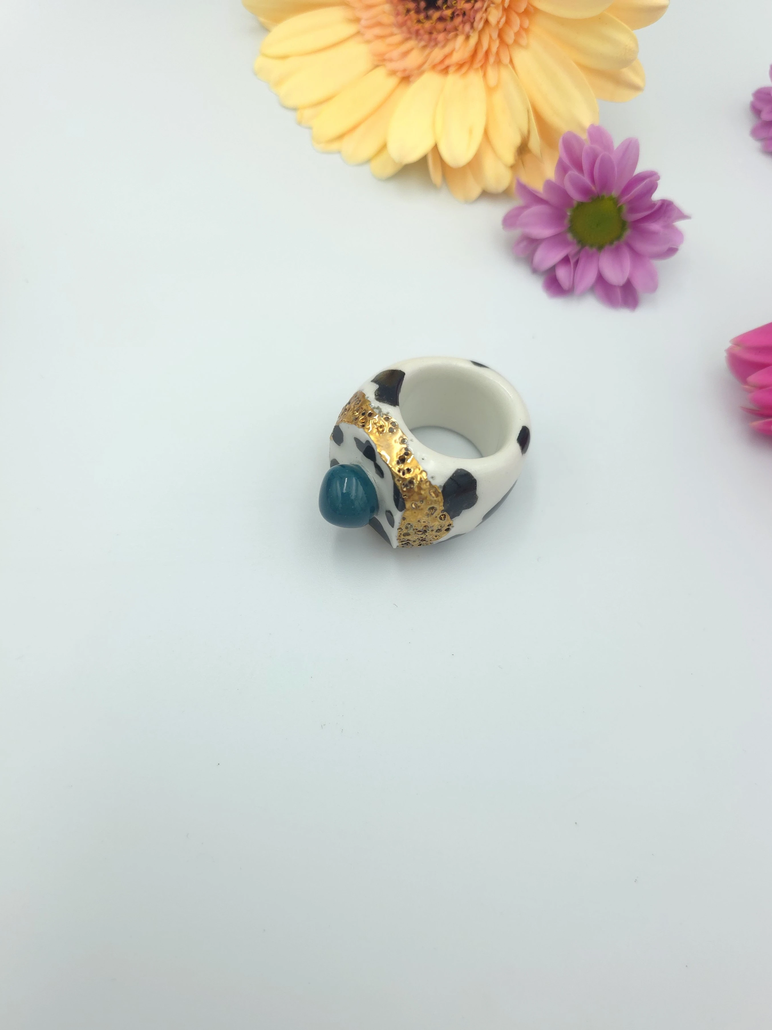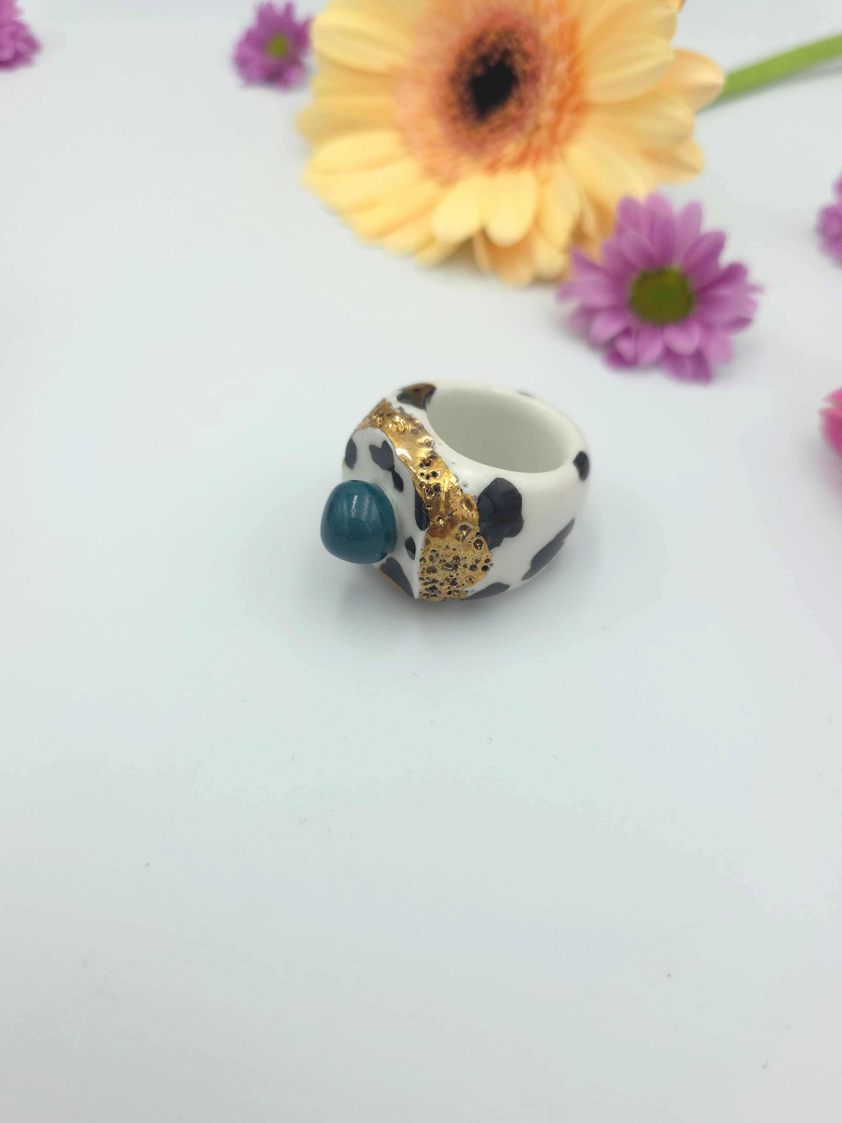 Unikatowy pierścionek z porcelany, zdobiony prawdziwym złotem.