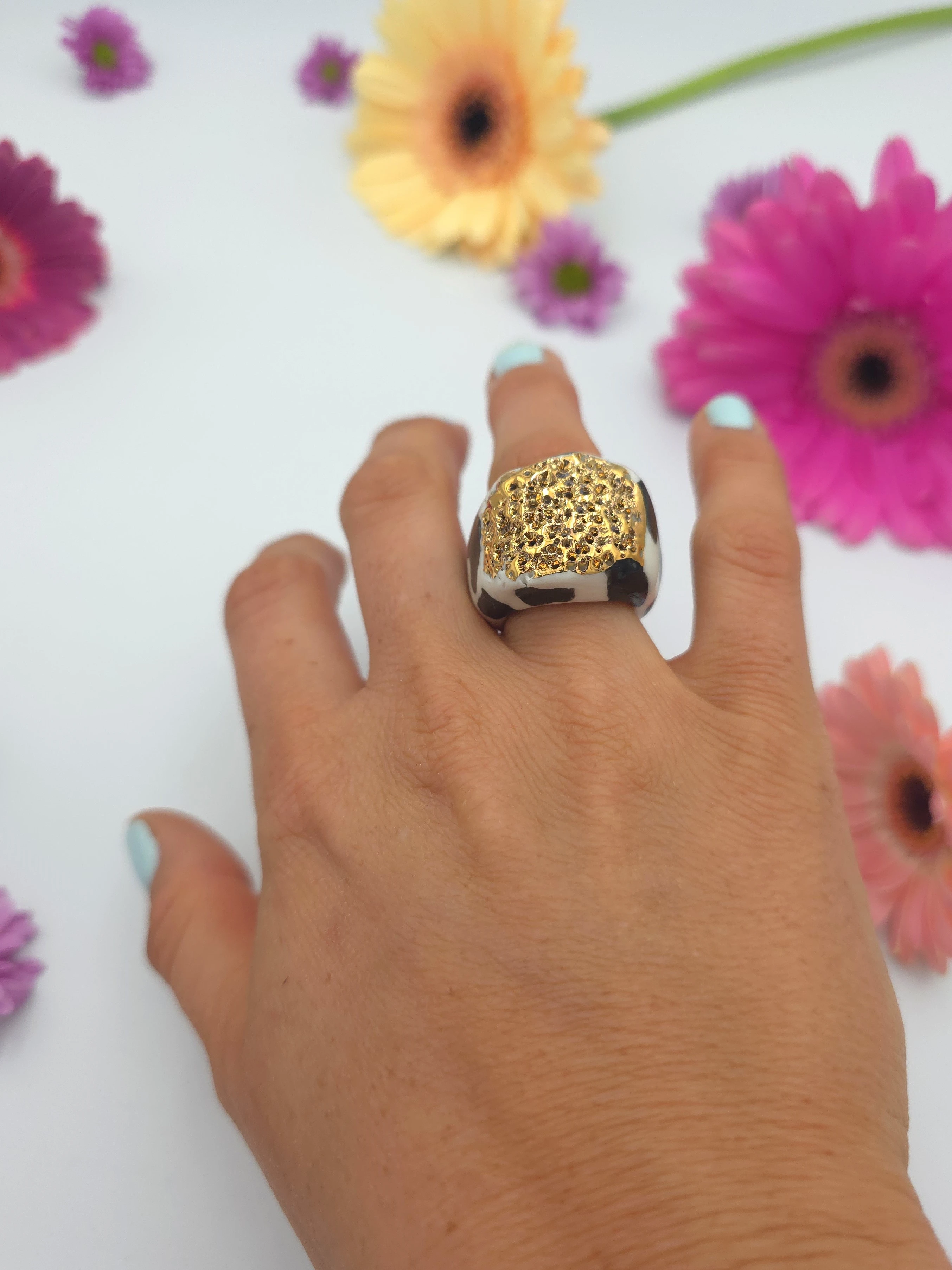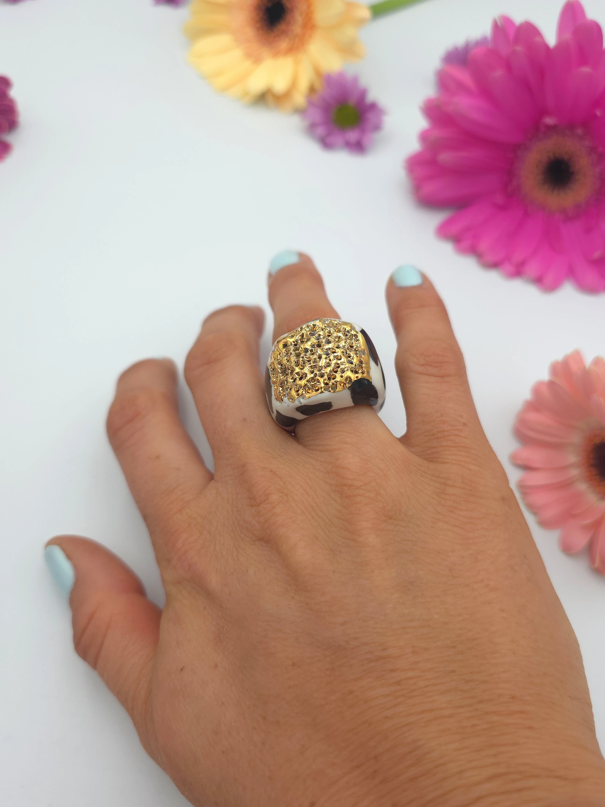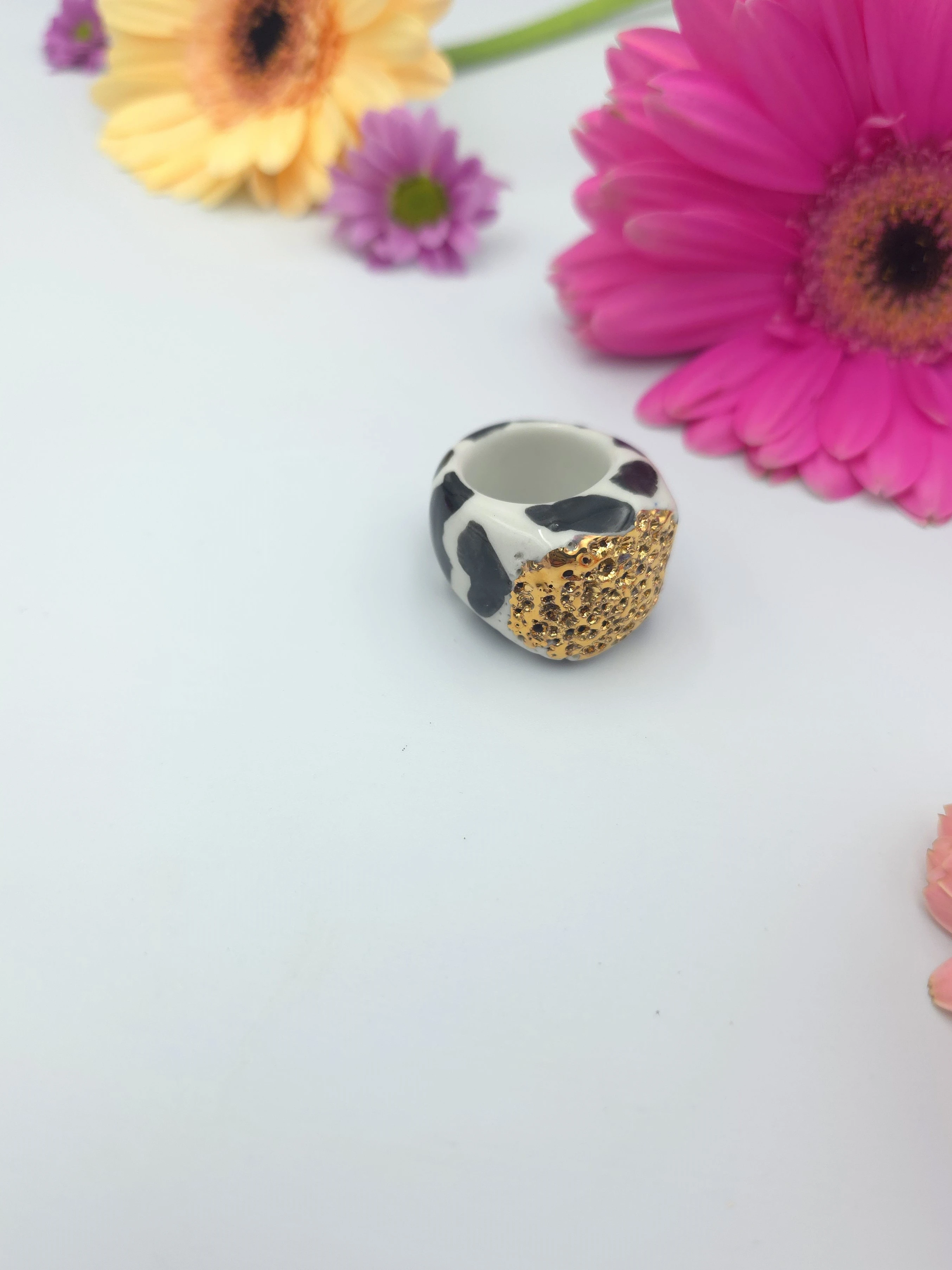 Unikatowy pierścionek z porcelany, zdobiony prawdziwym złotem.