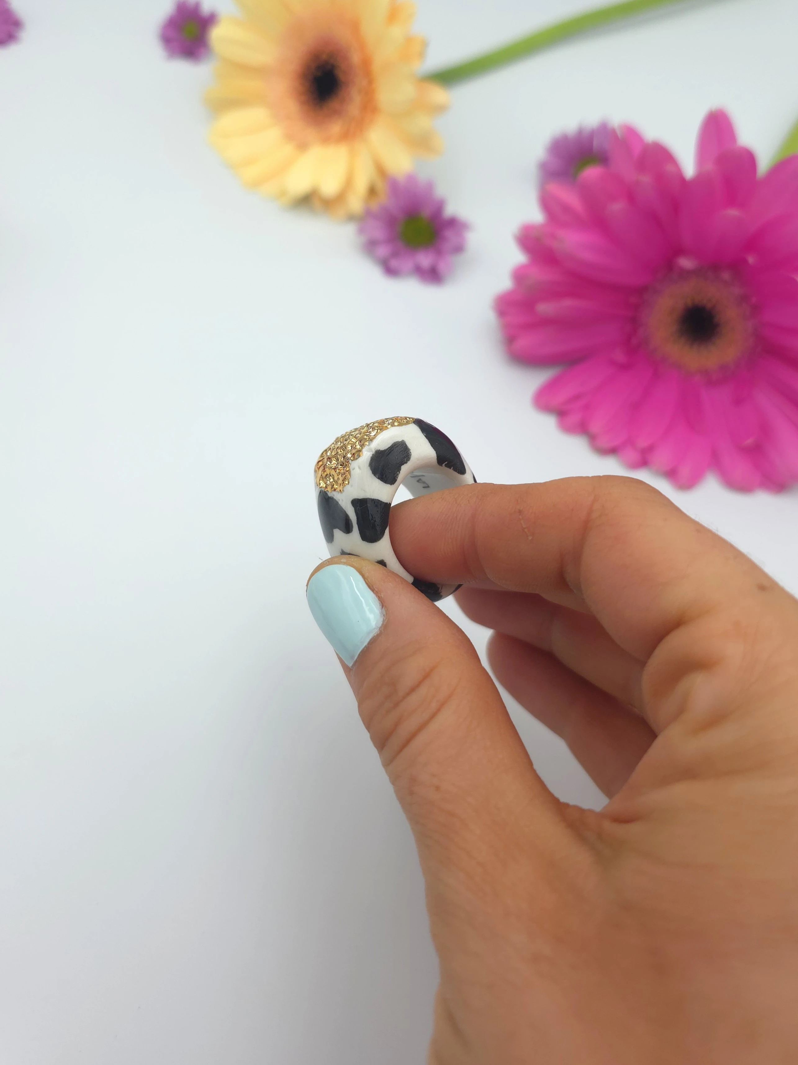 Każdy pierścionek jest ręcznie formowany, malowany i zdobiony. Wszystkie moje prace są starannie wykończone moimi rękami, co sprawia, że nie powstanie drugi taki sam egzemplarz. Pierścionki z porcelany są lekkie i łatwe w noszeniu.