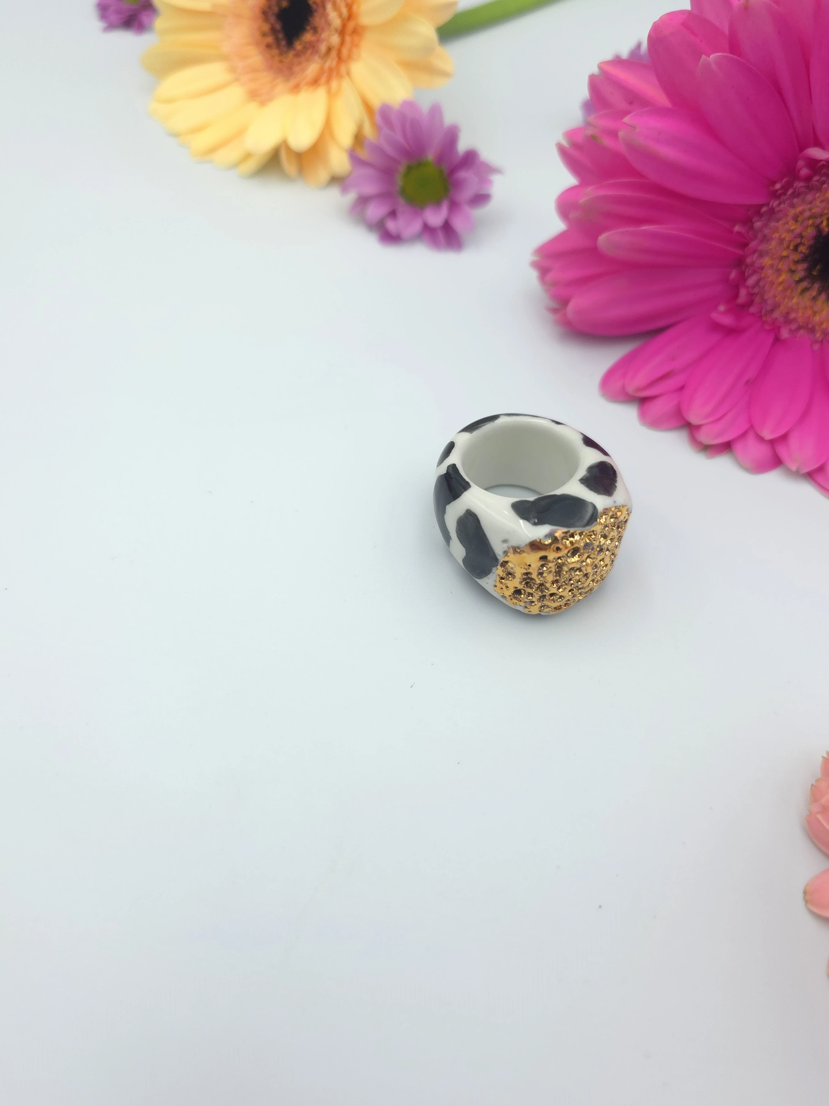Porcelanowy pierścionek - krówka ze złotem