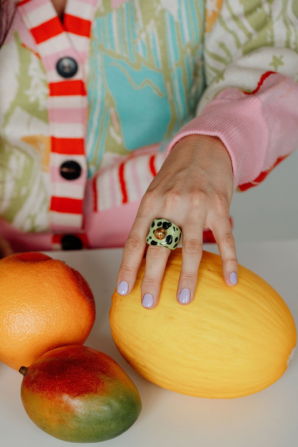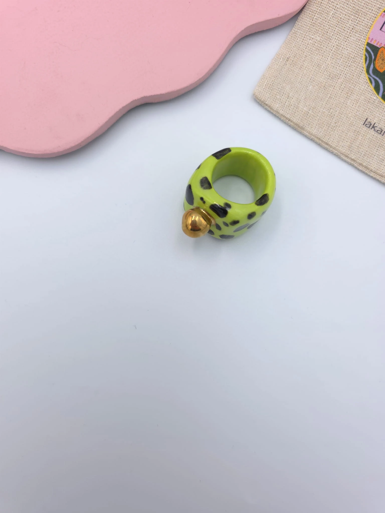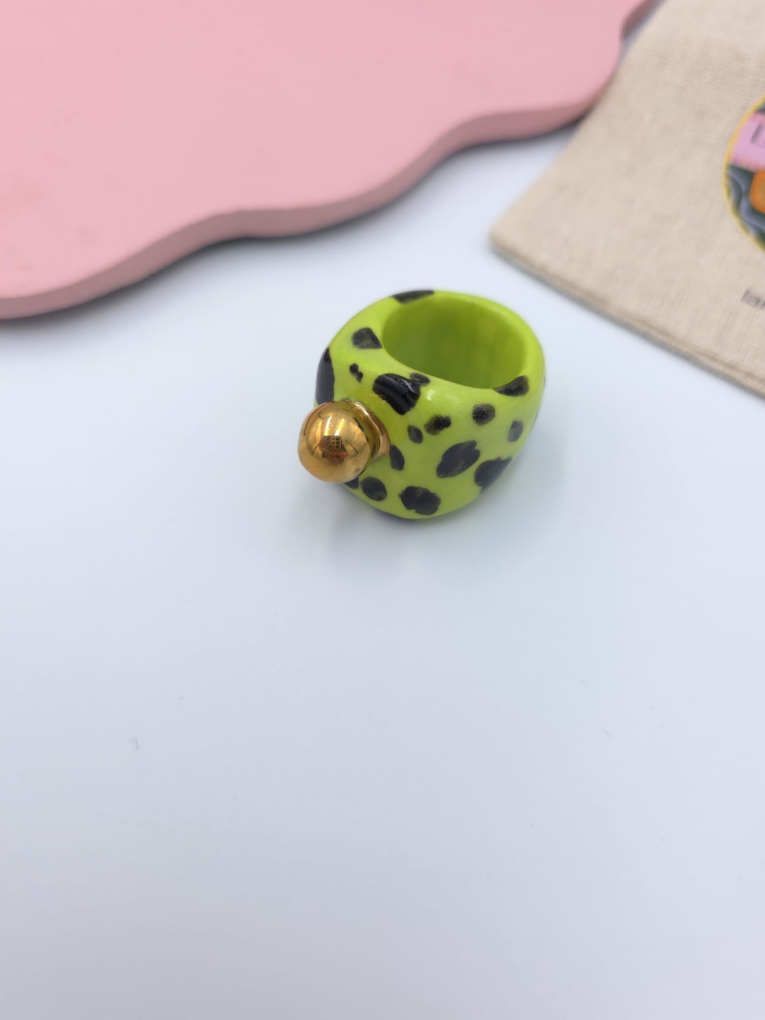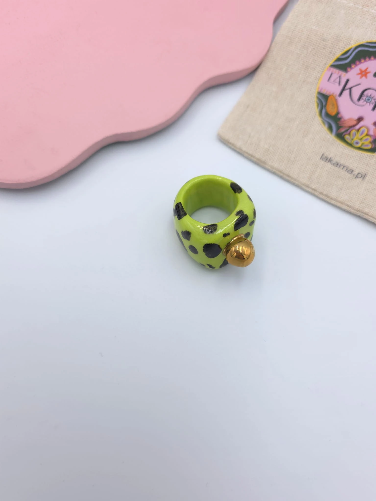 Porcelanowy pierścionek - limonkowy w ciapki ze złotą kulką