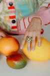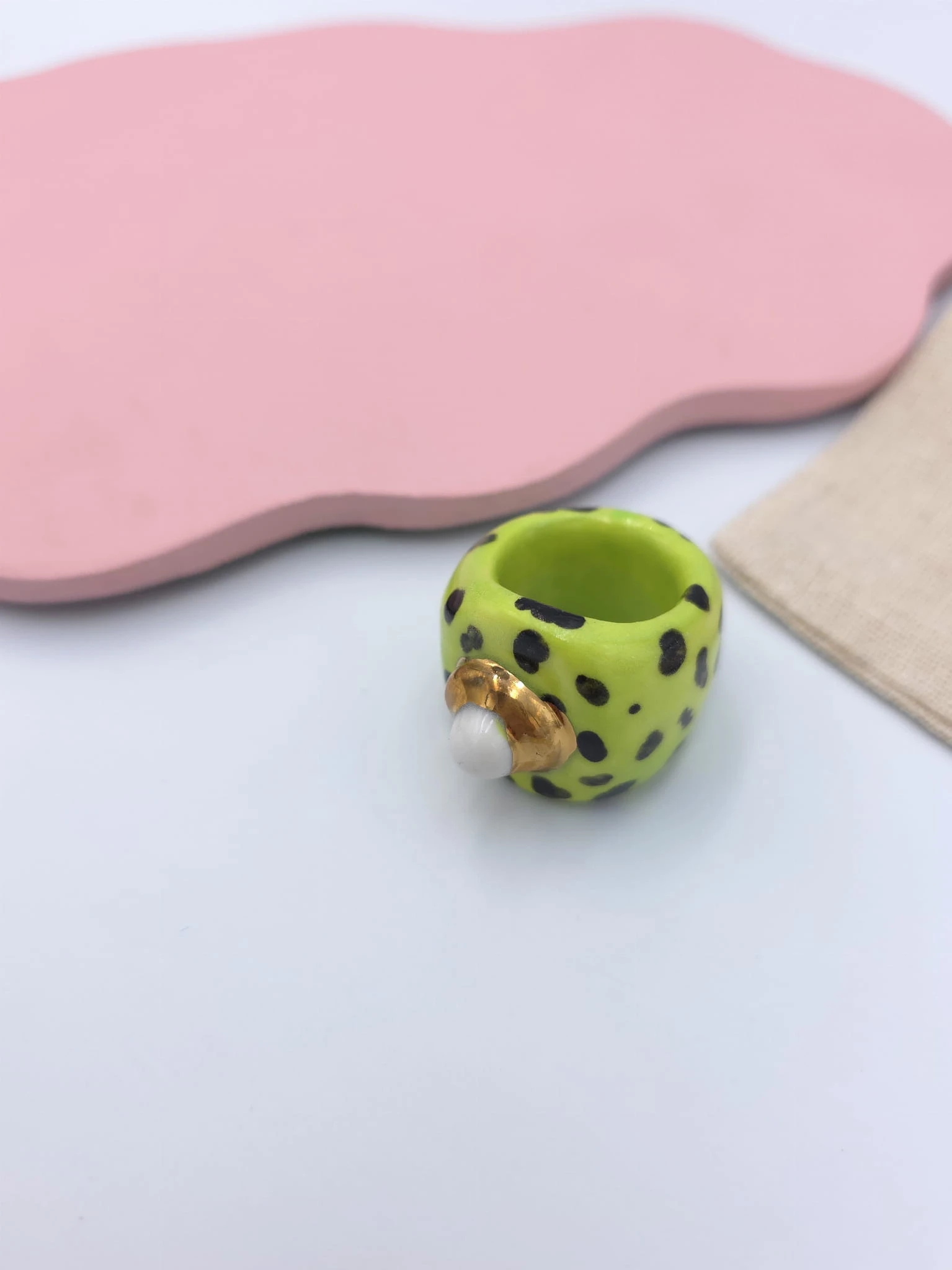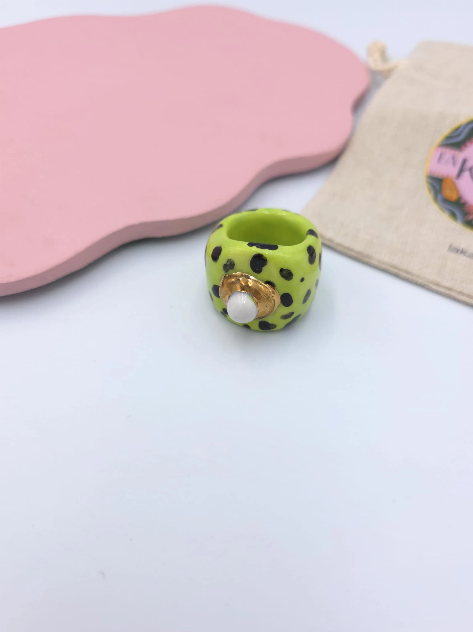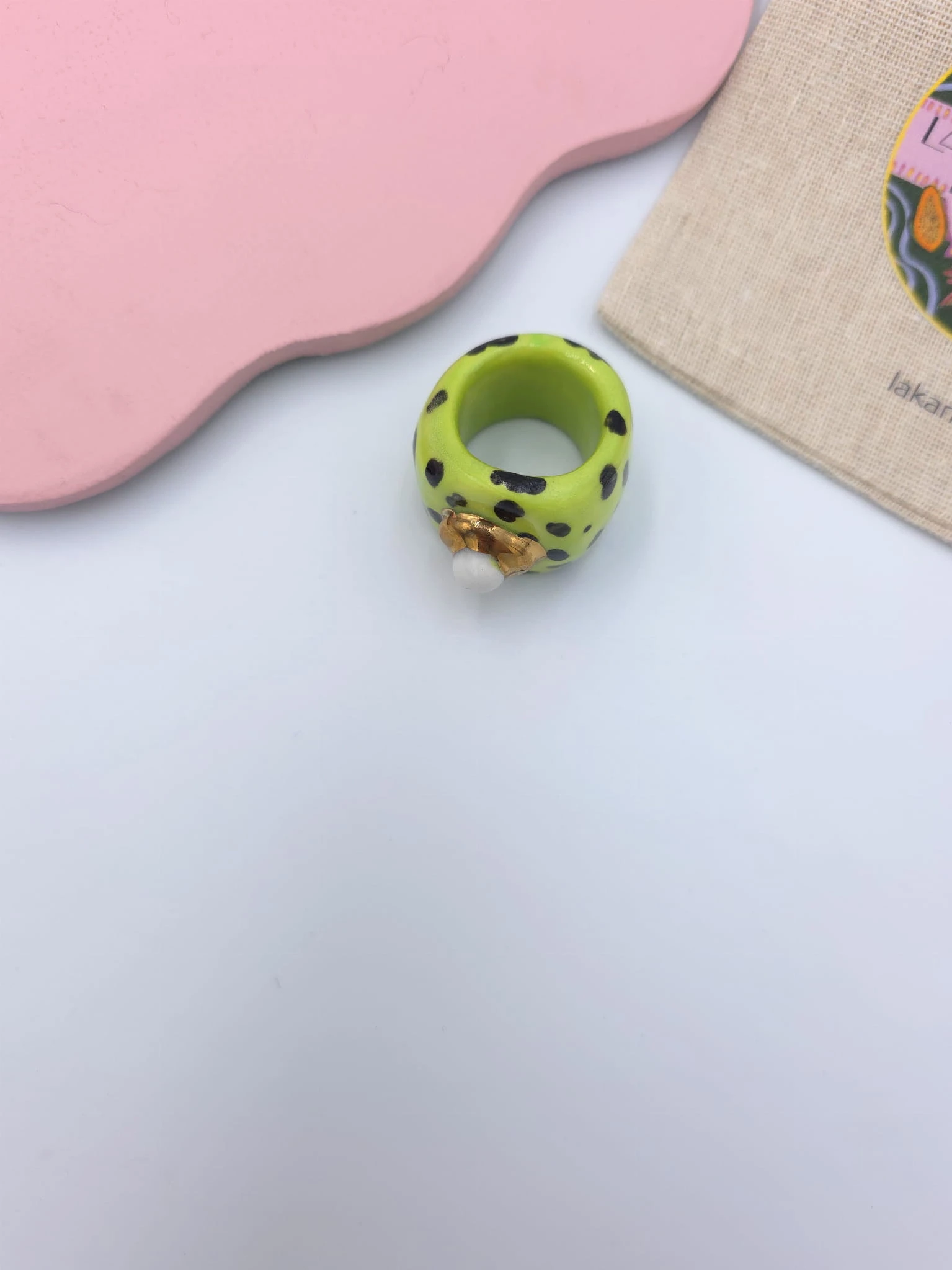 Porcelanowy pierścionek - limonkowy z białą kuleczką