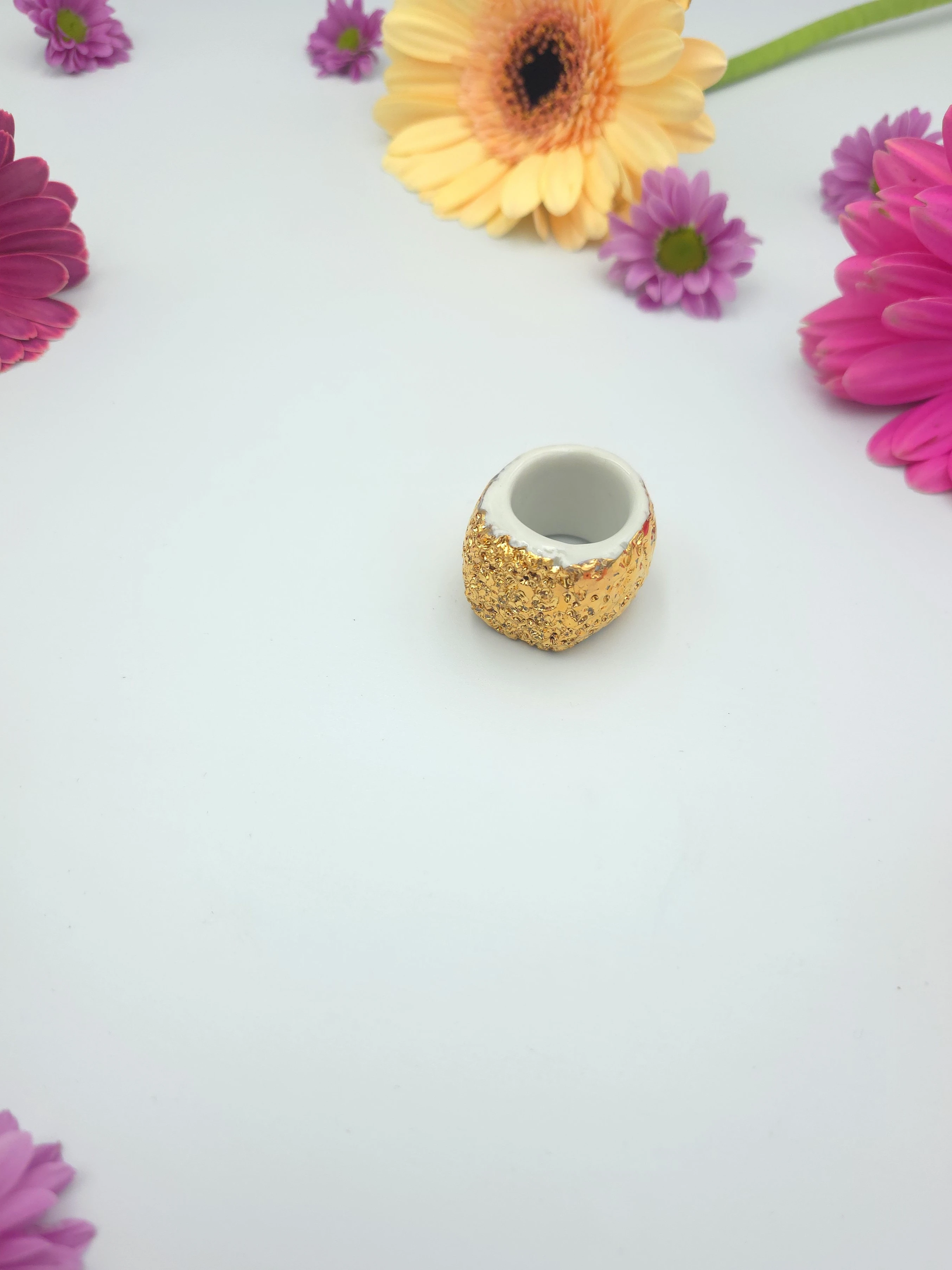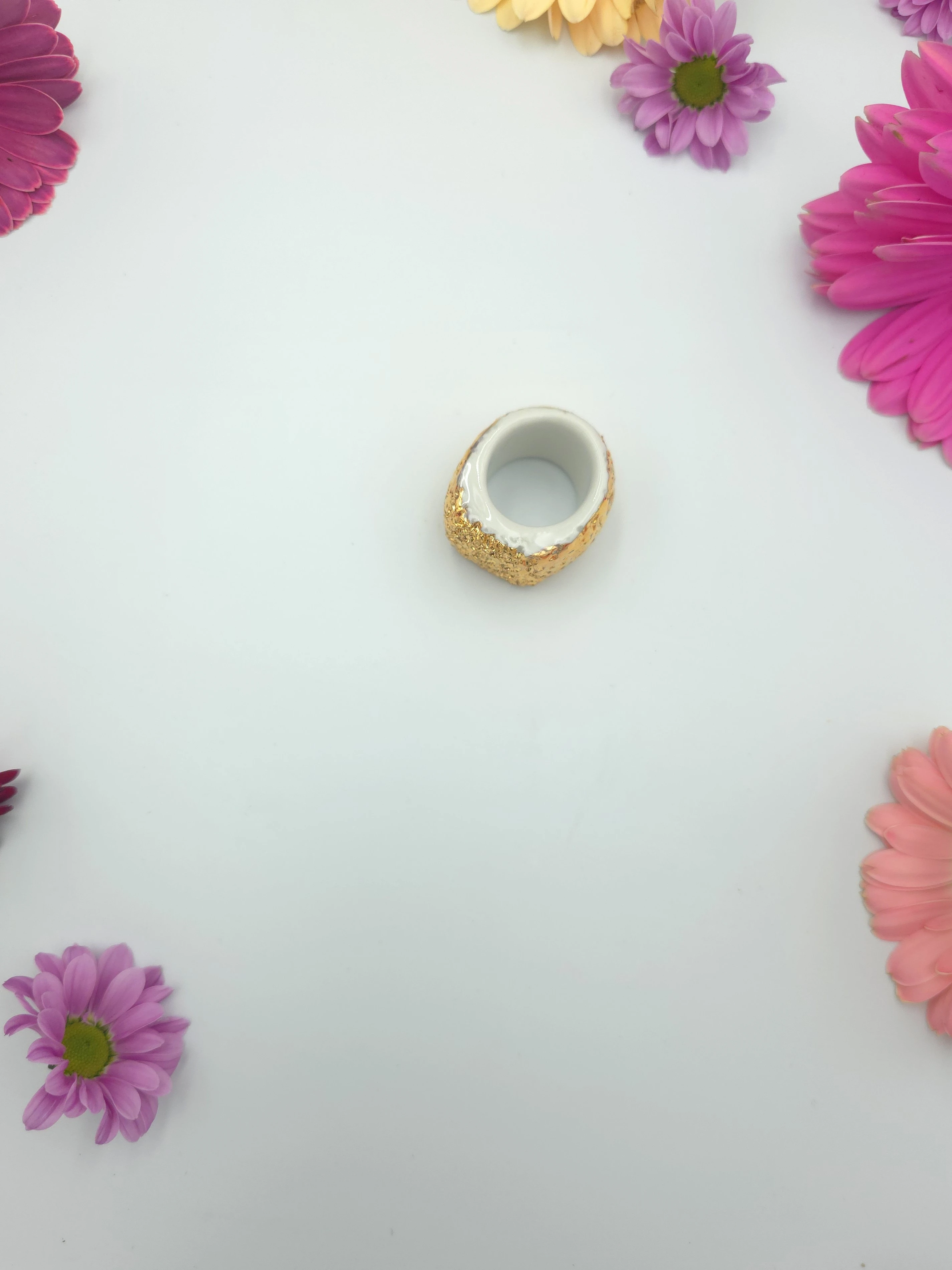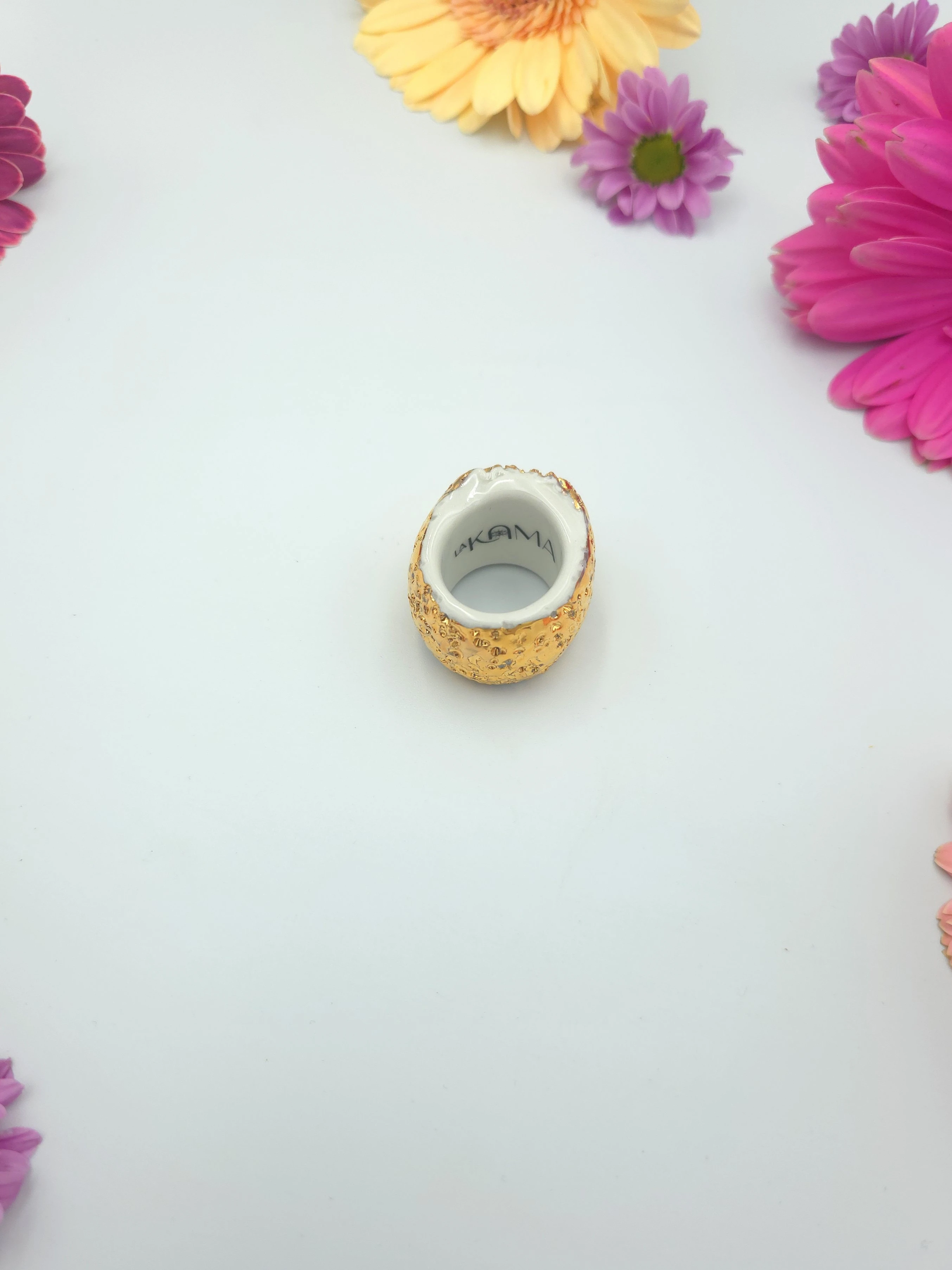 Unikatowy pierścionek z porcelany, zdobiony prawdziwym złotem.