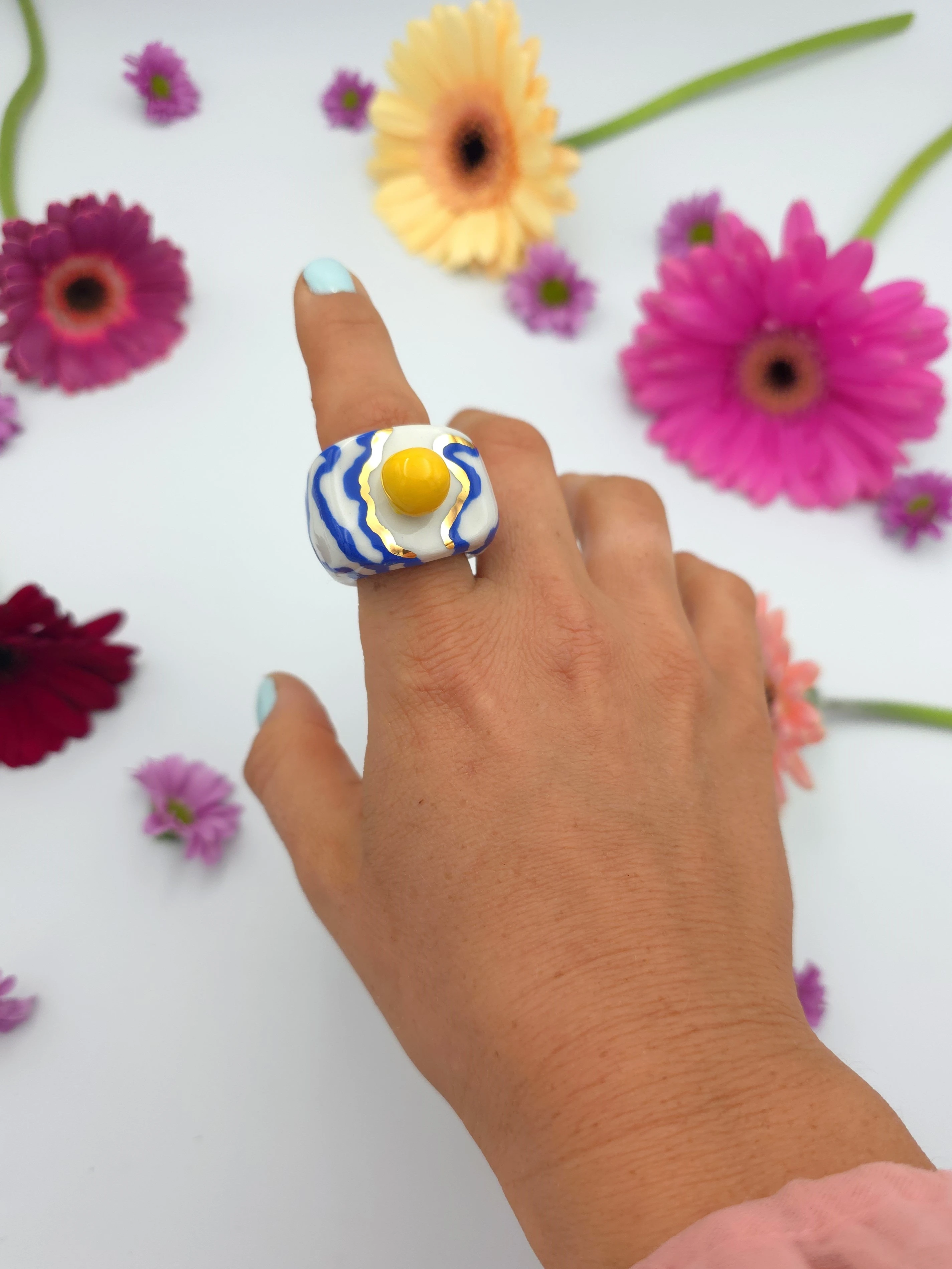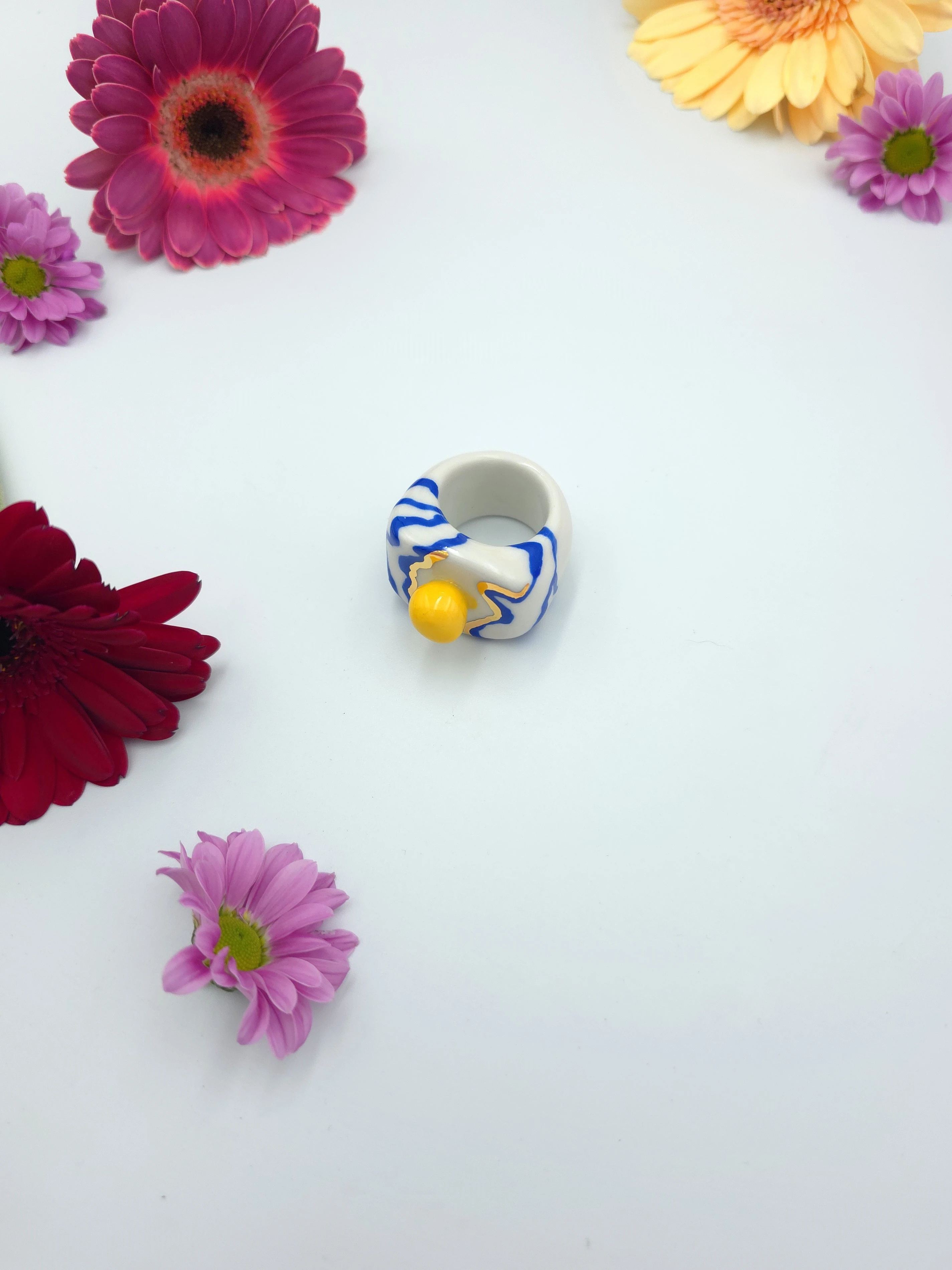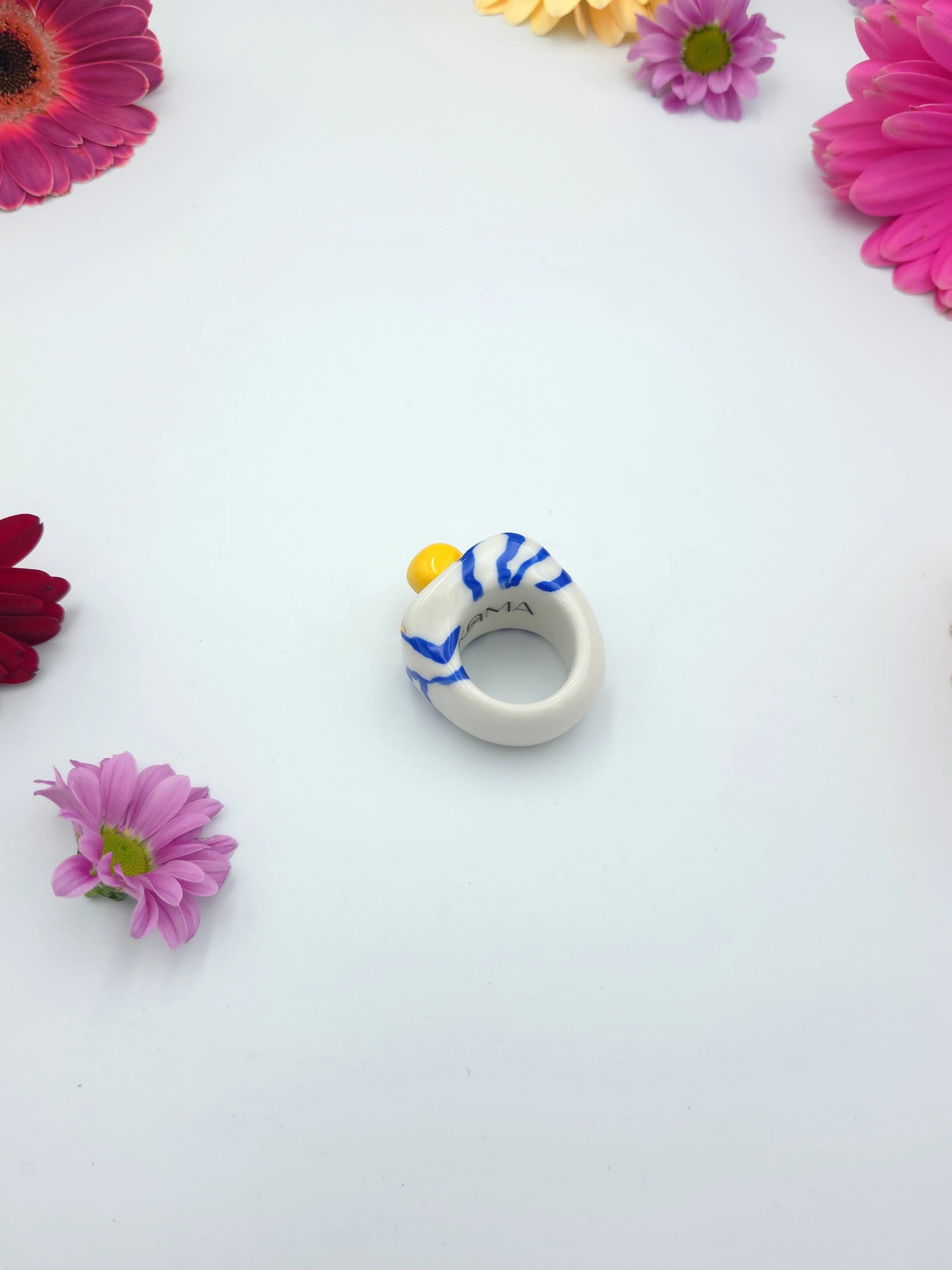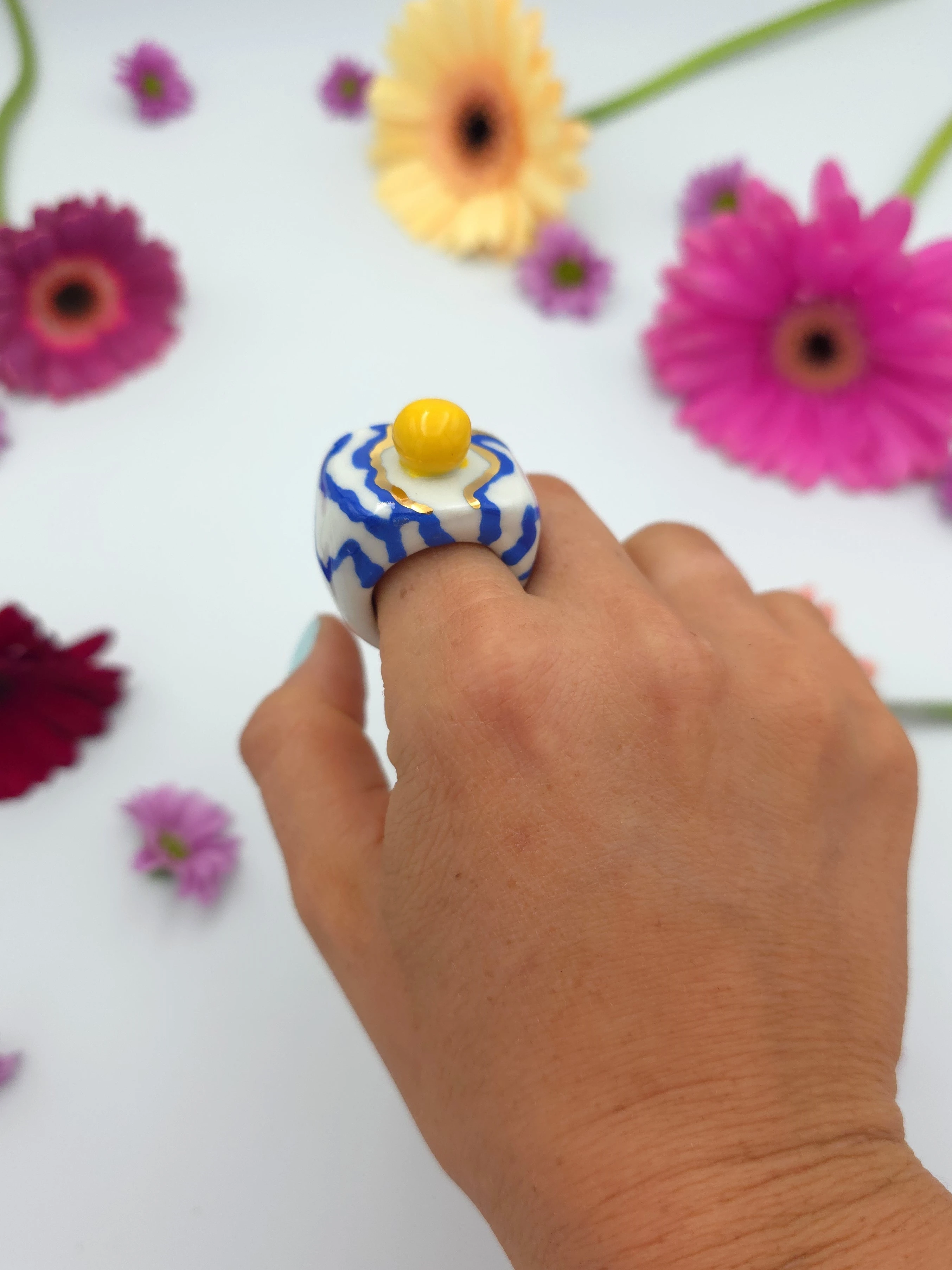 Porcelanowy pierścionek - niebieskie paski z żółtą kuleczką