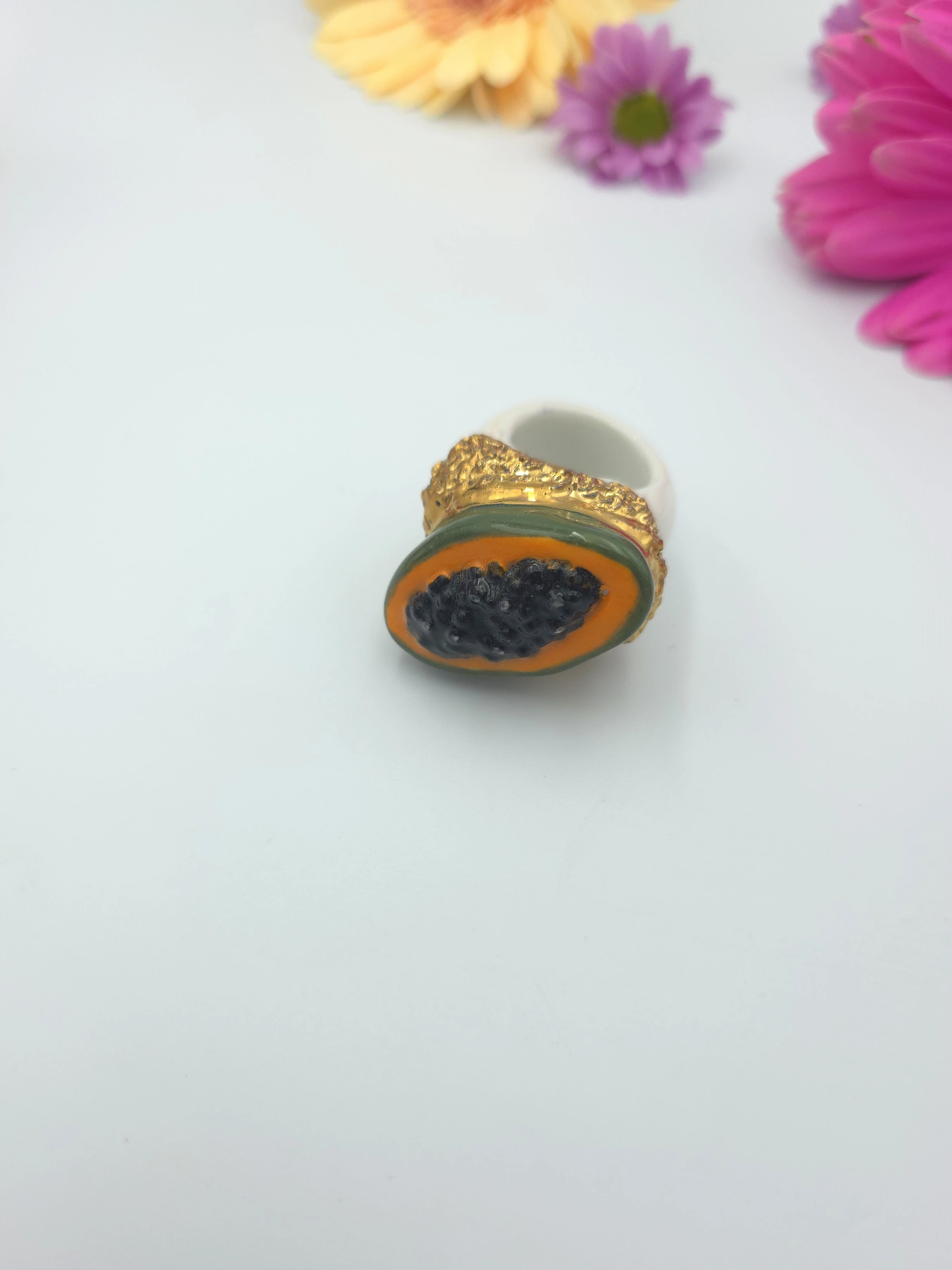 Unikatowy pierścionek z porcelany, zdobiony prawdziwym złotem.