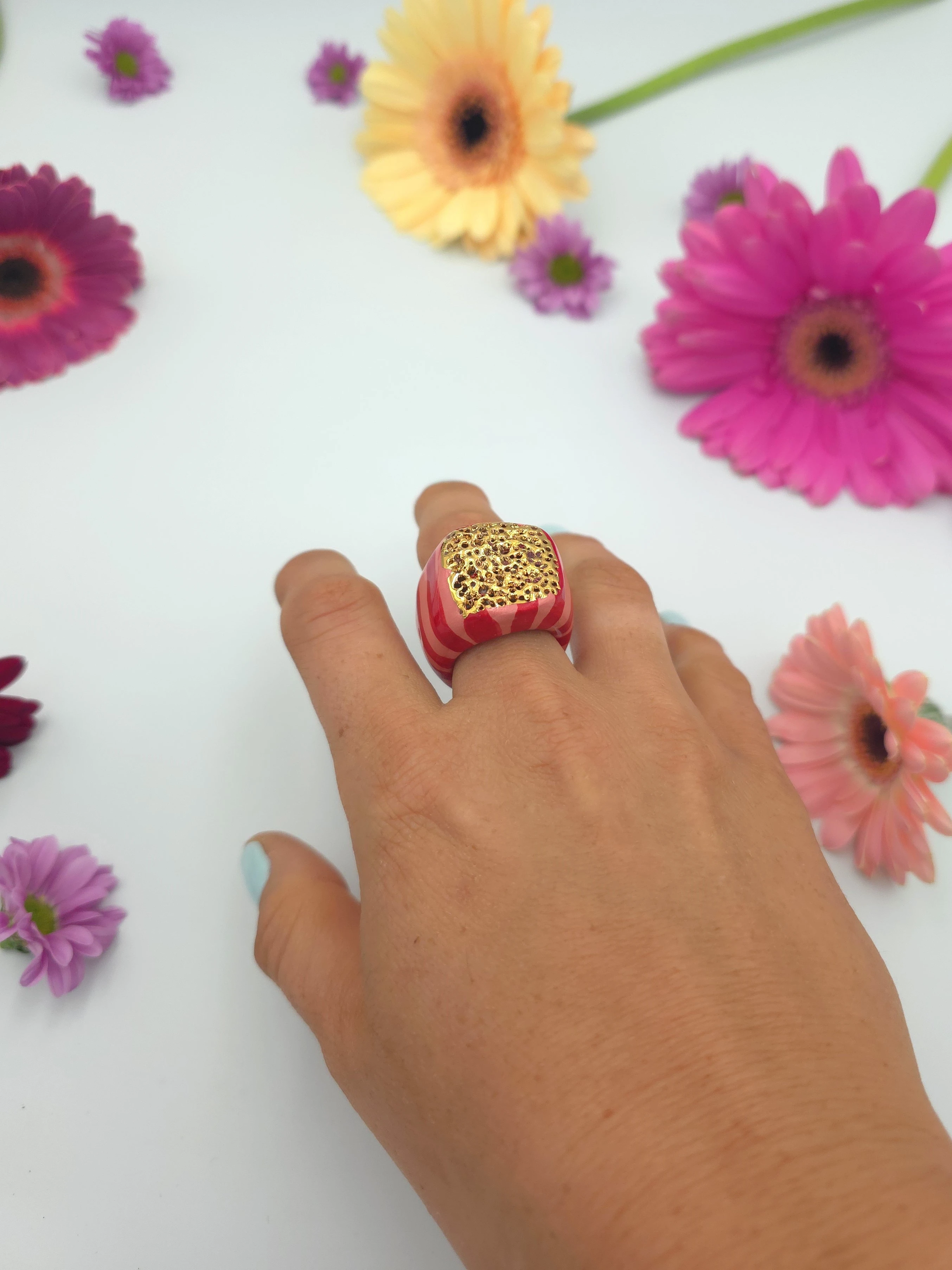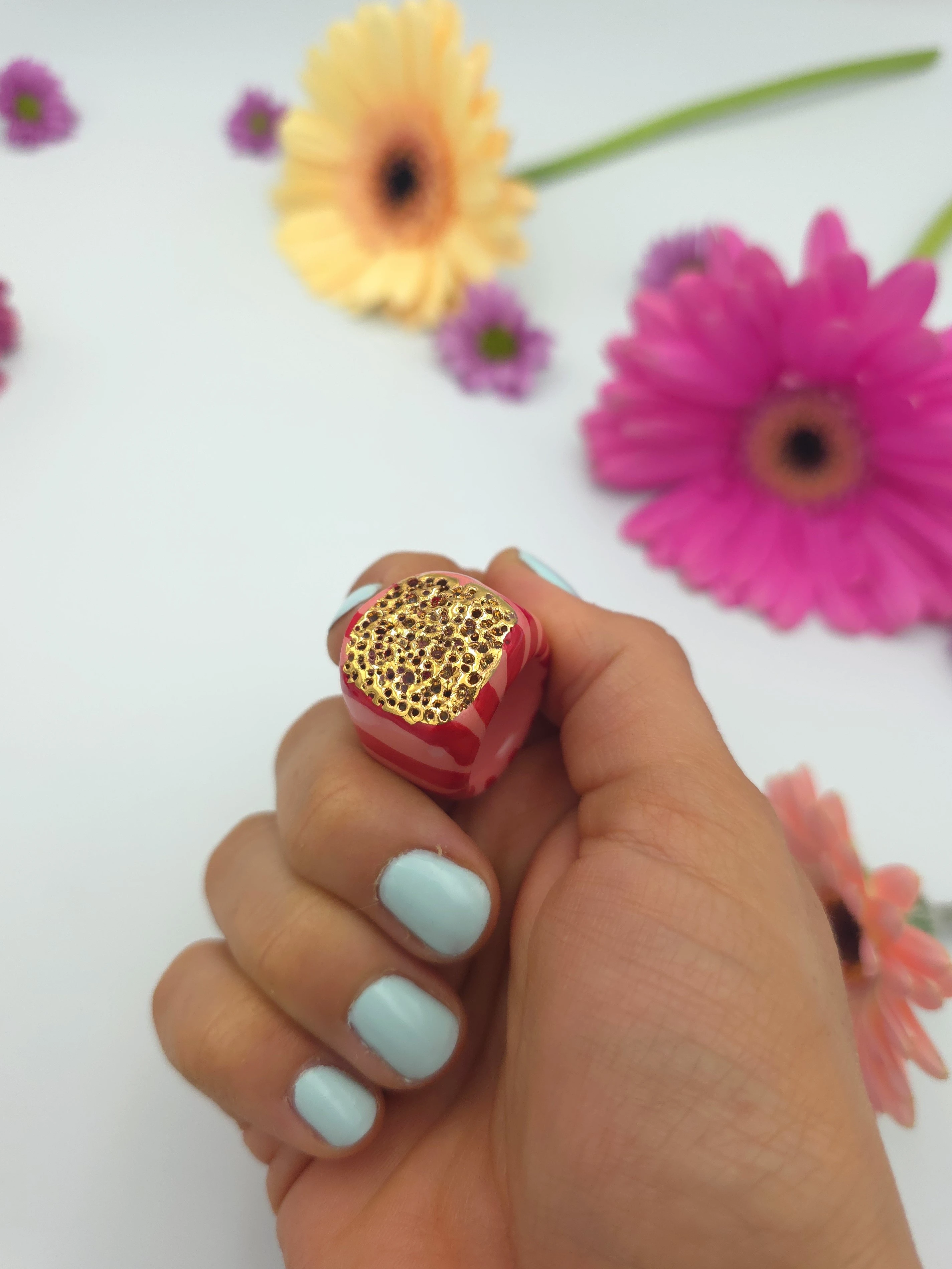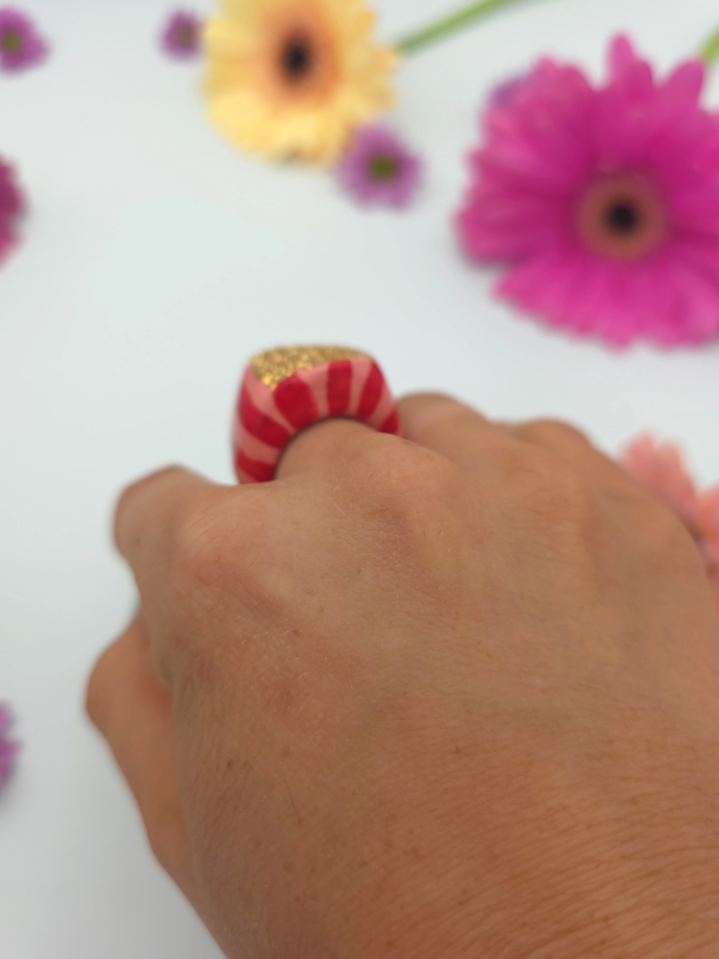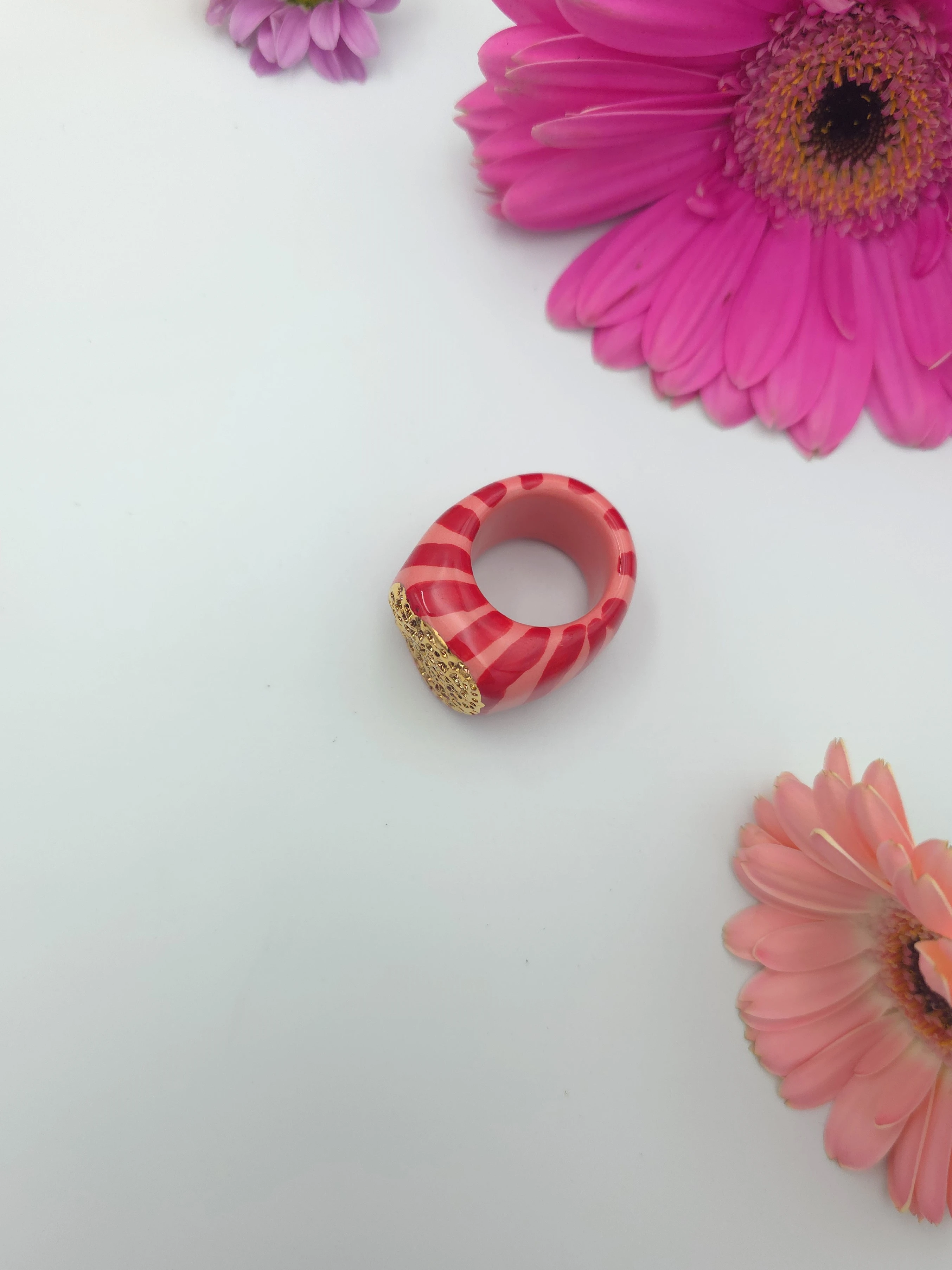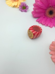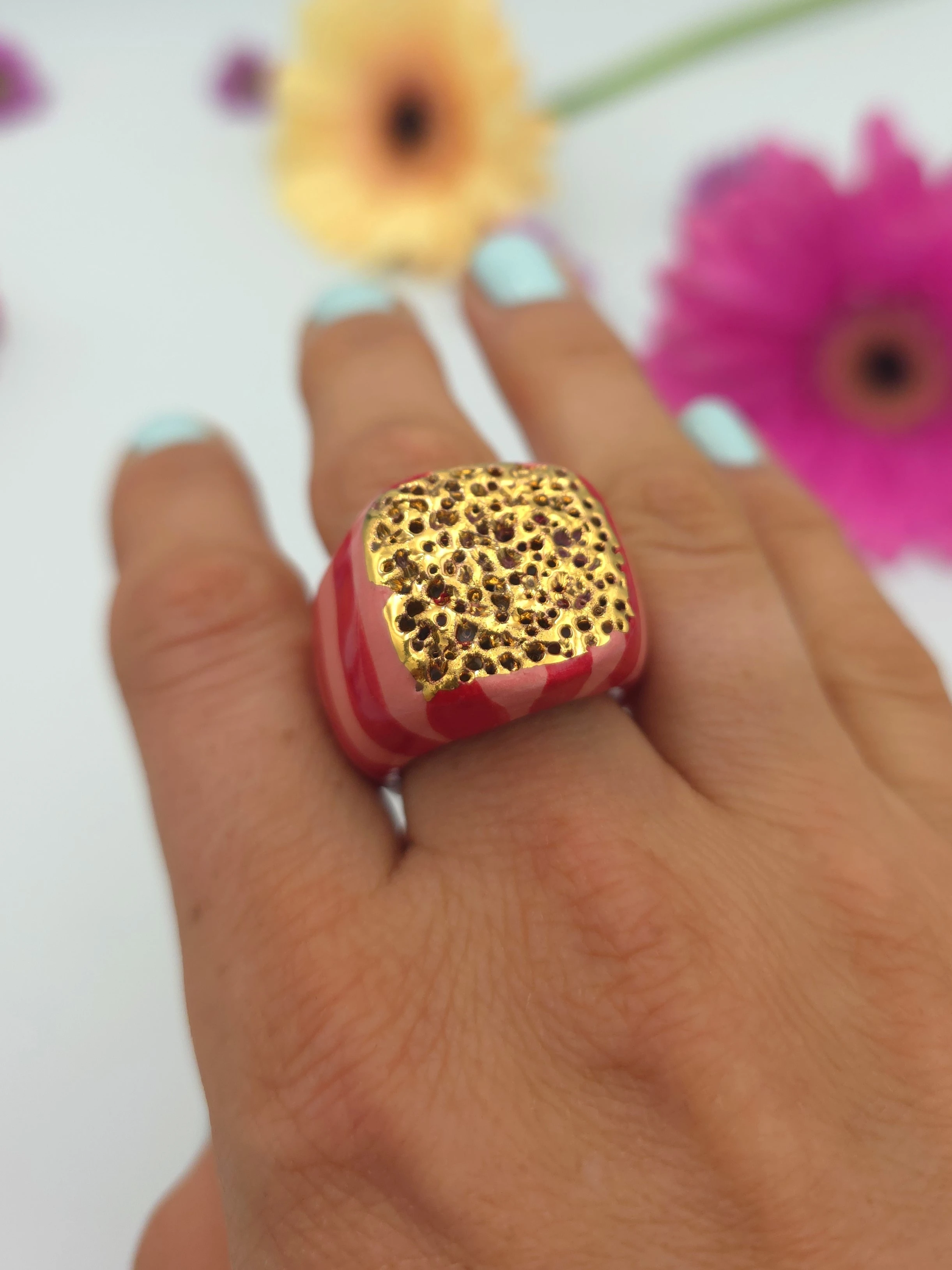 Porcelanowy pierścionek - paski różowo czerwone ze złotem