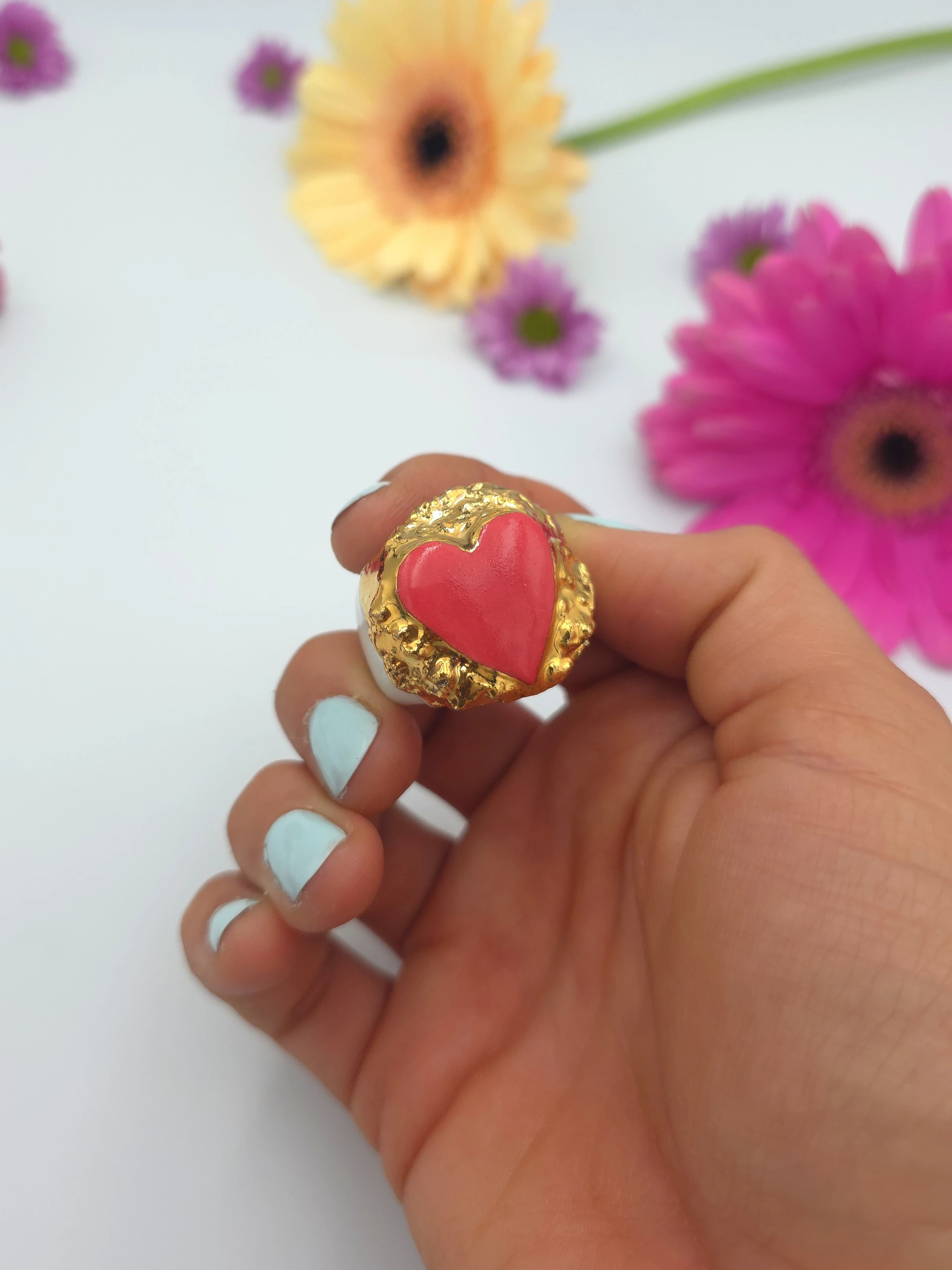 Każdy pierścionek jest ręcznie formowany, malowany i zdobiony. Wszystkie moje prace są starannie wykończone moimi rękami, co sprawia, że nie powstanie drugi taki sam egzemplarz. Pierścionki z porcelany są lekkie i łatwe w noszeniu.