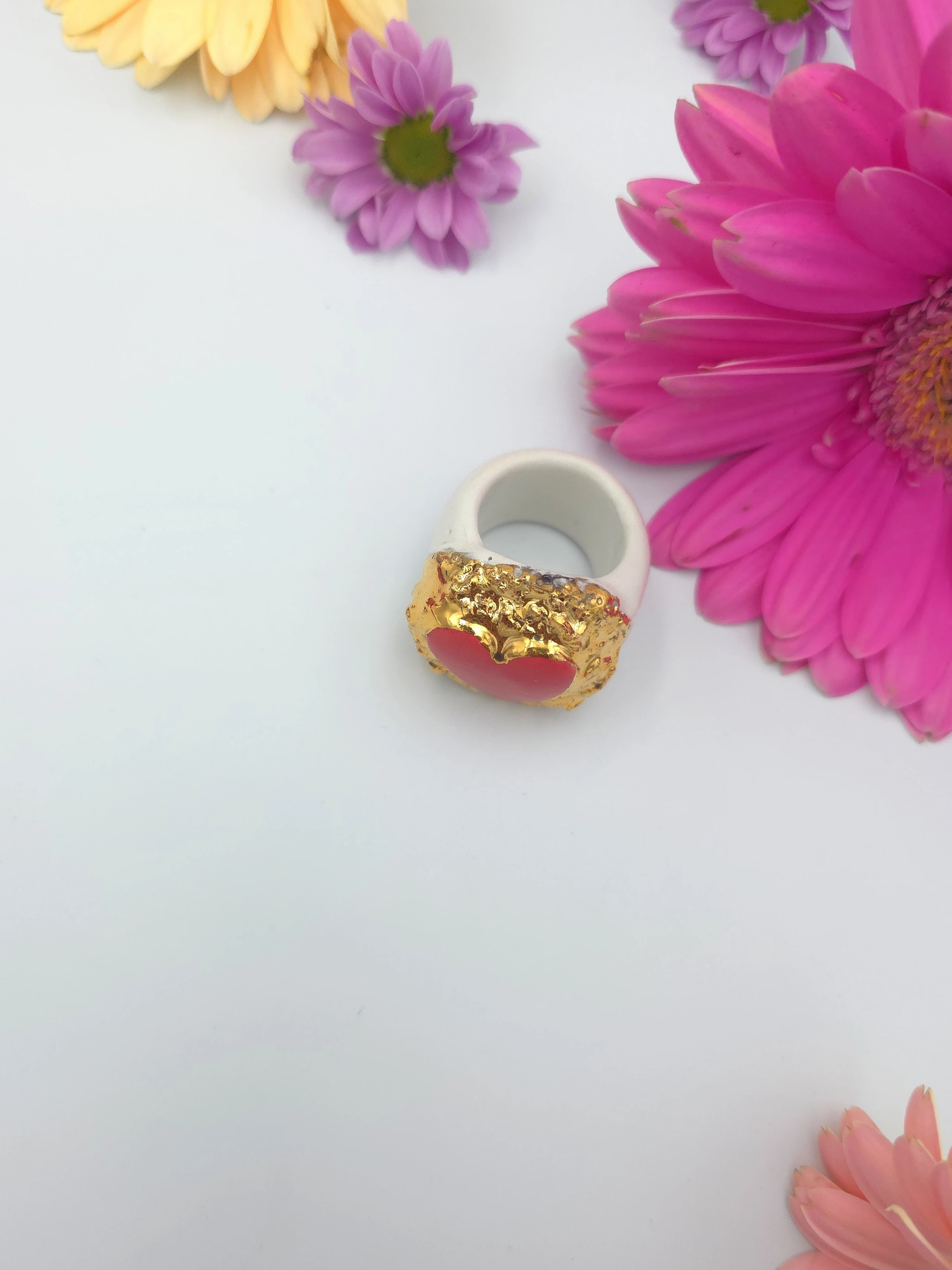 Unikatowy pierścionek z porcelany, zdobiony prawdziwym złotem.