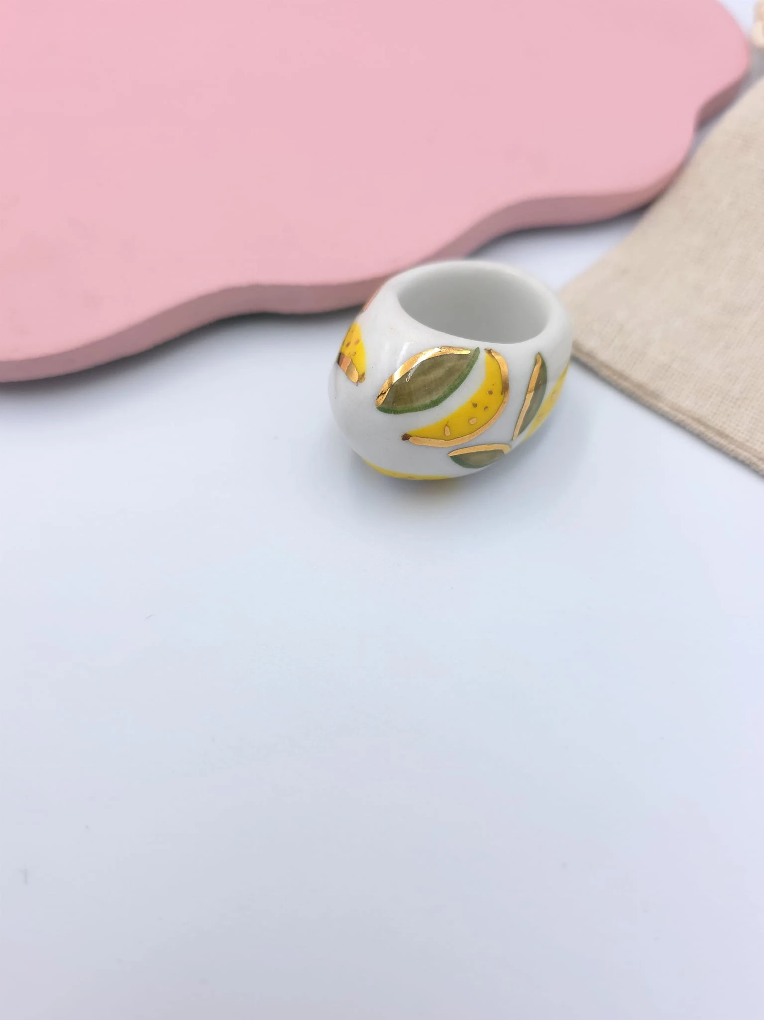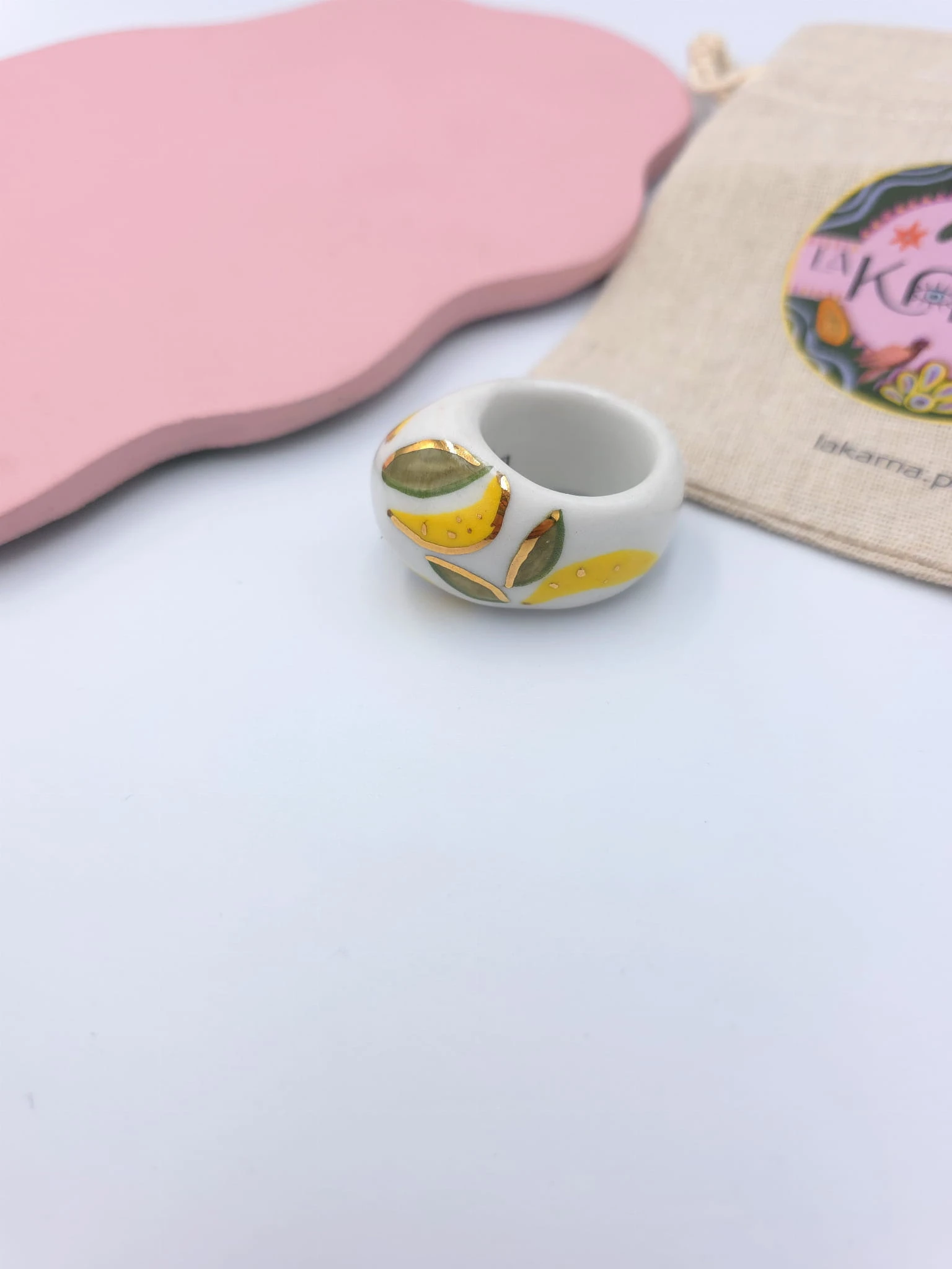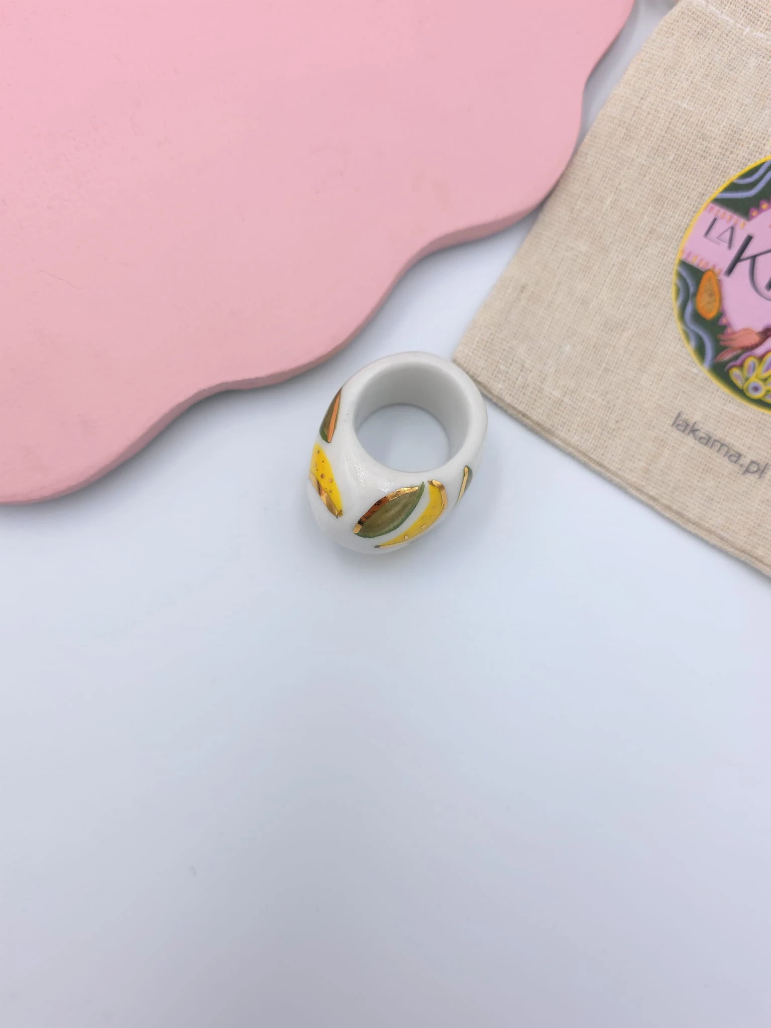 Unikatowy pierścionek z porcelany, zdobiony prawdziwym złotem.