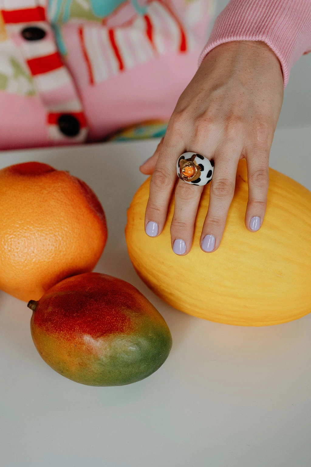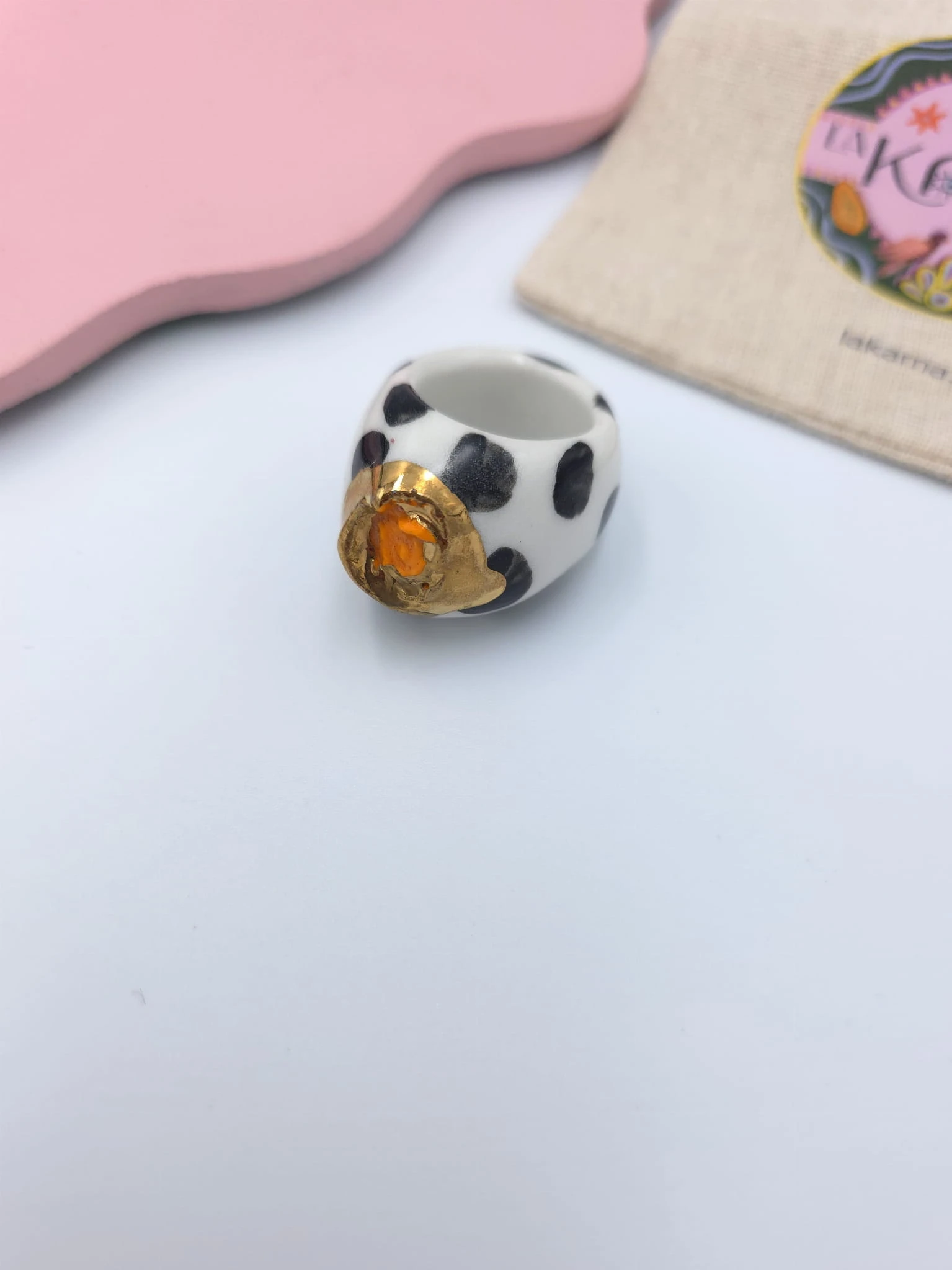 Porcelanowy pierścionek - w ciapki z pomarańczowym oczkiem