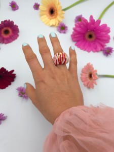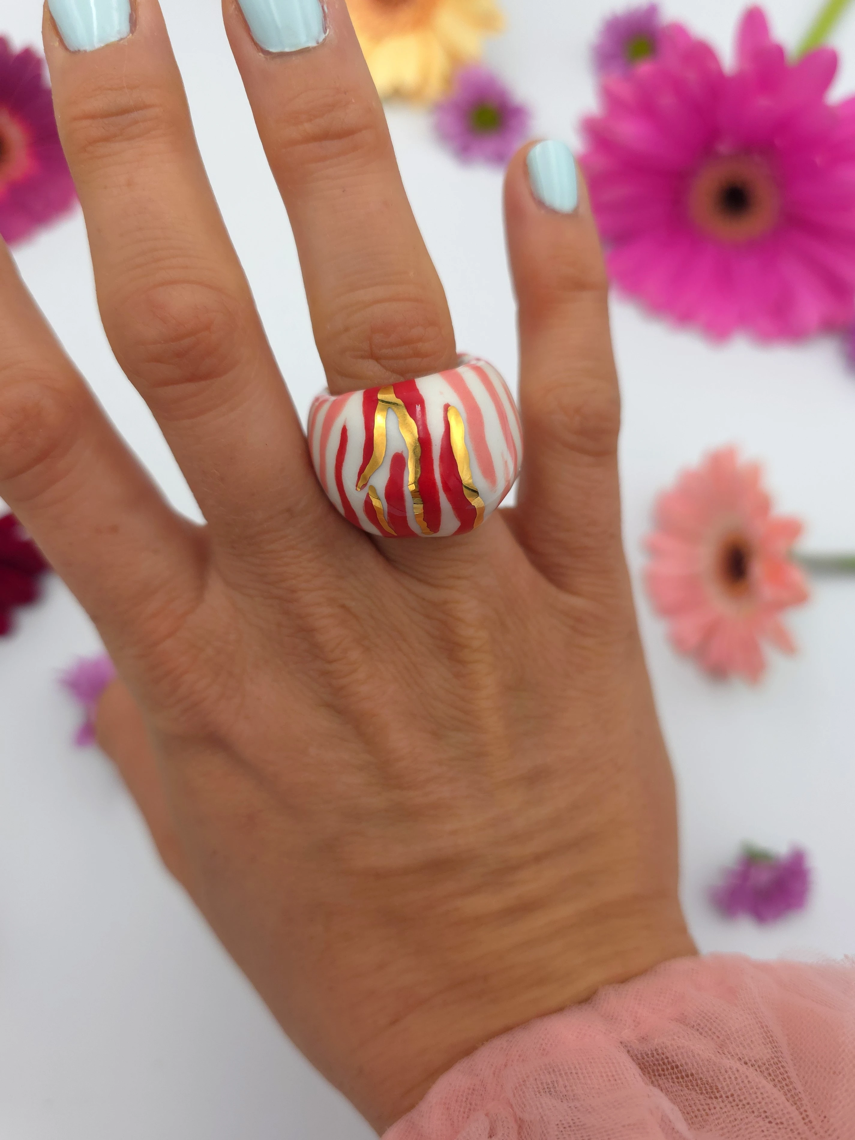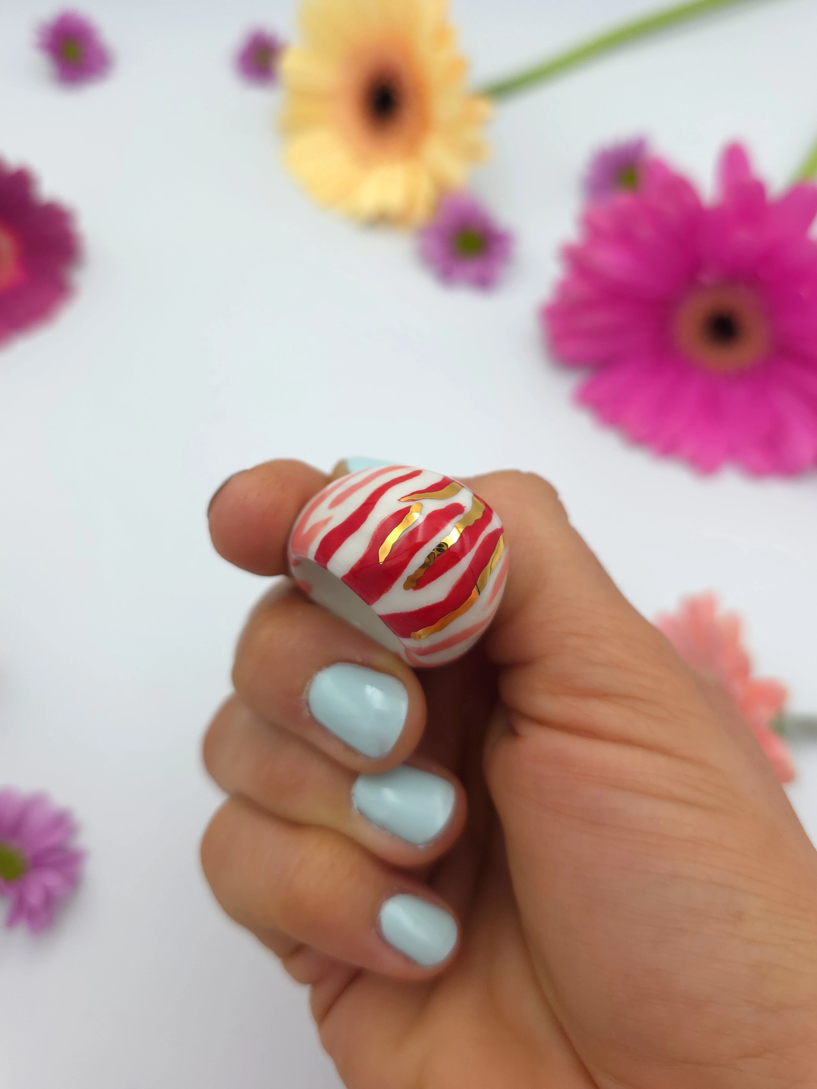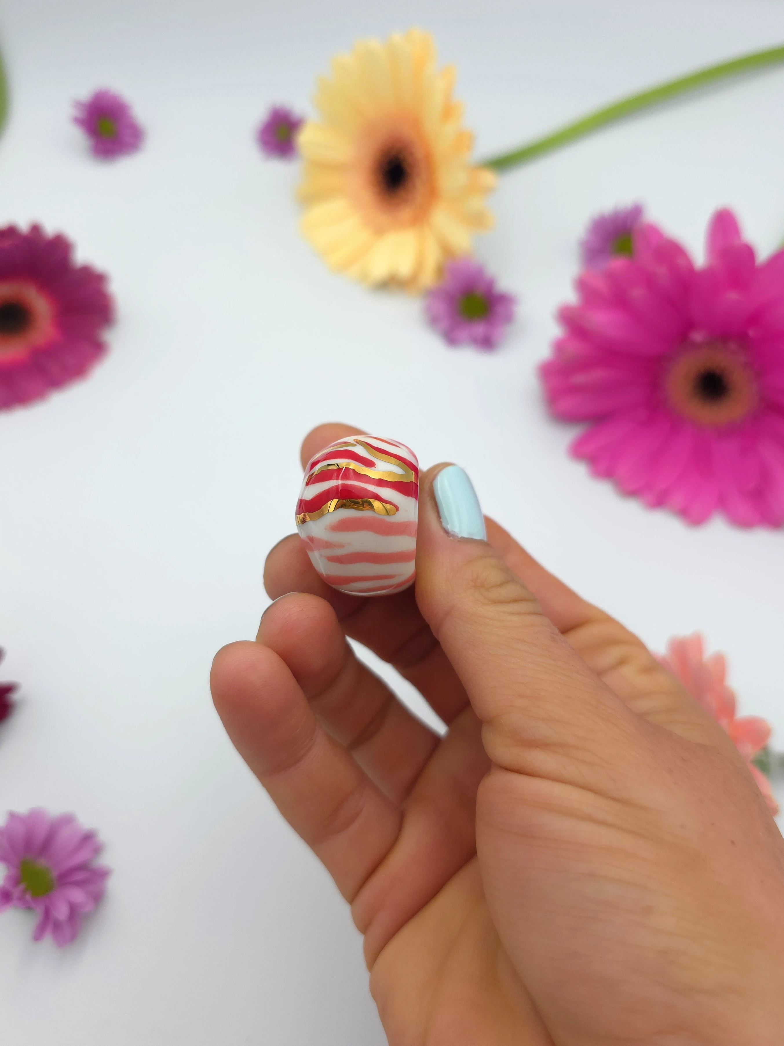 Każdy pierścionek jest ręcznie formowany, malowany i zdobiony. Wszystkie moje prace są starannie wykończone moimi rękami, co sprawia, że nie powstanie drugi taki sam egzemplarz. Pierścionki z porcelany są lekkie i łatwe w noszeniu.