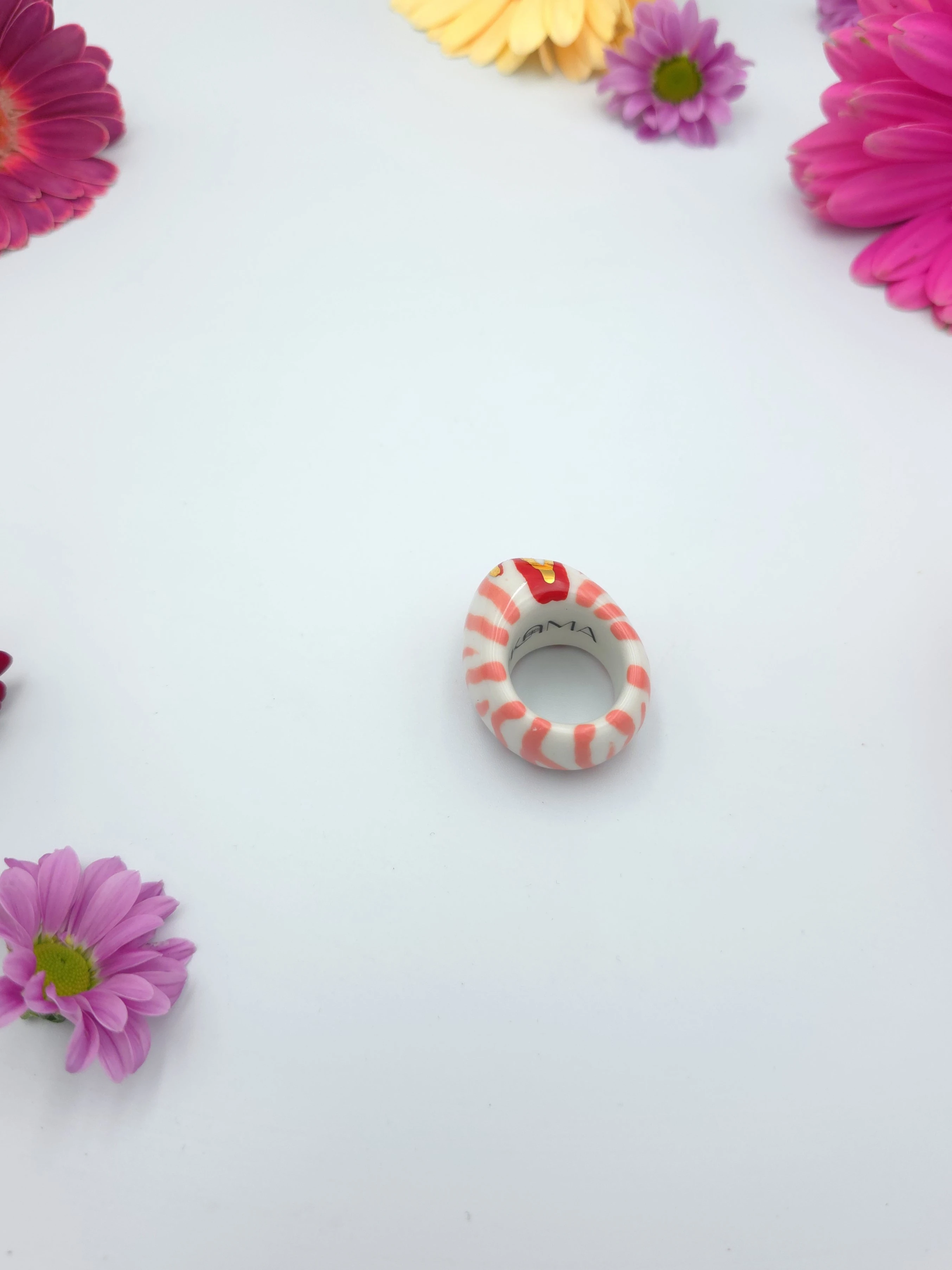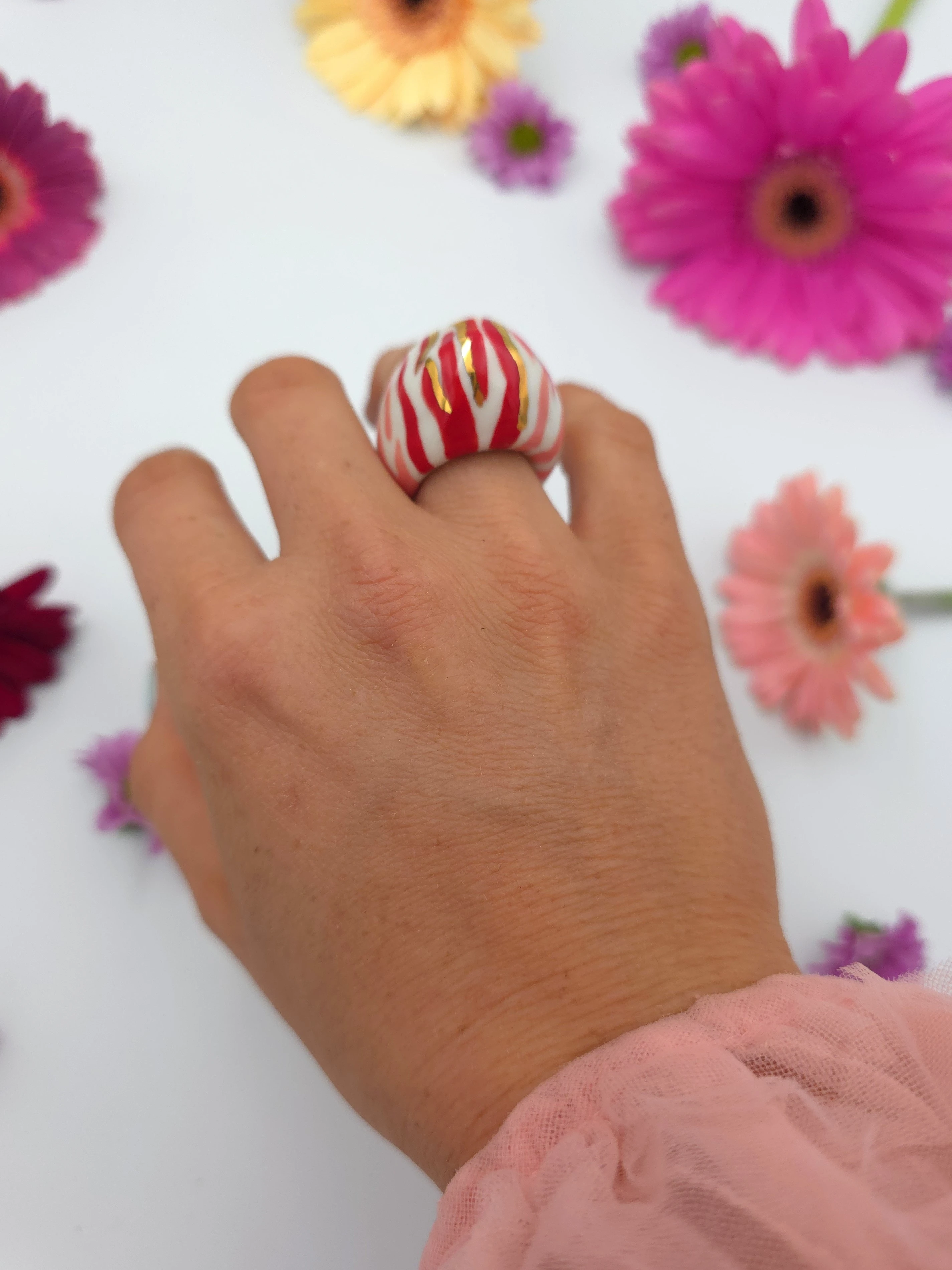 Porcelanowy pierścionek - zebra różowo czerwona