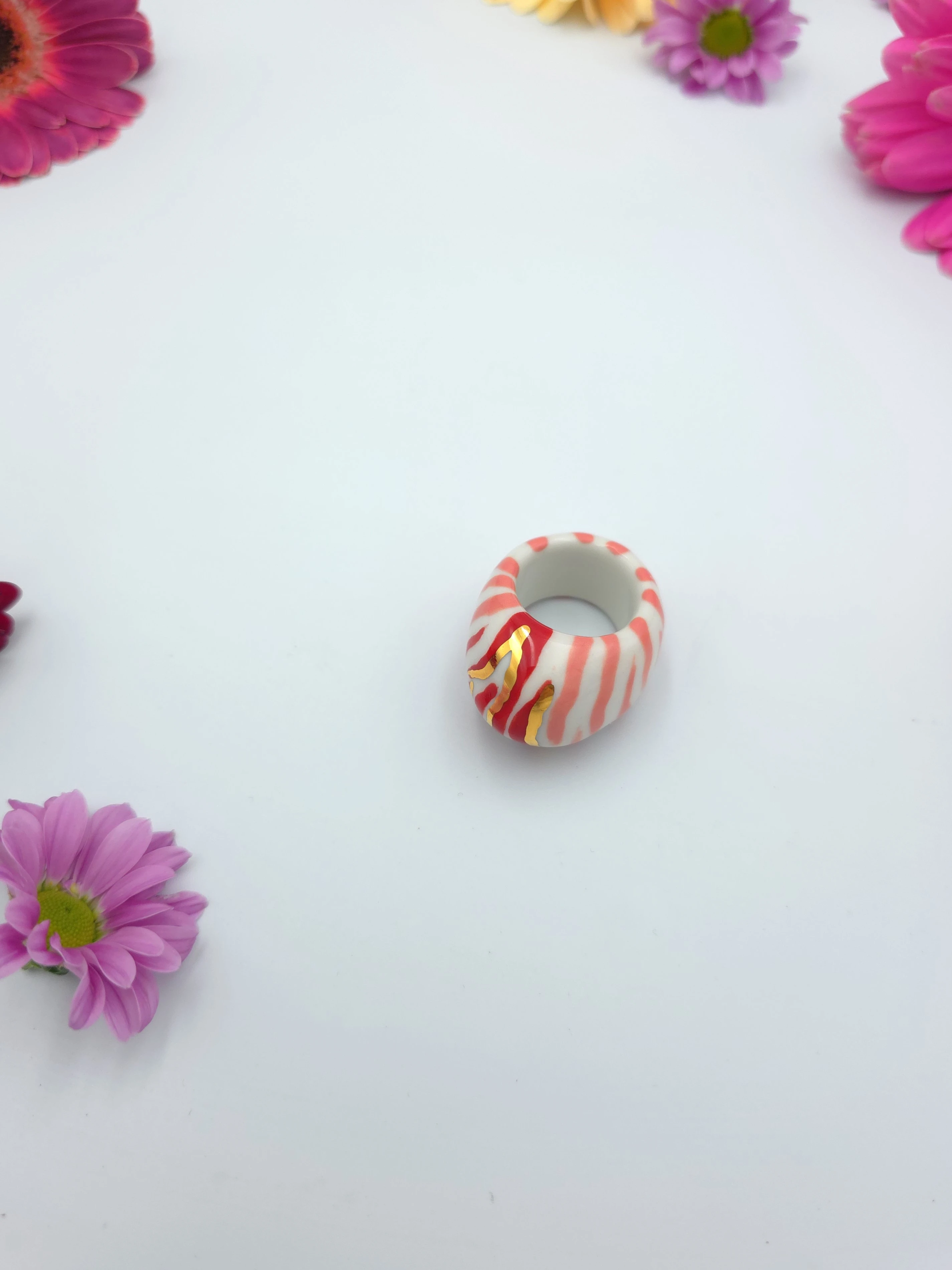Unikatowy pierścionek z porcelany, zdobiony prawdziwym złotem.