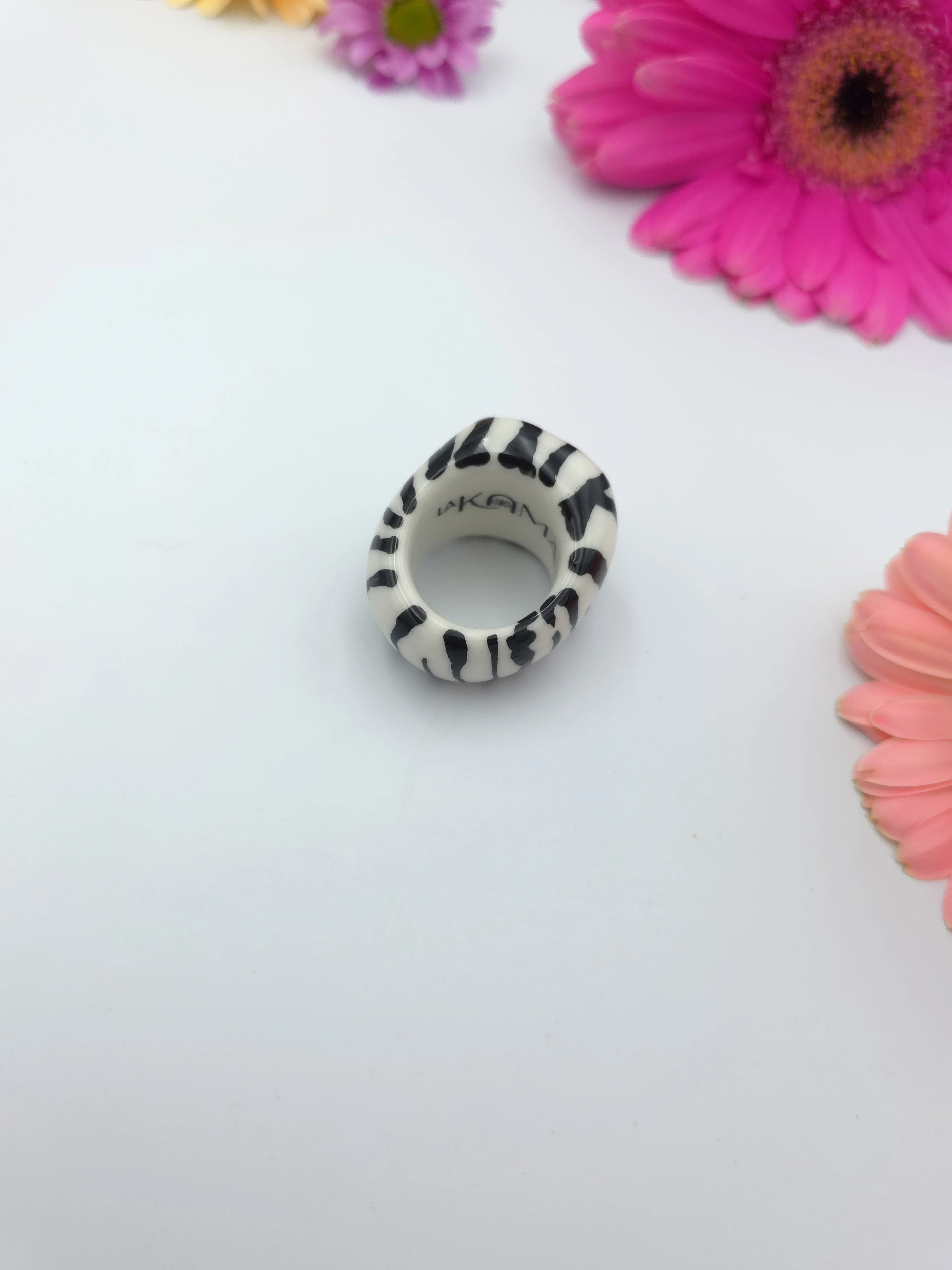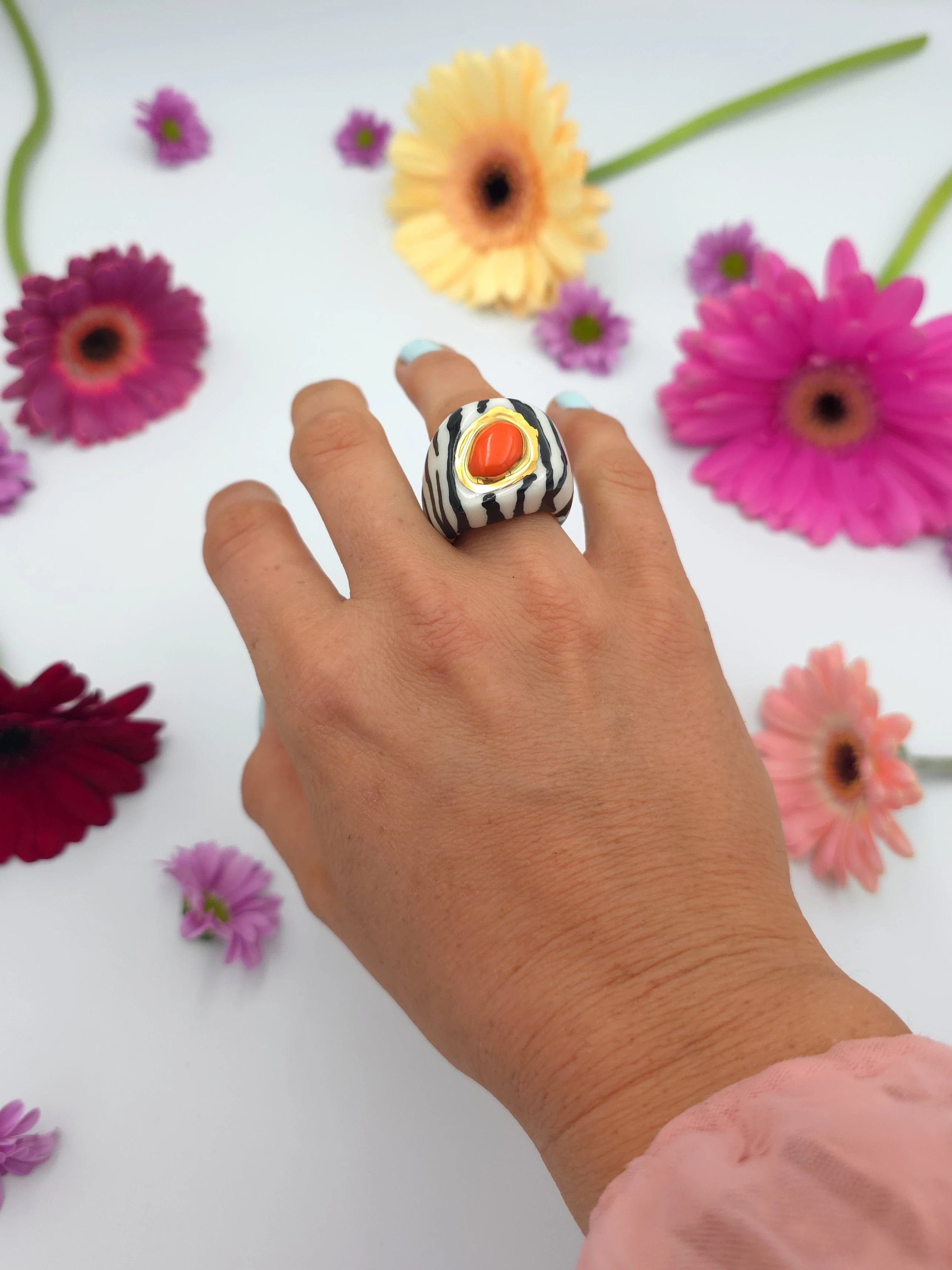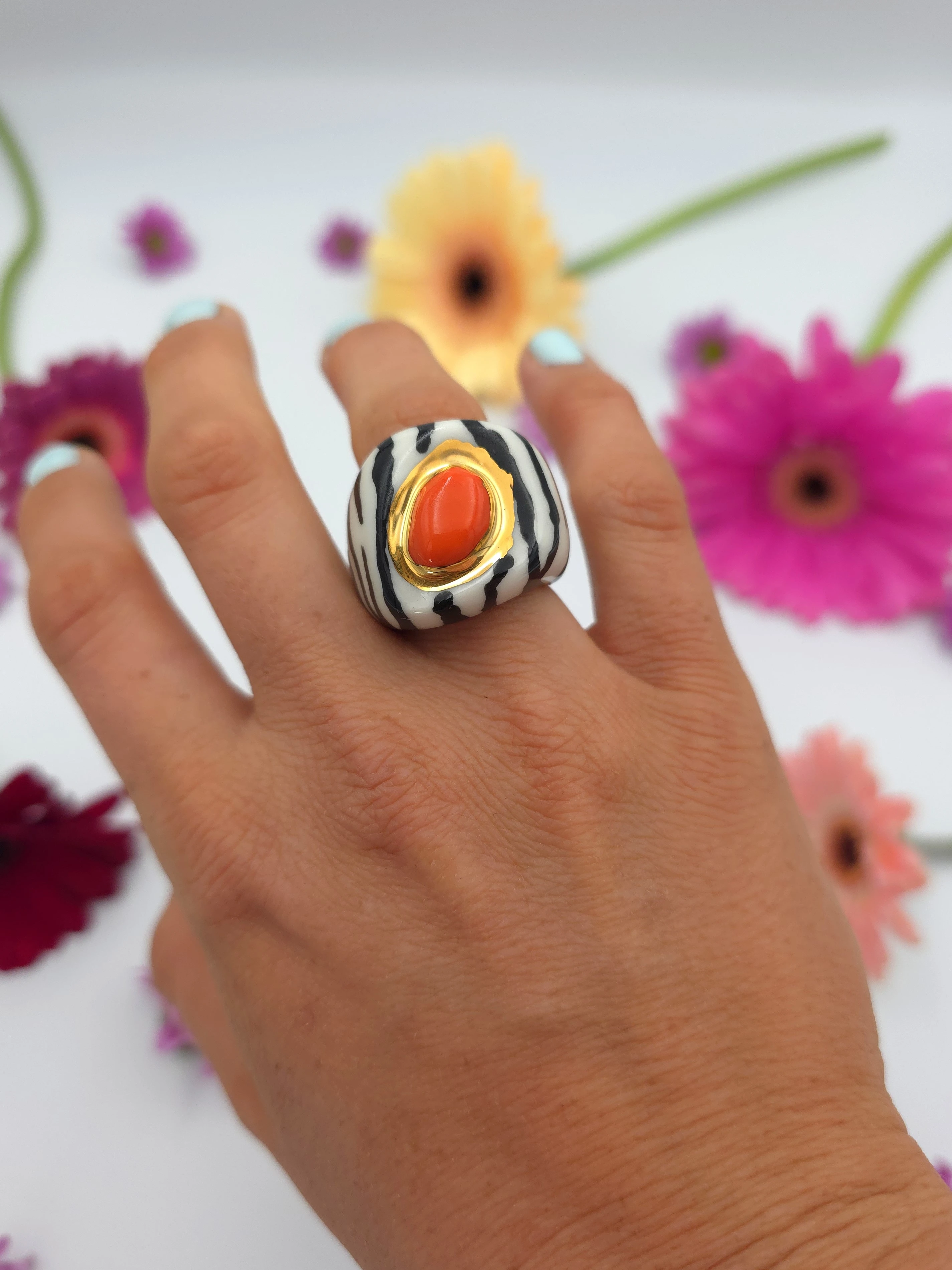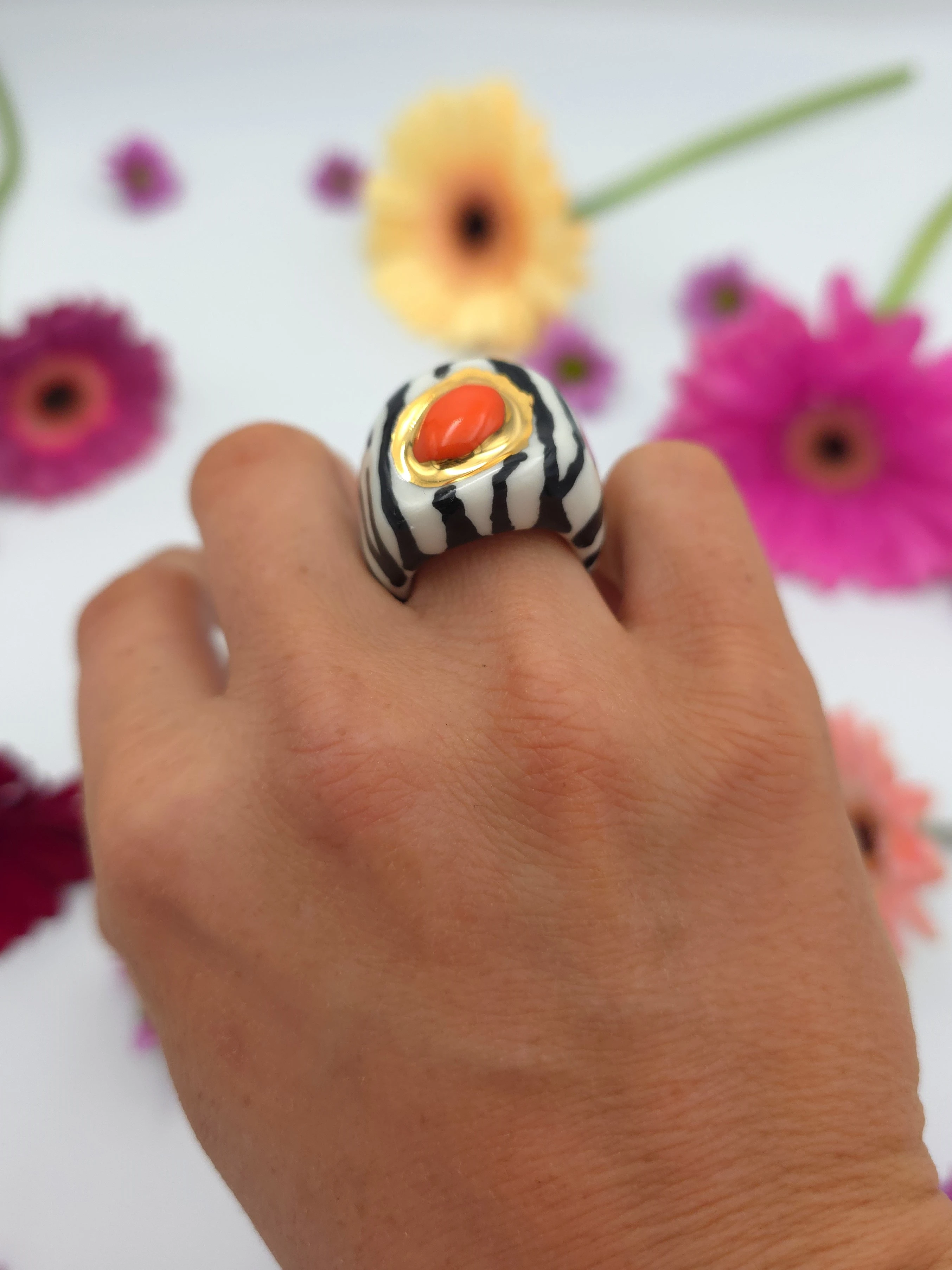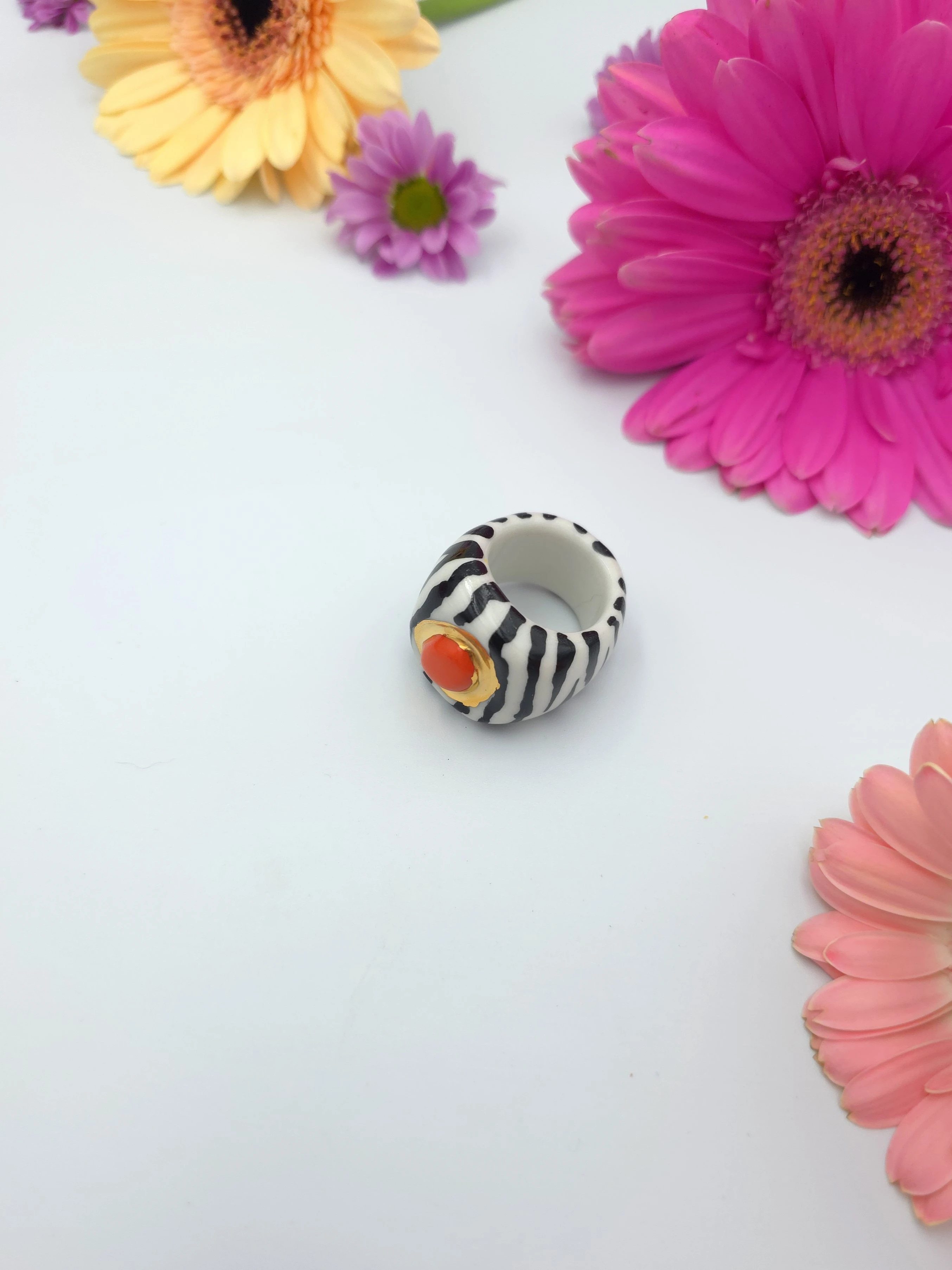 Porcelanowy pierścionek - zebra z pomarańczowym środkiem