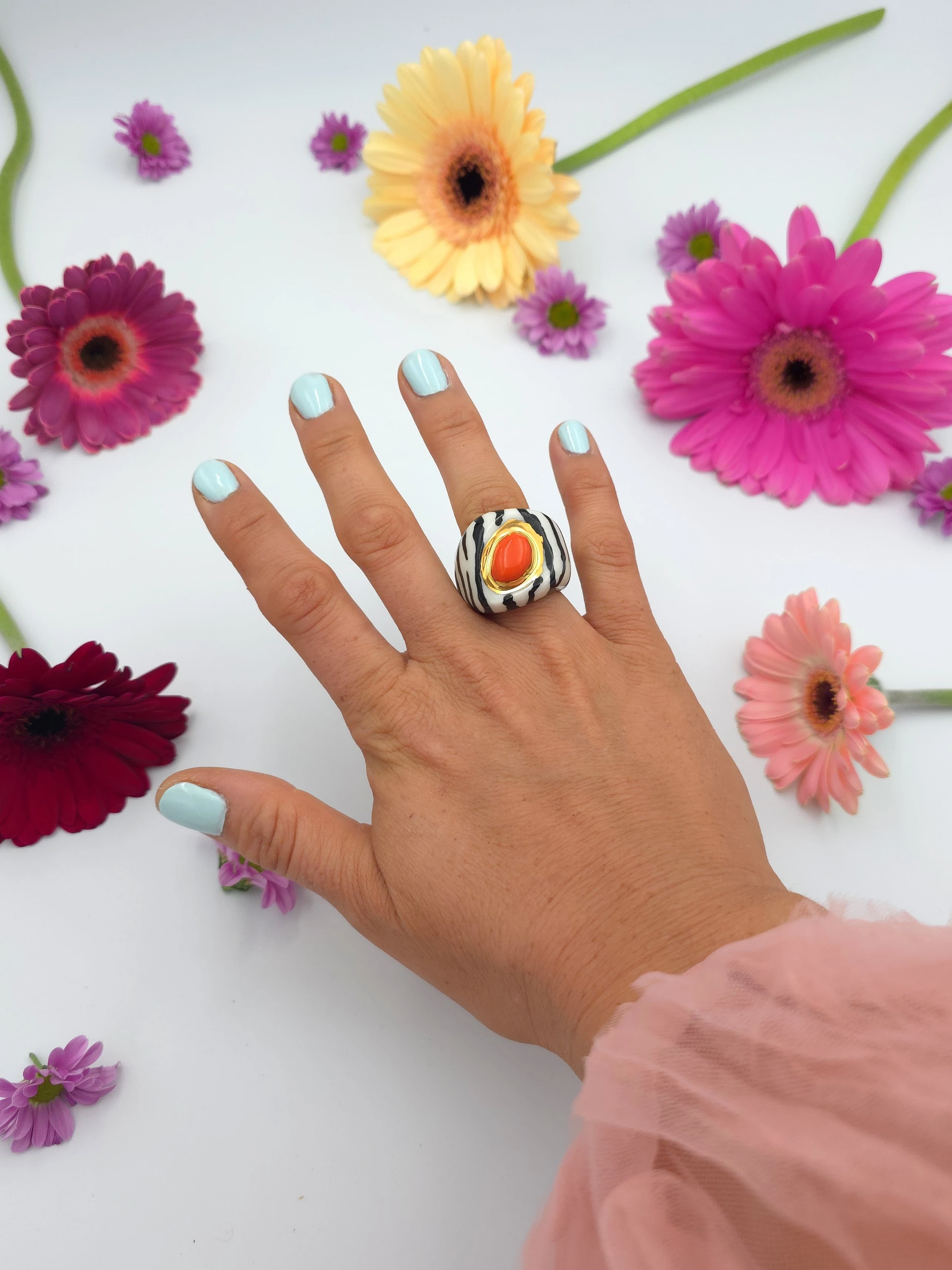 Każdy pierścionek jest ręcznie formowany, malowany i zdobiony. Wszystkie moje prace są starannie wykończone moimi rękami, co sprawia, że nie powstanie drugi taki sam egzemplarz. Pierścionki z porcelany są lekkie i łatwe w noszeniu.