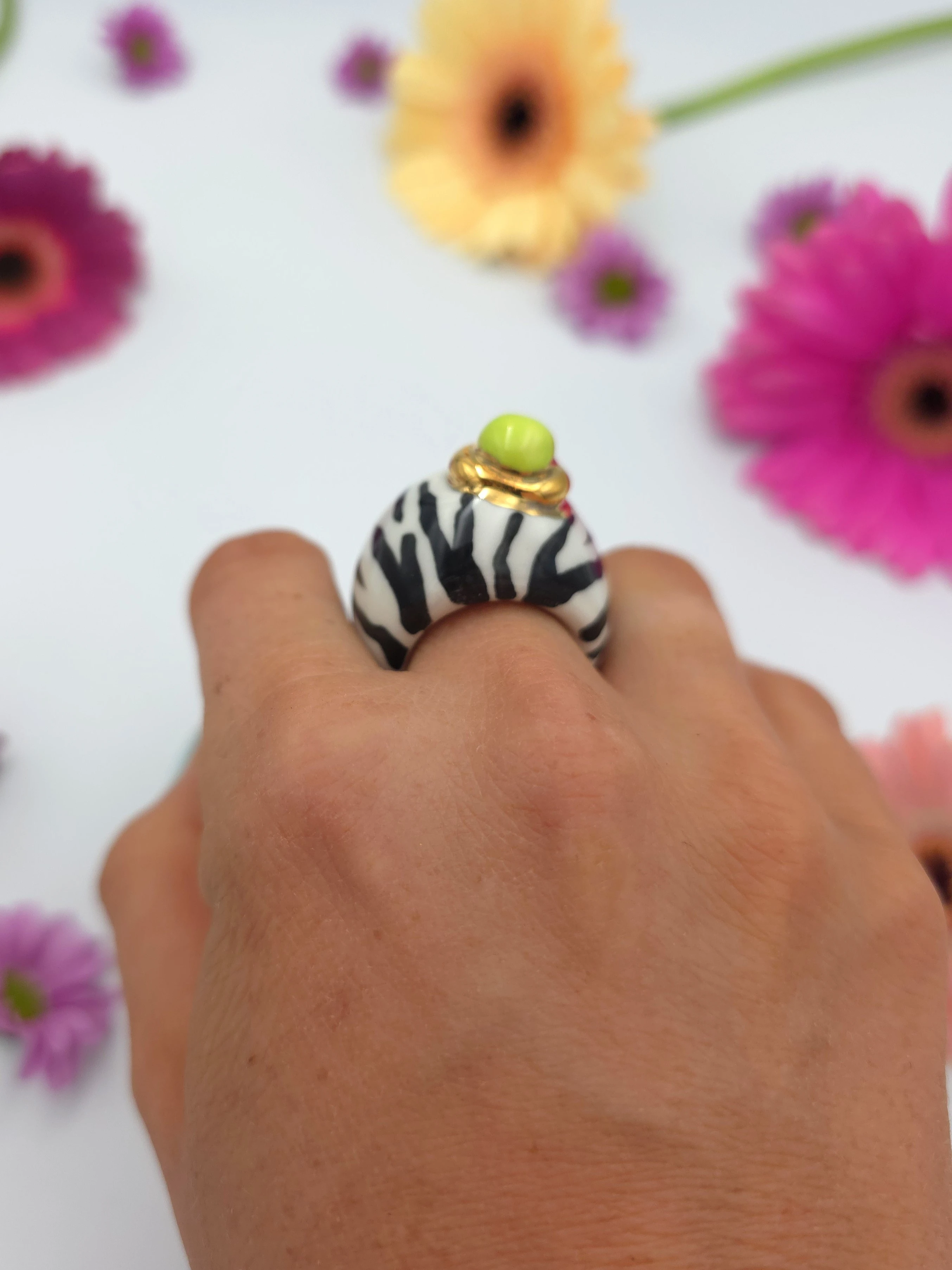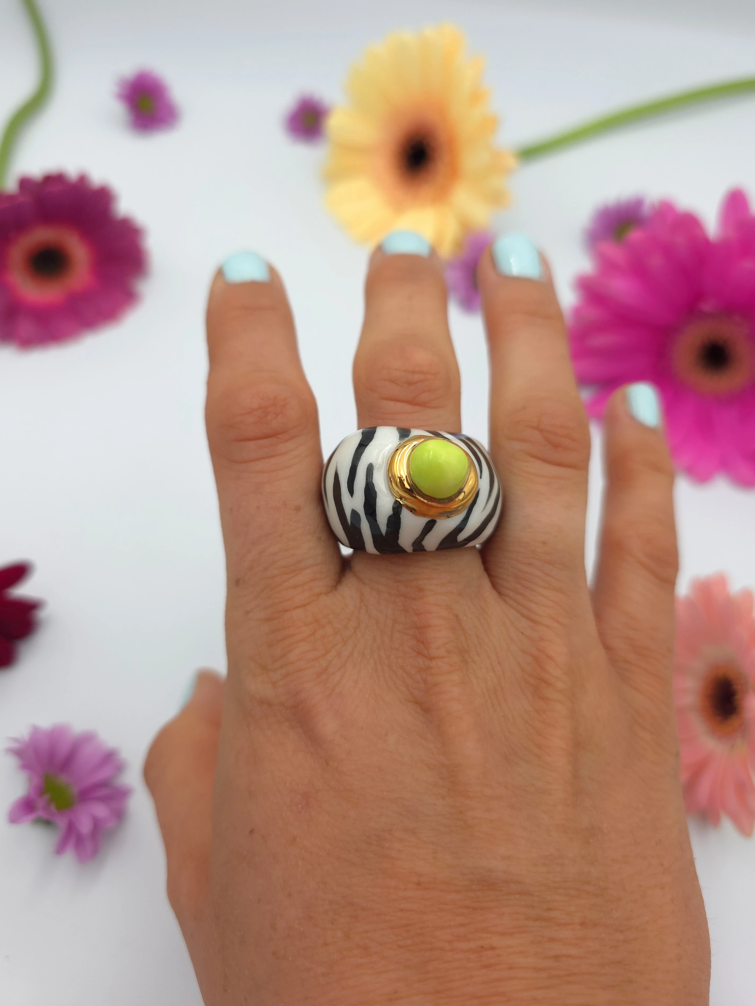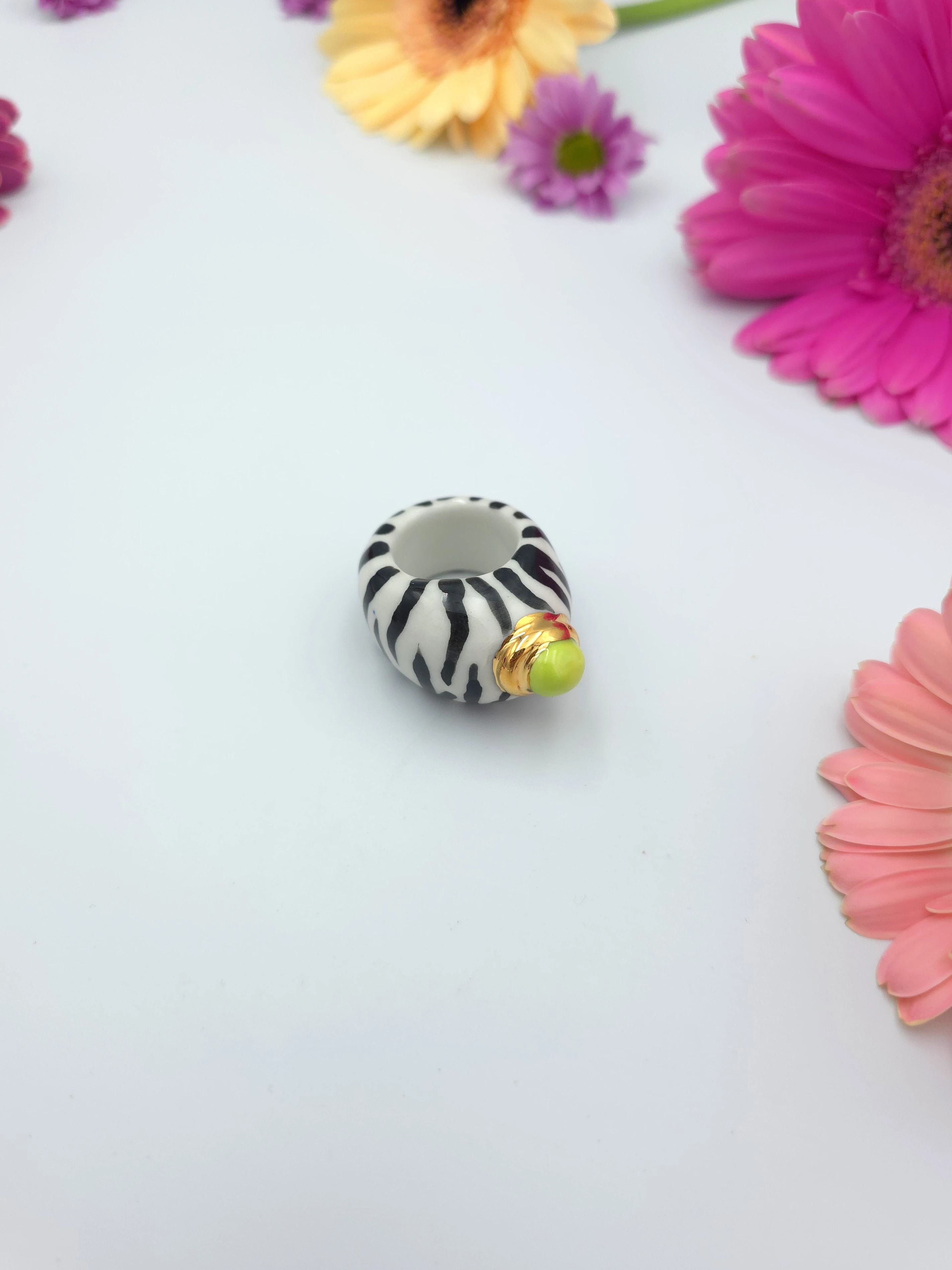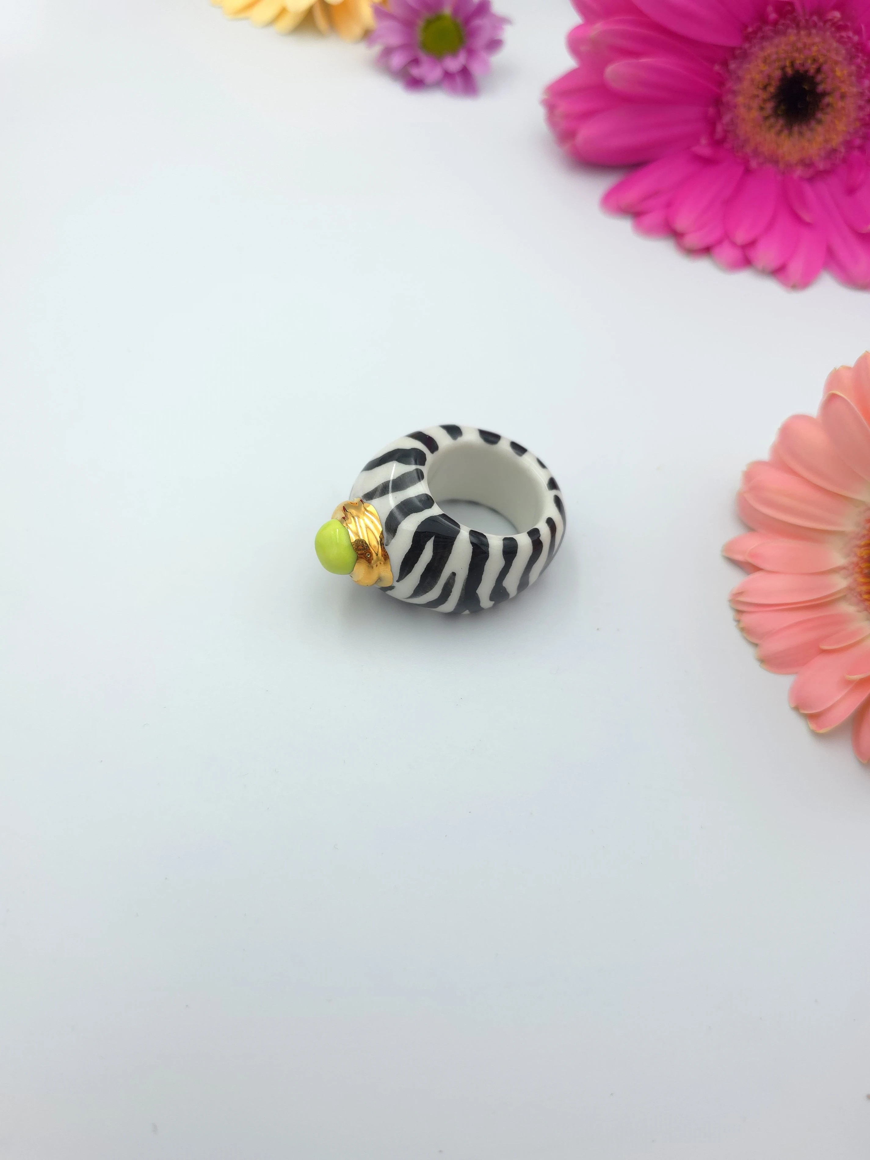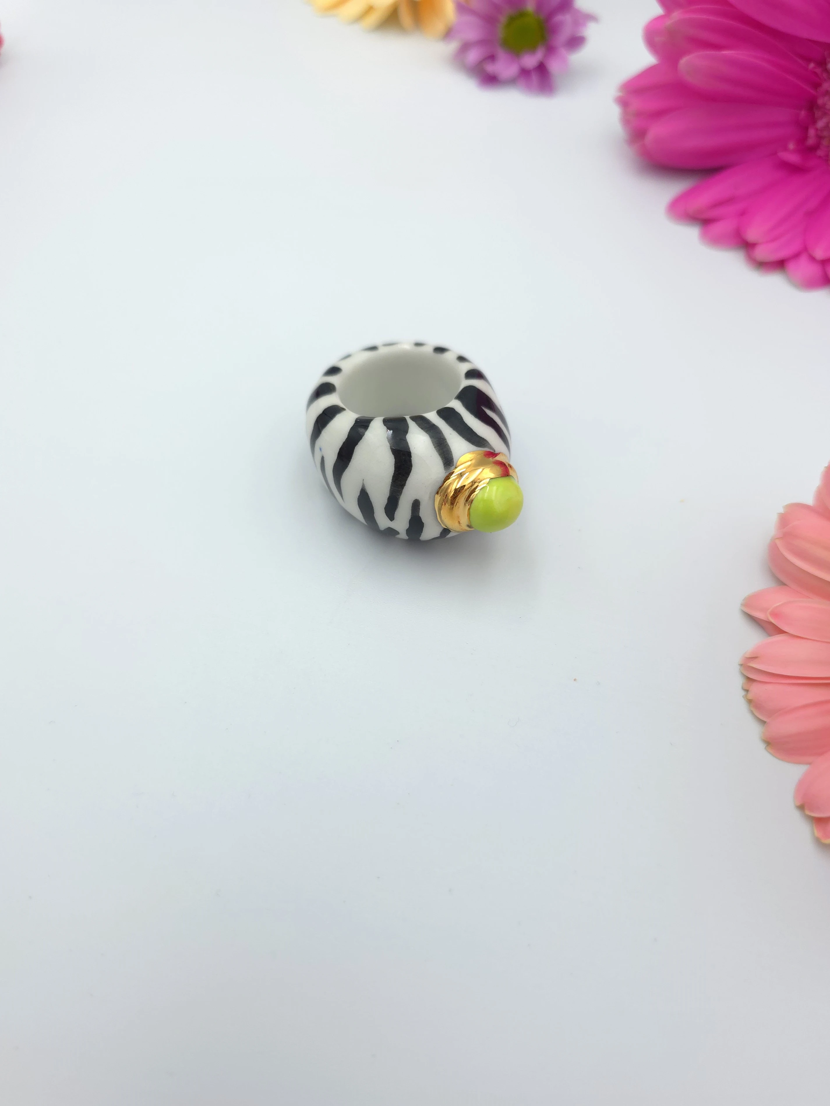 Porcelanowy pierścionek - zebra z żółtą kulką