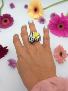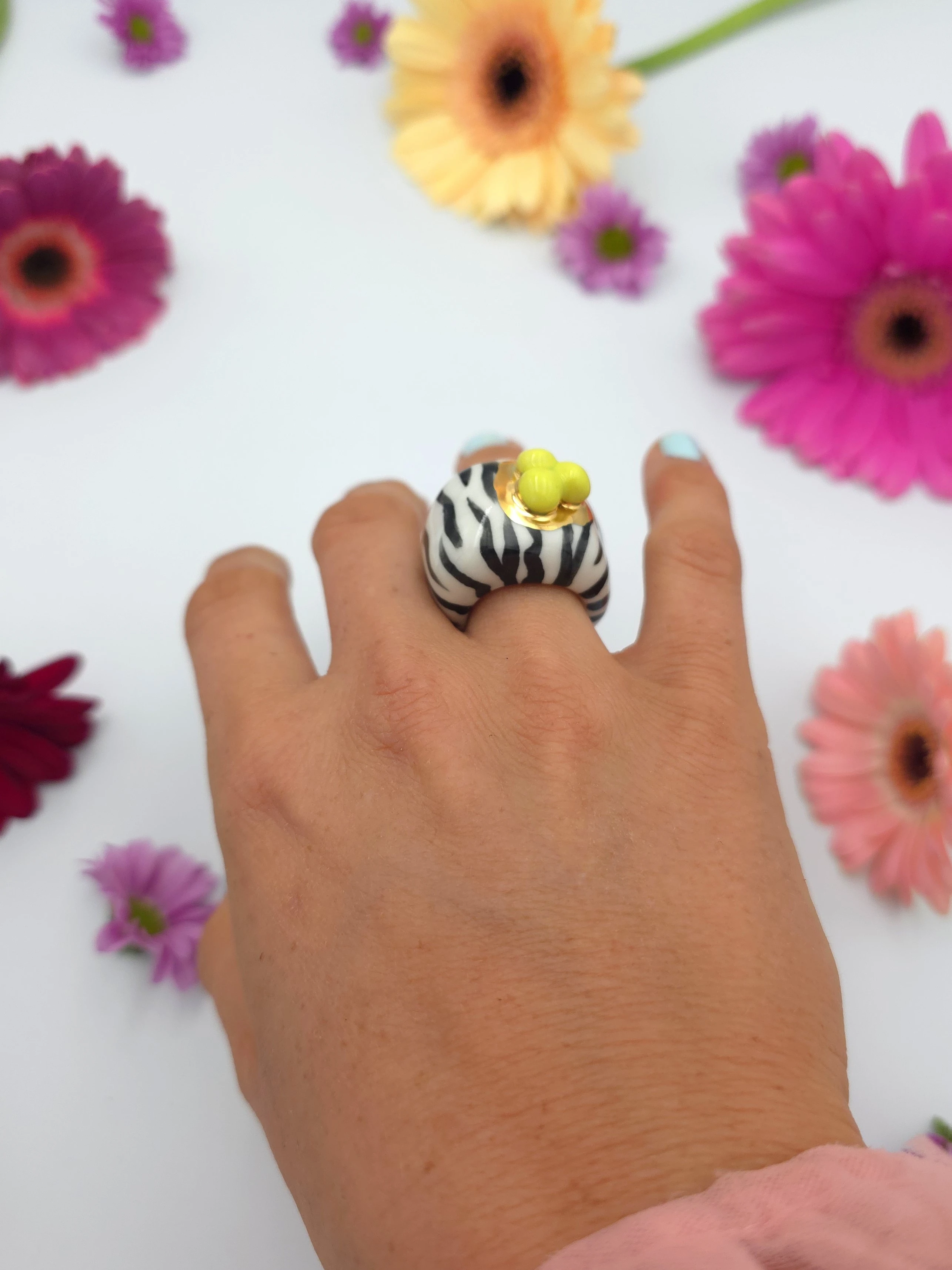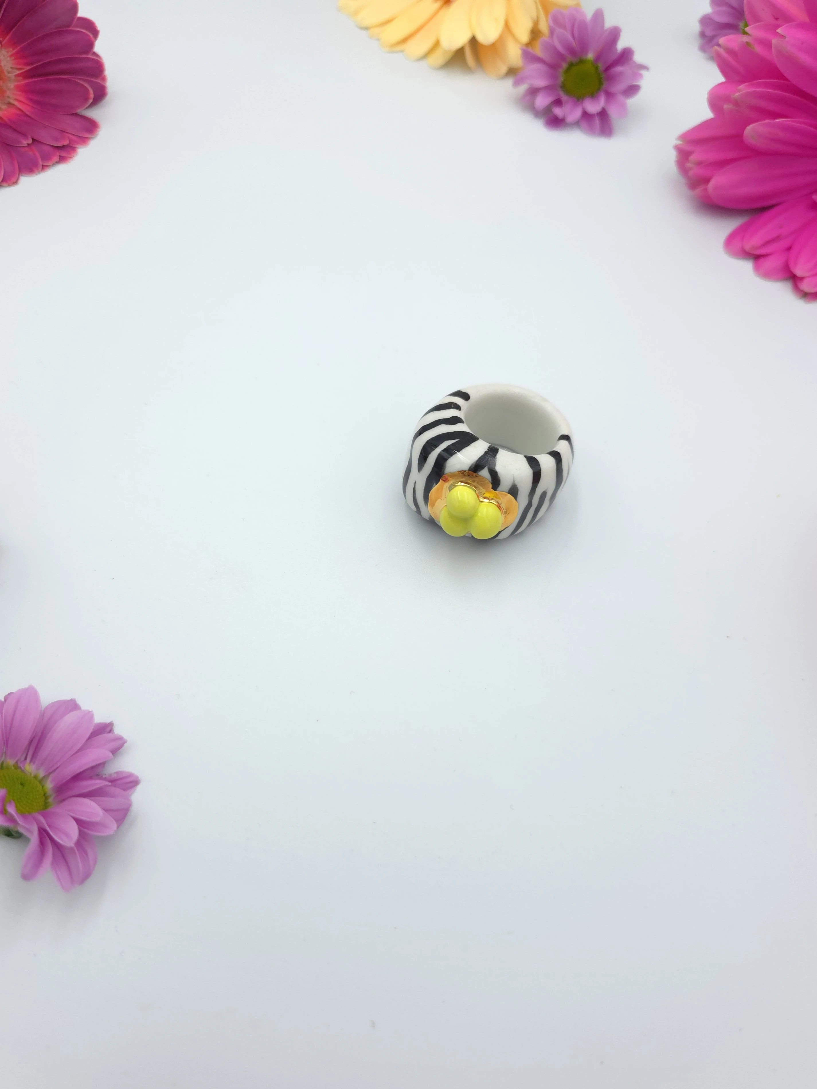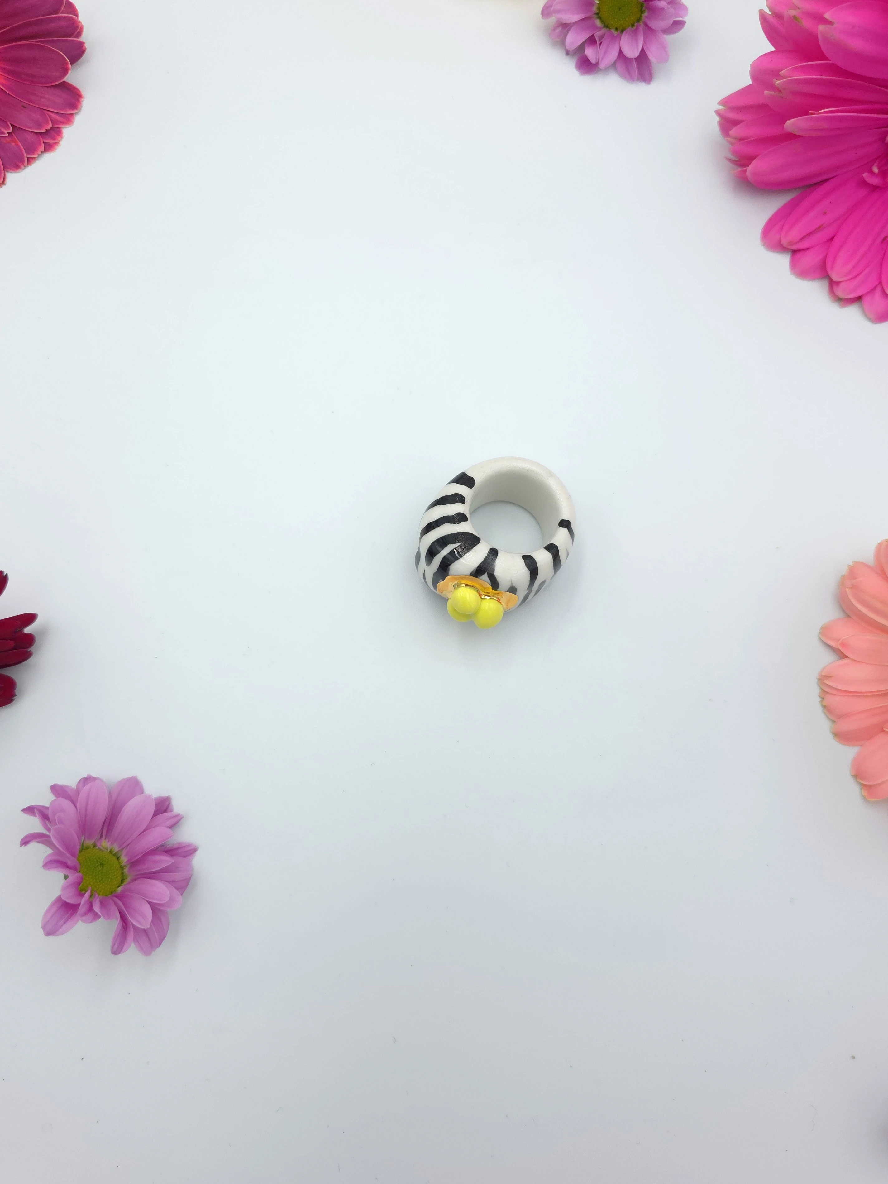 Porcelanowy pierścionek - zebra z żółtymi kulkami