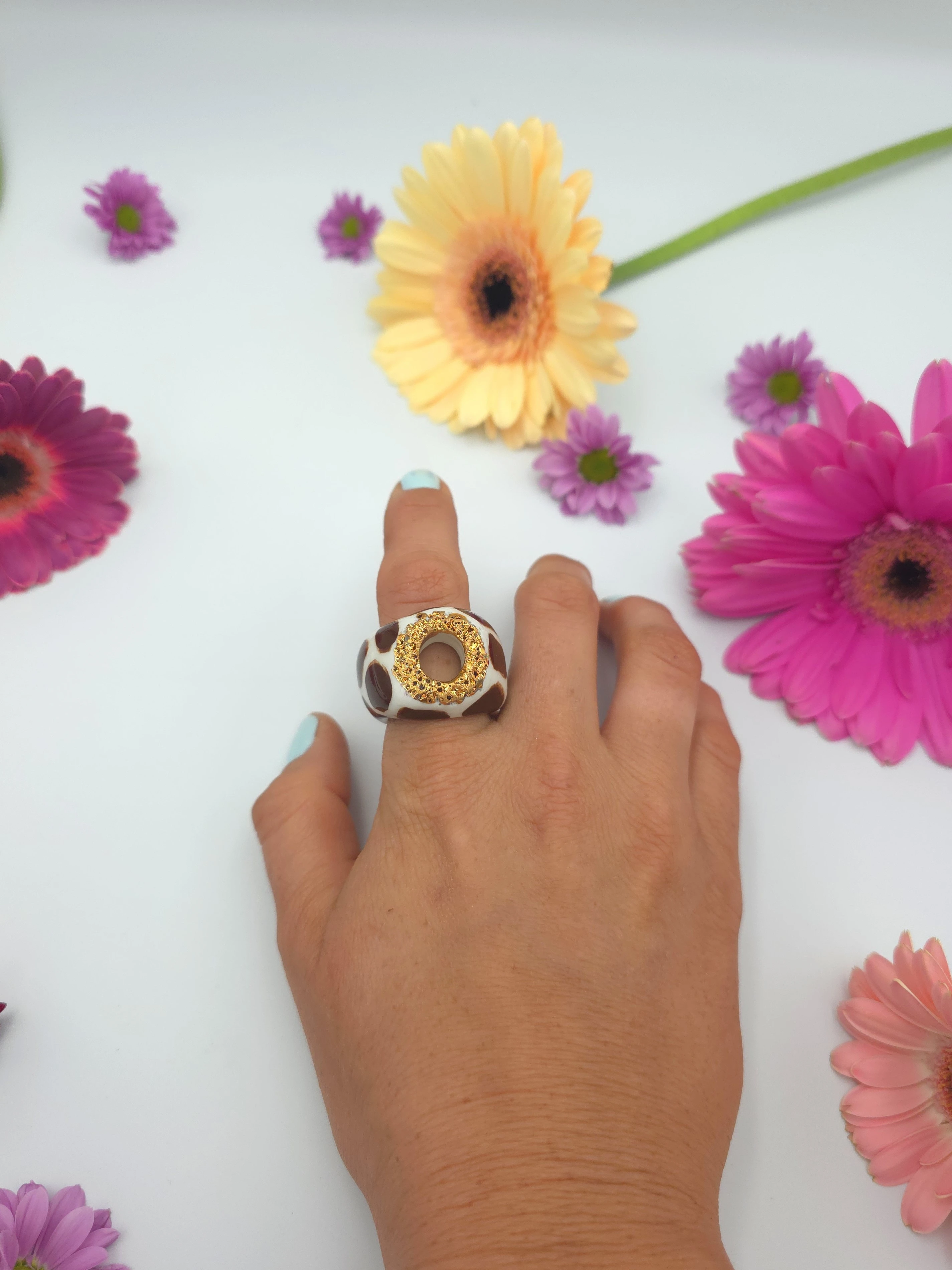 Każdy pierścionek jest ręcznie formowany, malowany i zdobiony. Wszystkie moje prace są starannie wykończone moimi rękami, co sprawia, że nie powstanie drugi taki sam egzemplarz. Pierścionki z porcelany są lekkie i łatwe w noszeniu.