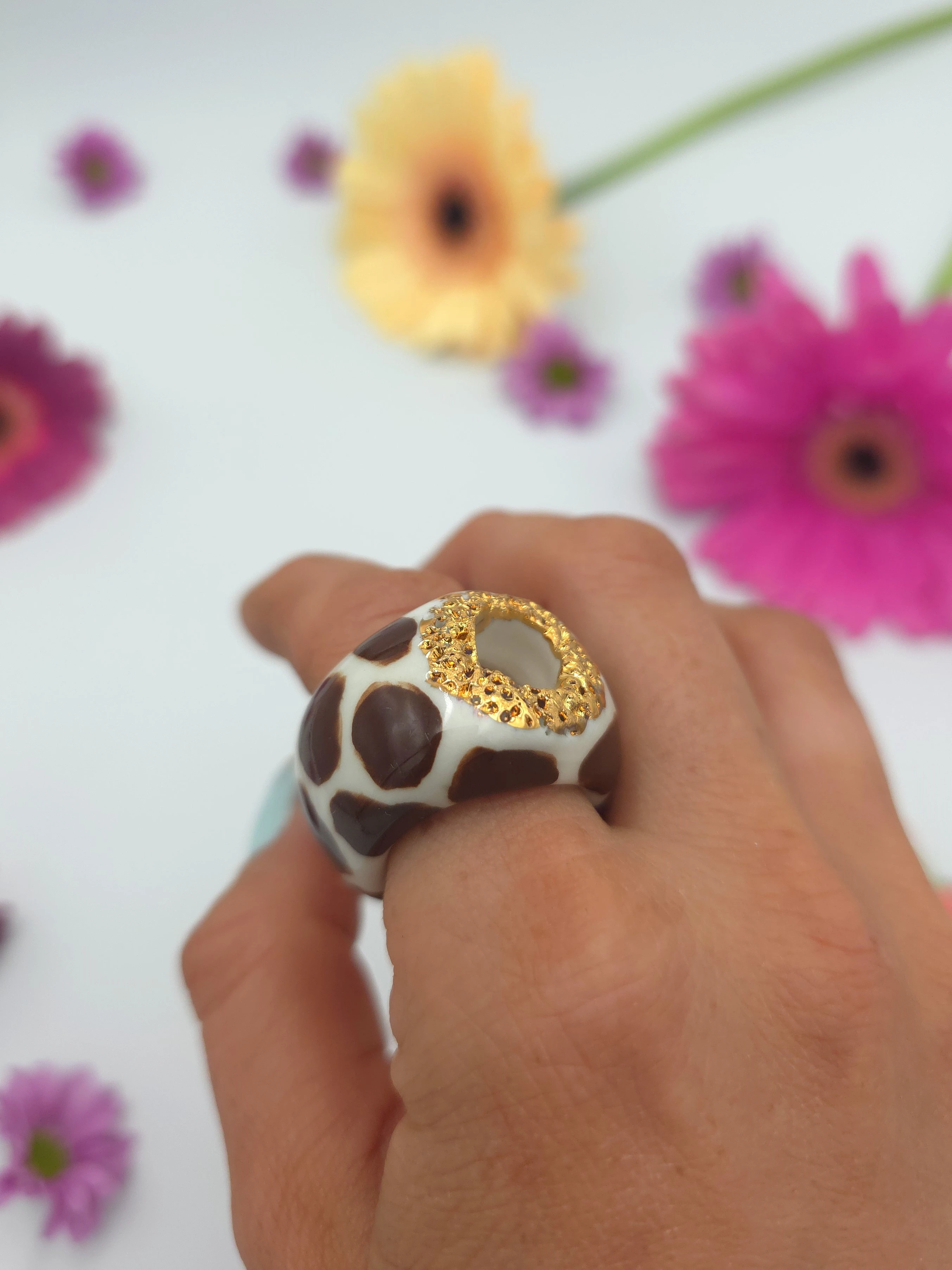 Unikatowy pierścionek z porcelany, zdobiony prawdziwym złotem.
