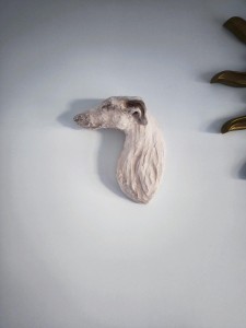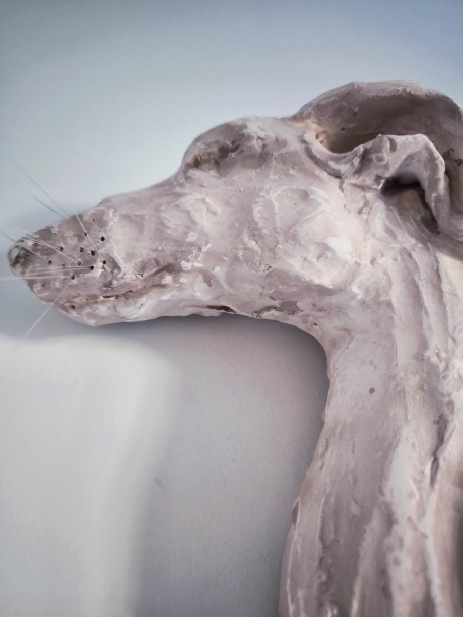 Ręcznie lepiony charcik do powieszenia na ścianę.