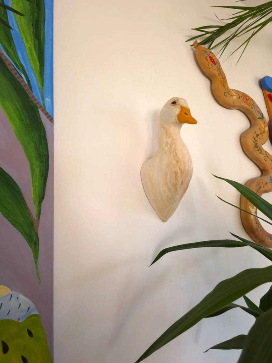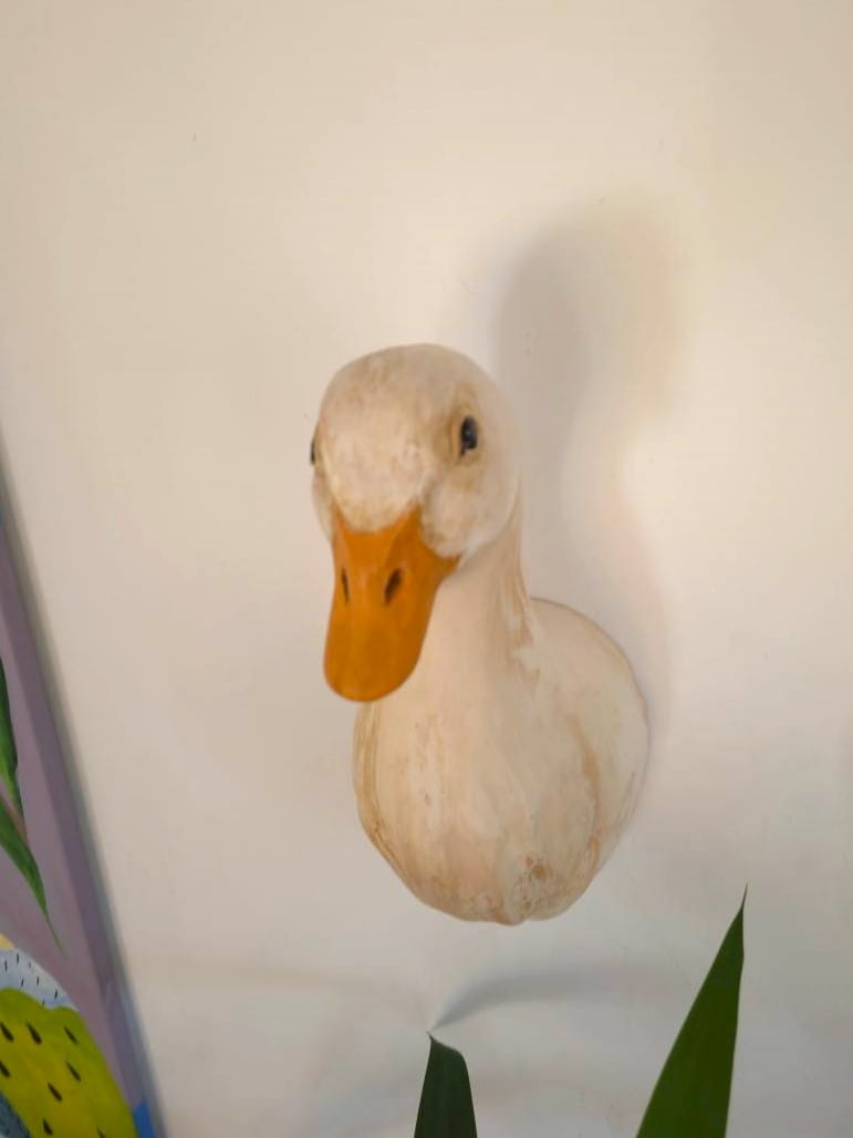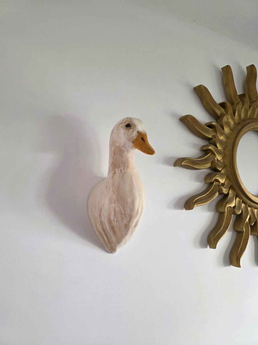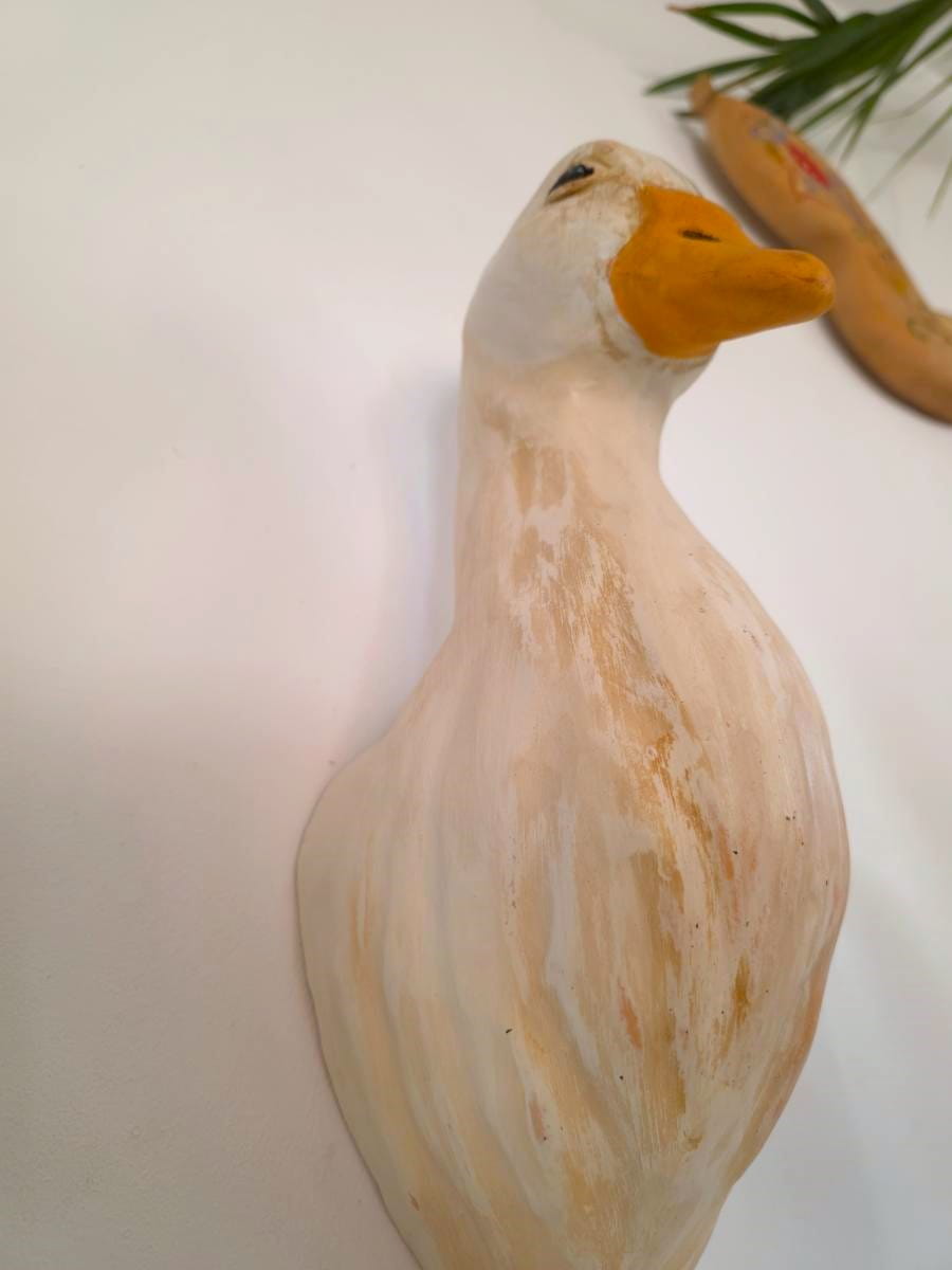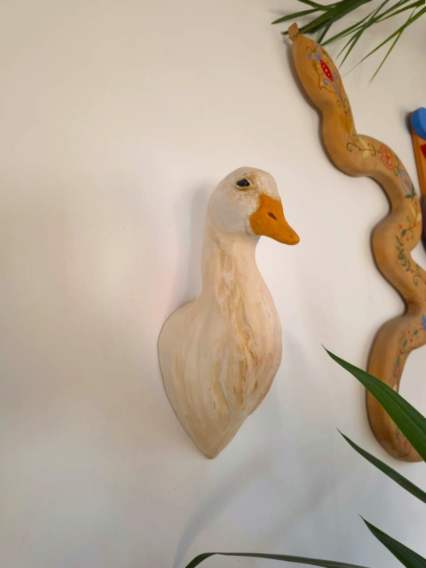 Ręcznie lepiona kaczka do powieszenia na ścianę.