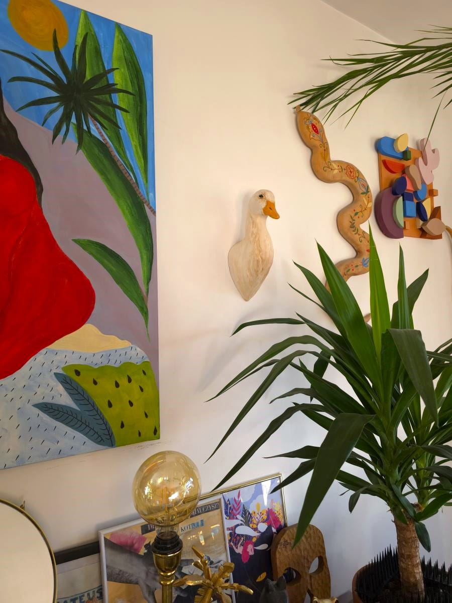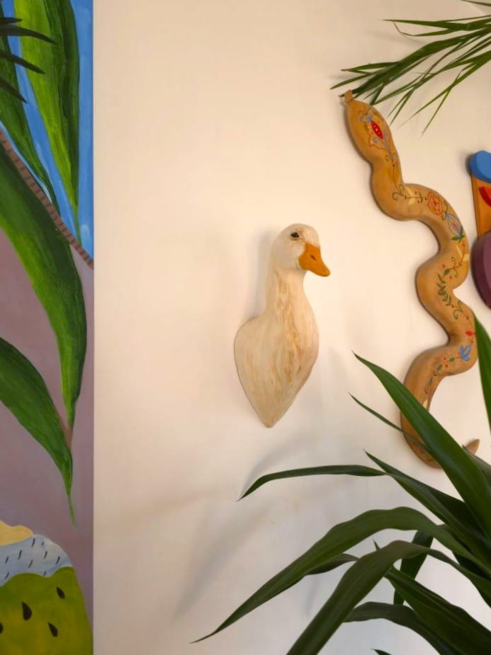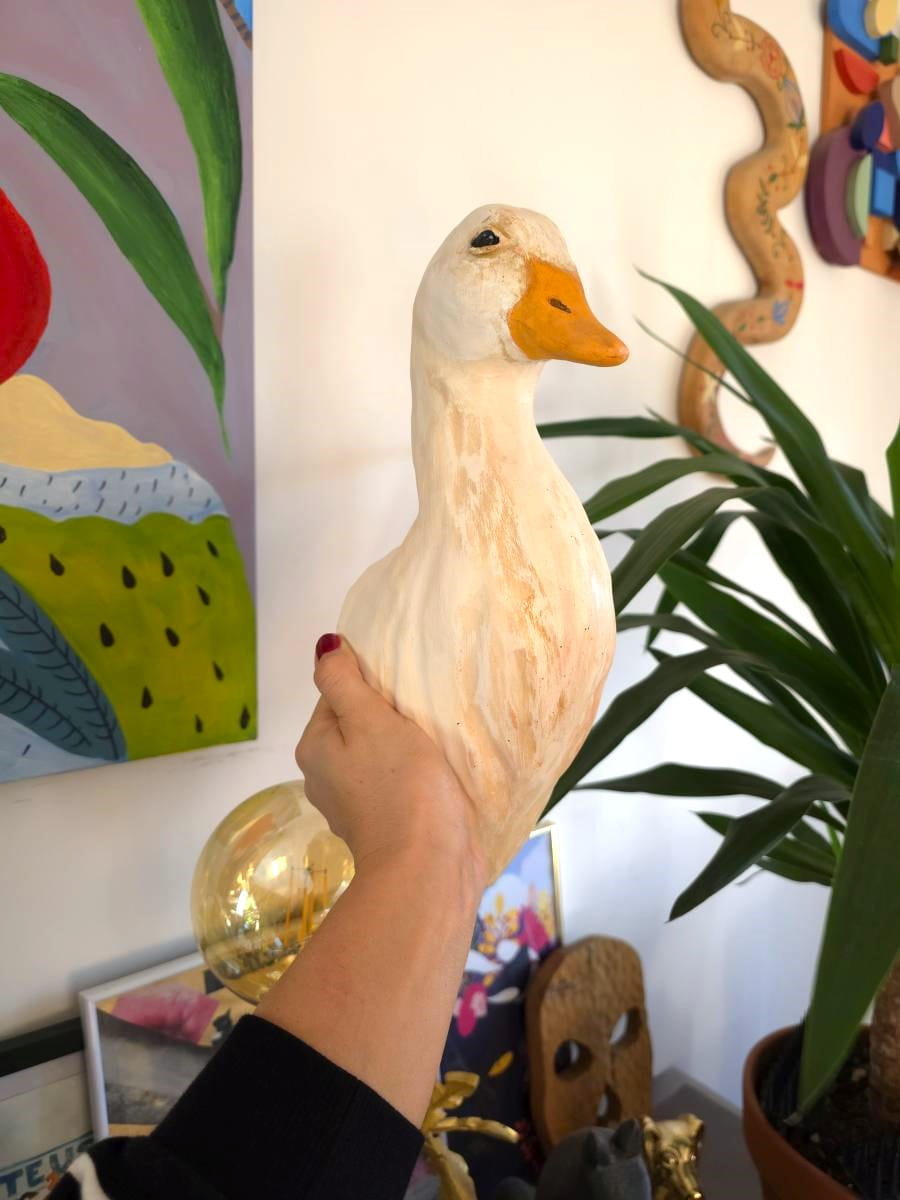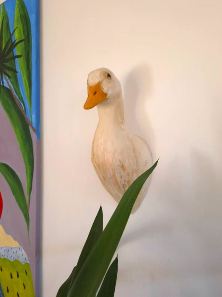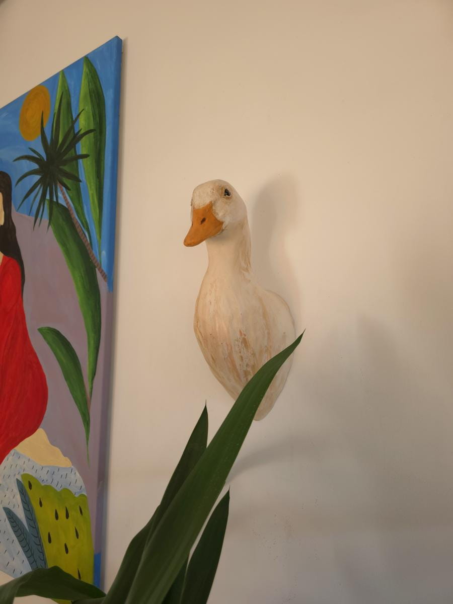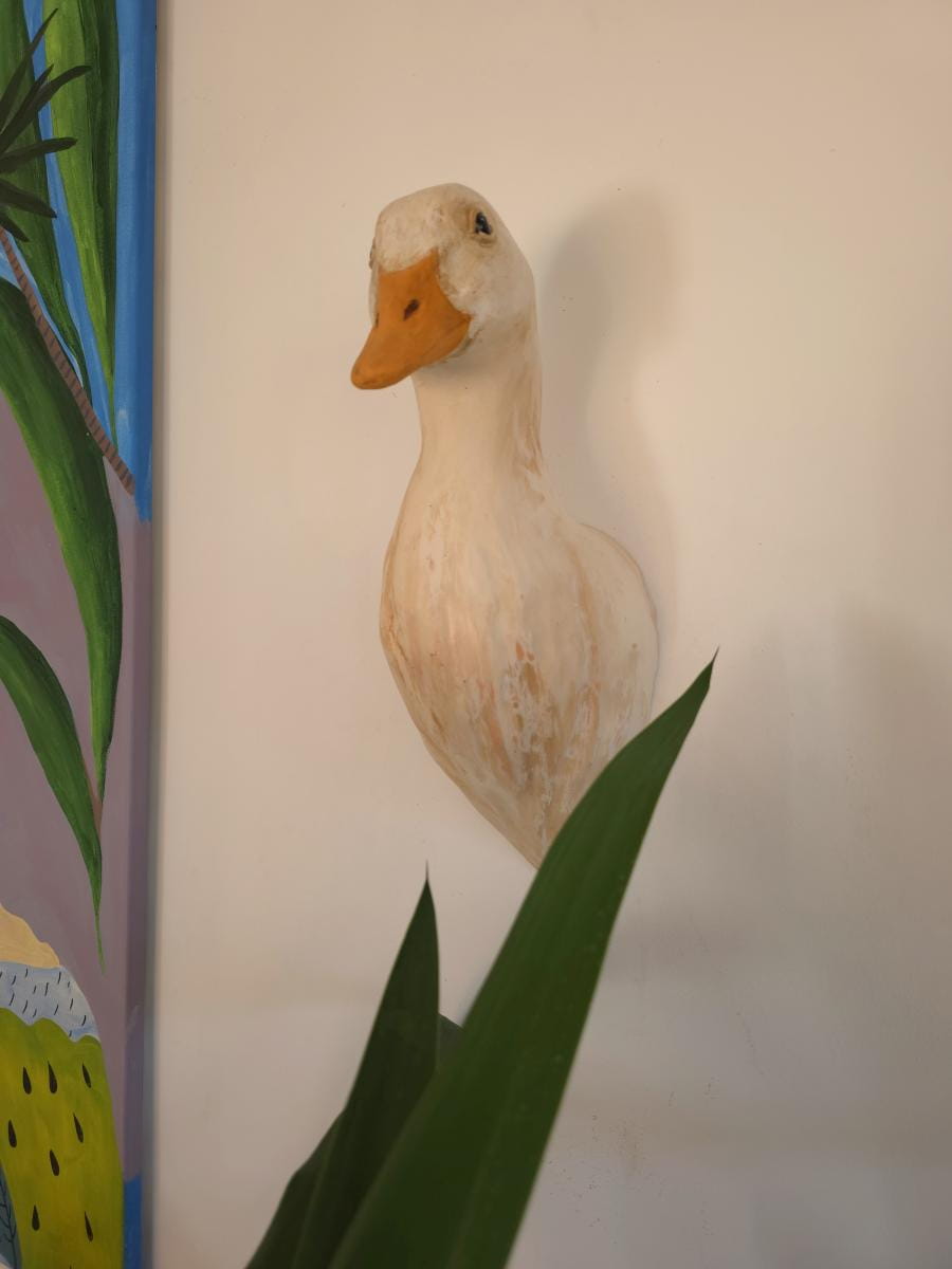 Ręcznie lepiona kaczka do powieszenia na ścianę.
